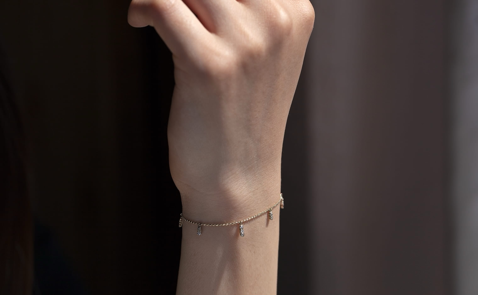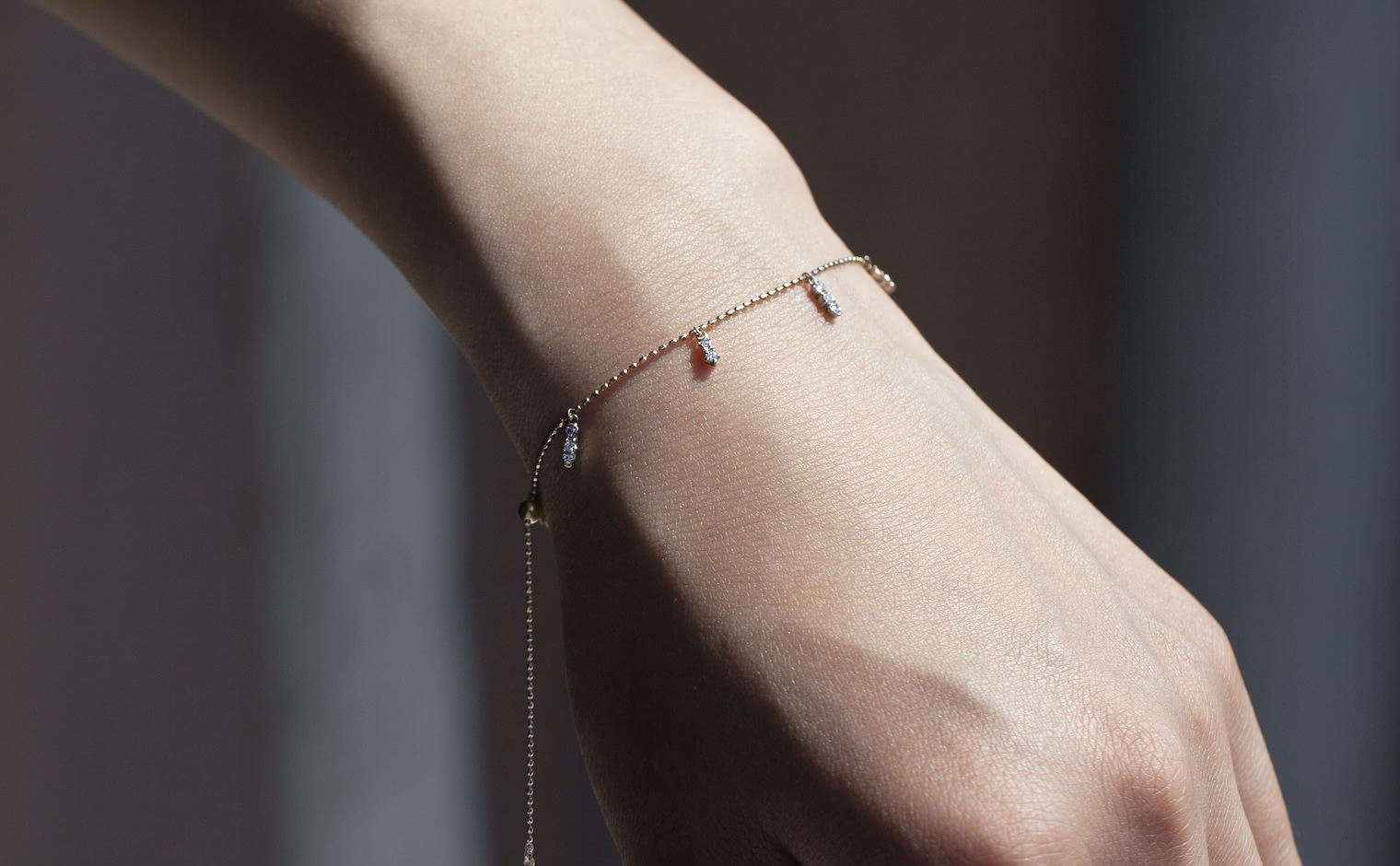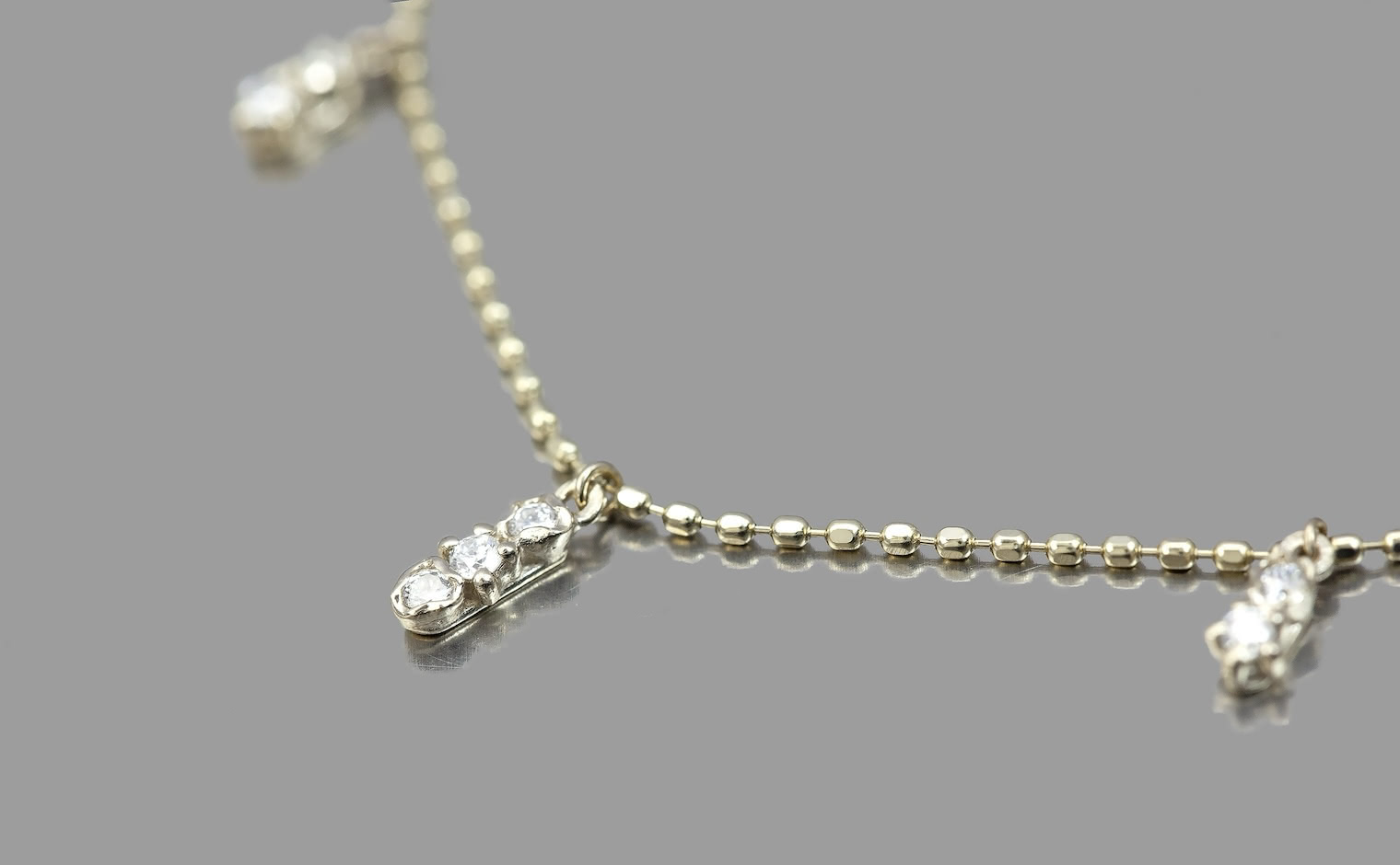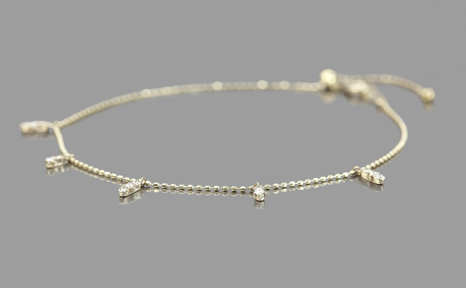 Suspended from this chain, five drops of graduating diamonds swing freely in settings of gold to sparkle with your every move.