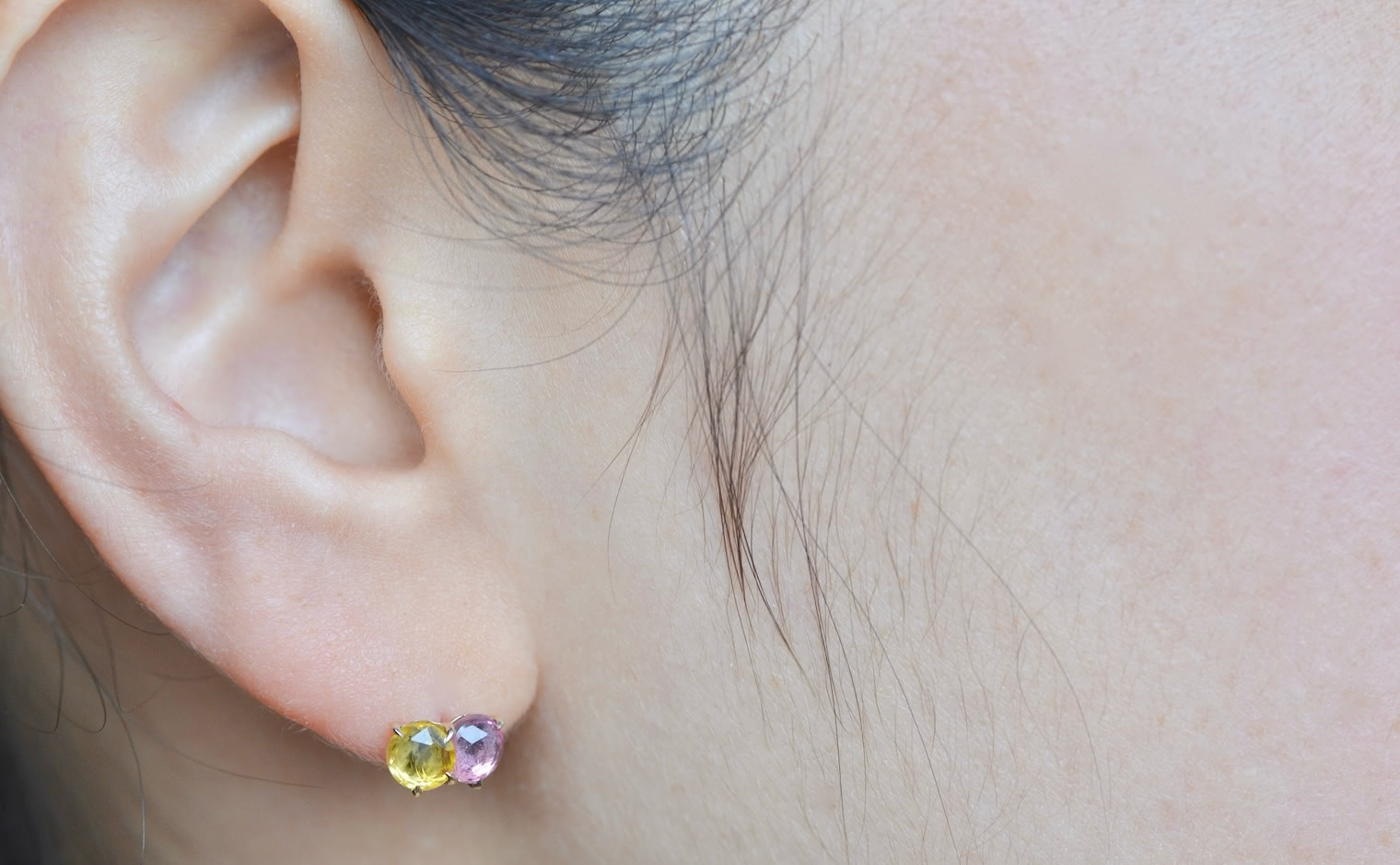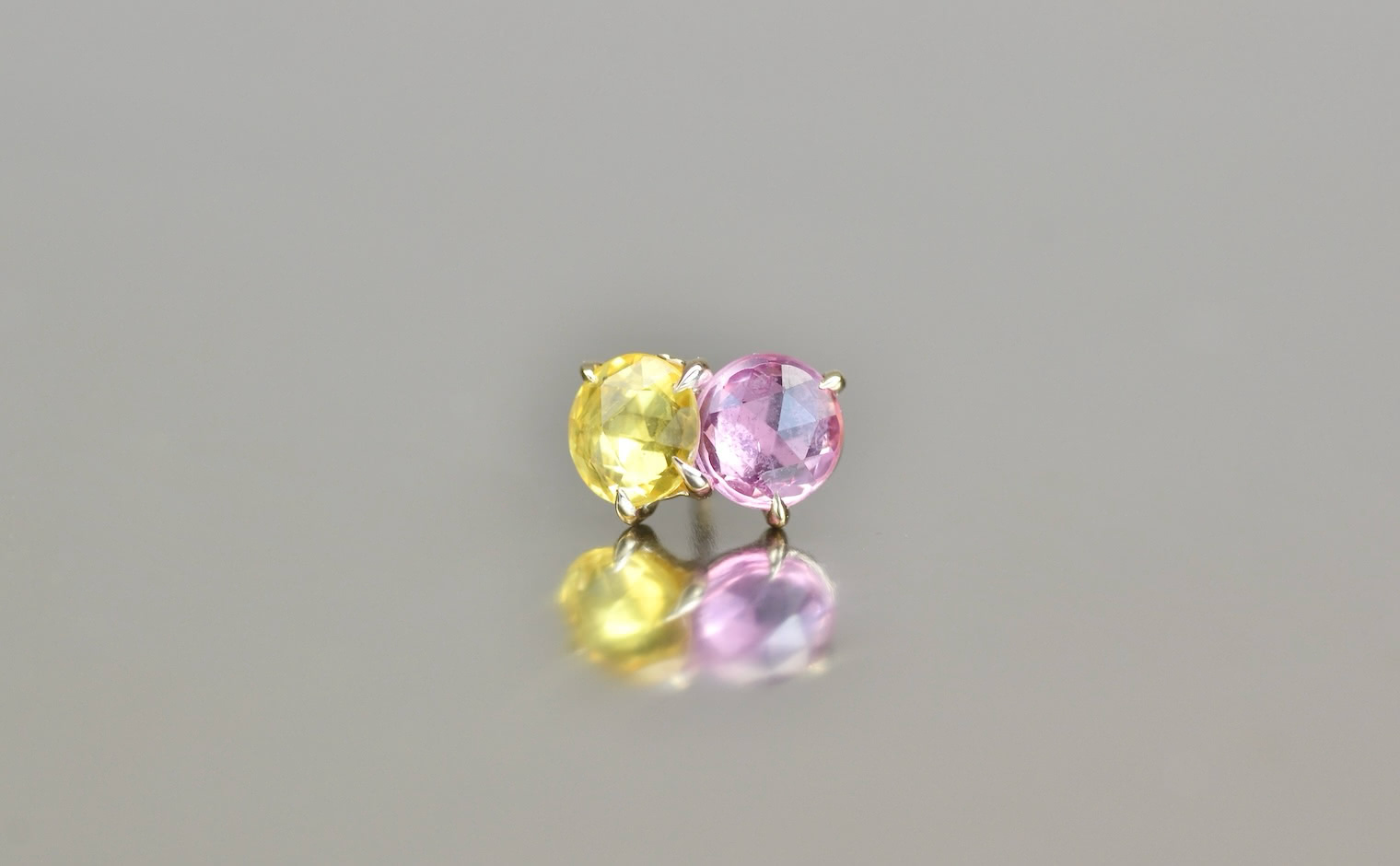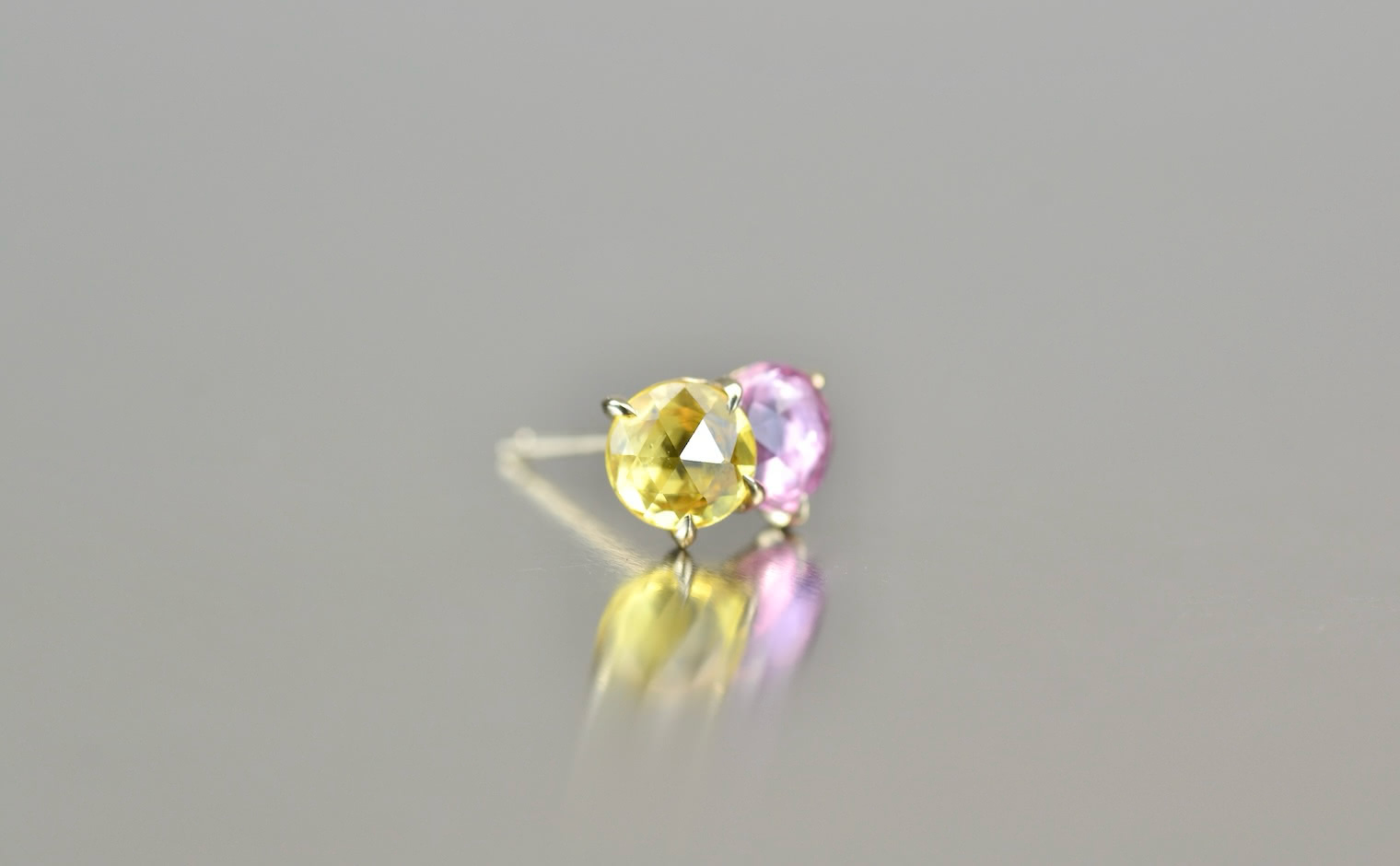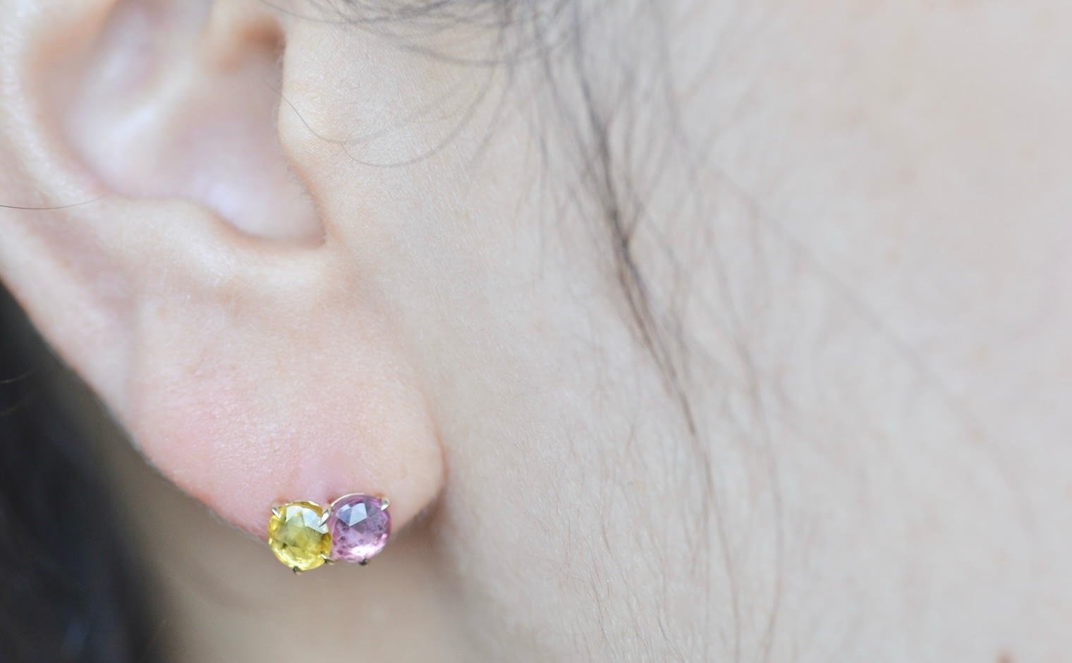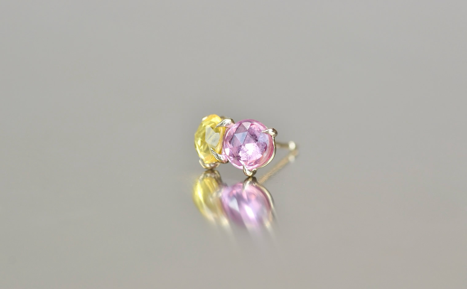 The delicate pink and cheerful yellow compliment each other in a custom-made setting of beige gold, creating the perfect addition to any earring collection. -