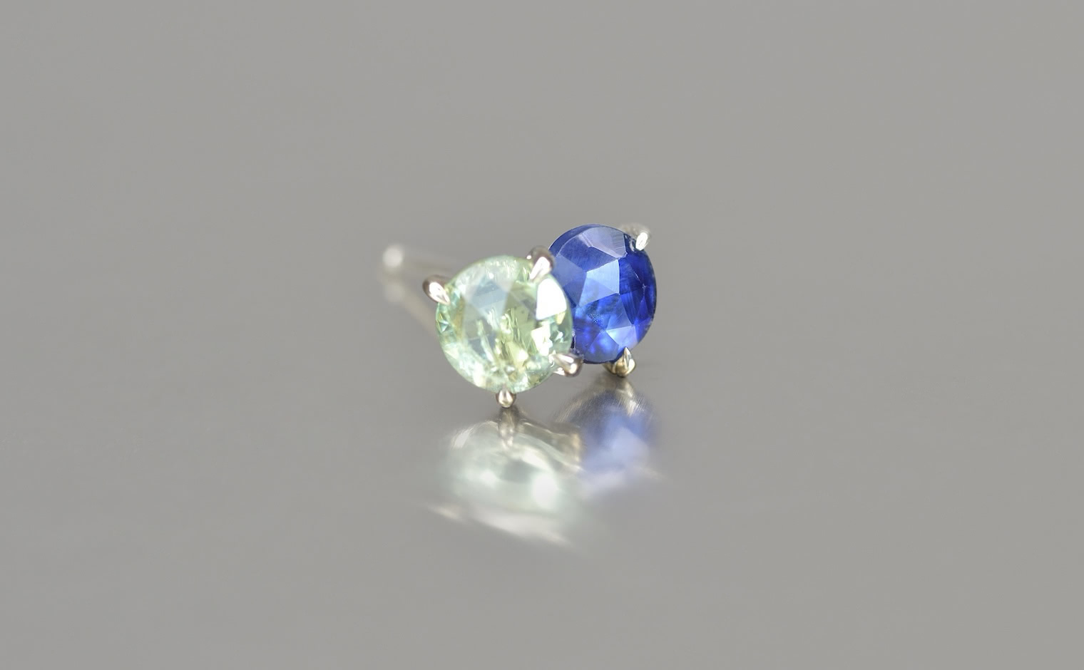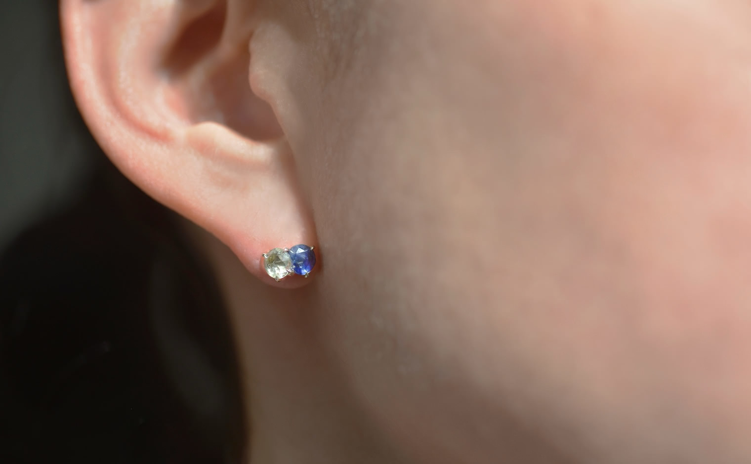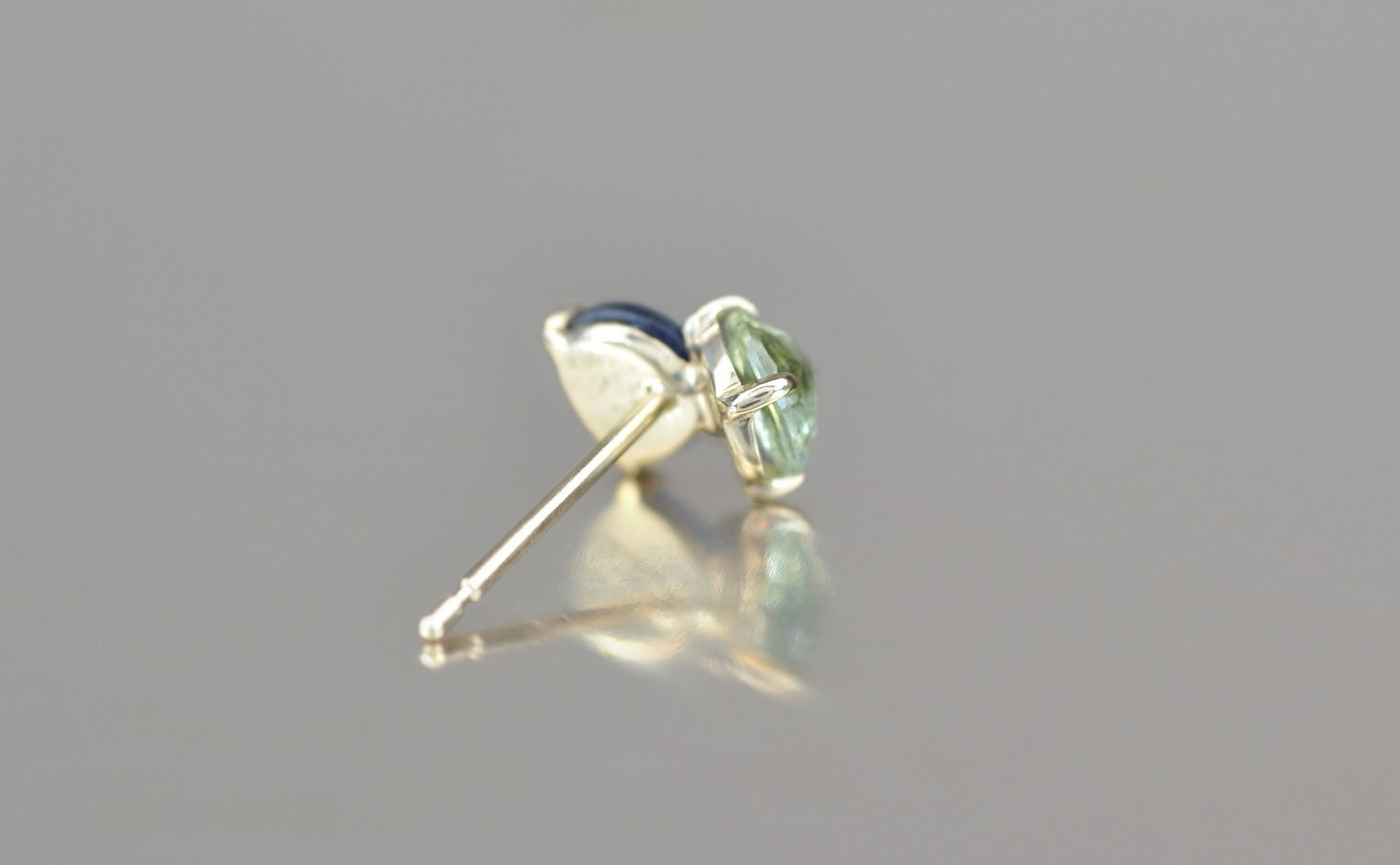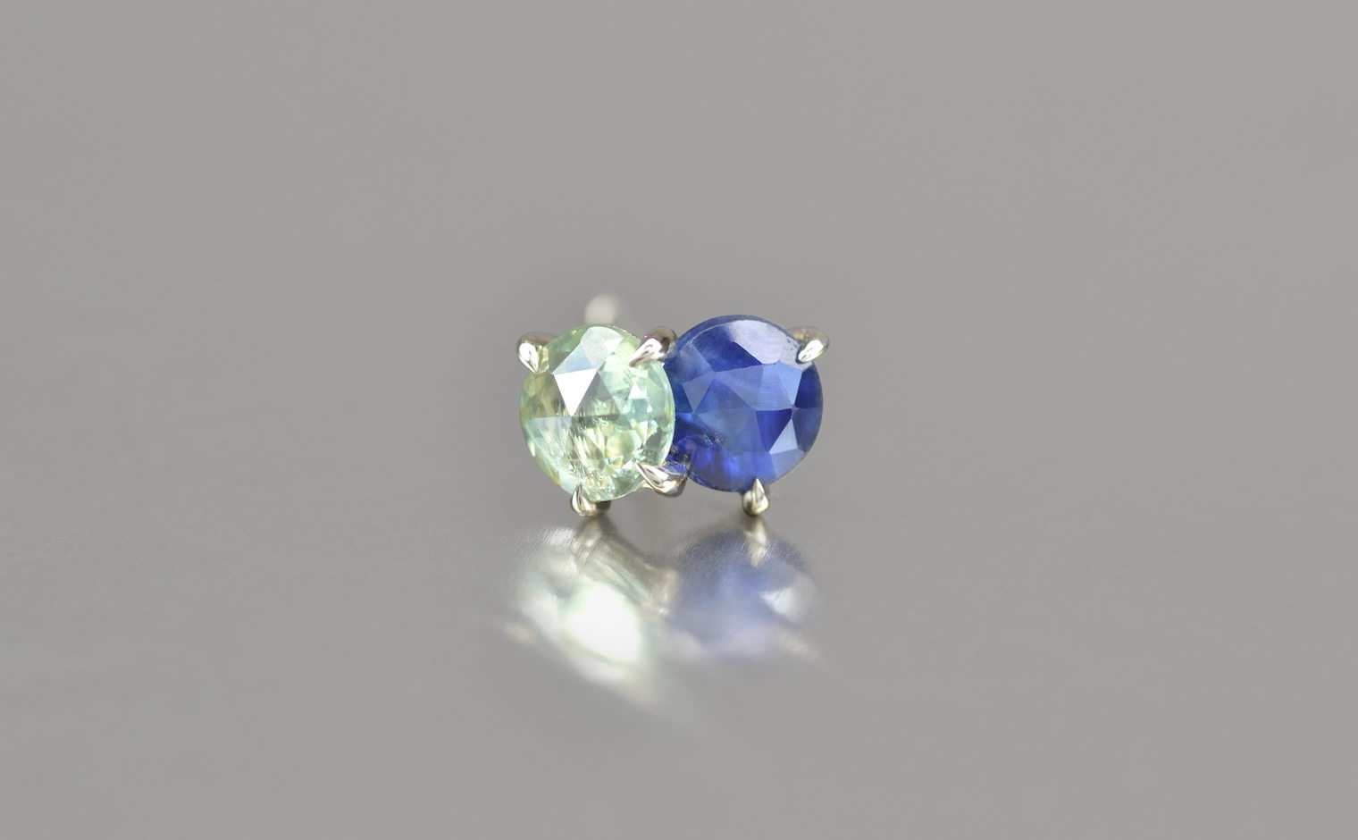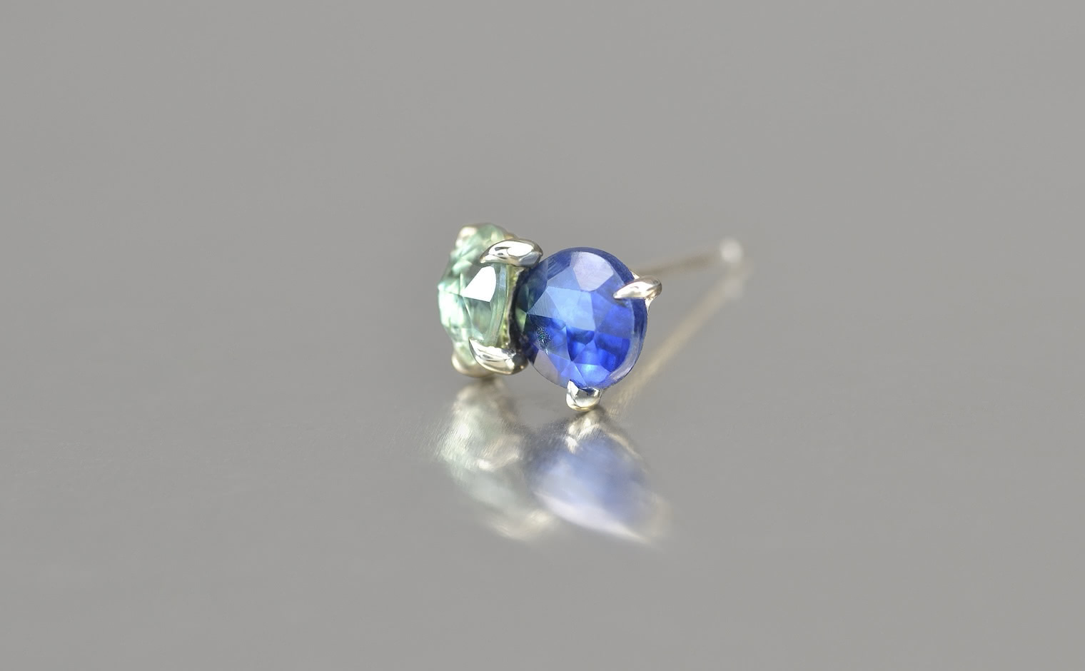 A single stud of bright, custom-blended gold features two beautiful sapphires nestled close together. Creating a unique balance, a vibrant blue gem gives a deep and vibrant hue while its companion boasts of a more luminous, lucid color. Delicate, hand-made prongs secure these precious gems without taking away space they need to steal the show. Eye-catching and unforgettable.