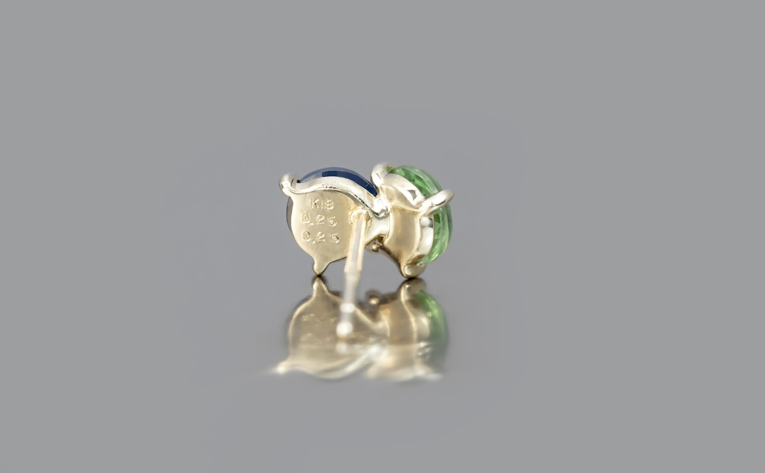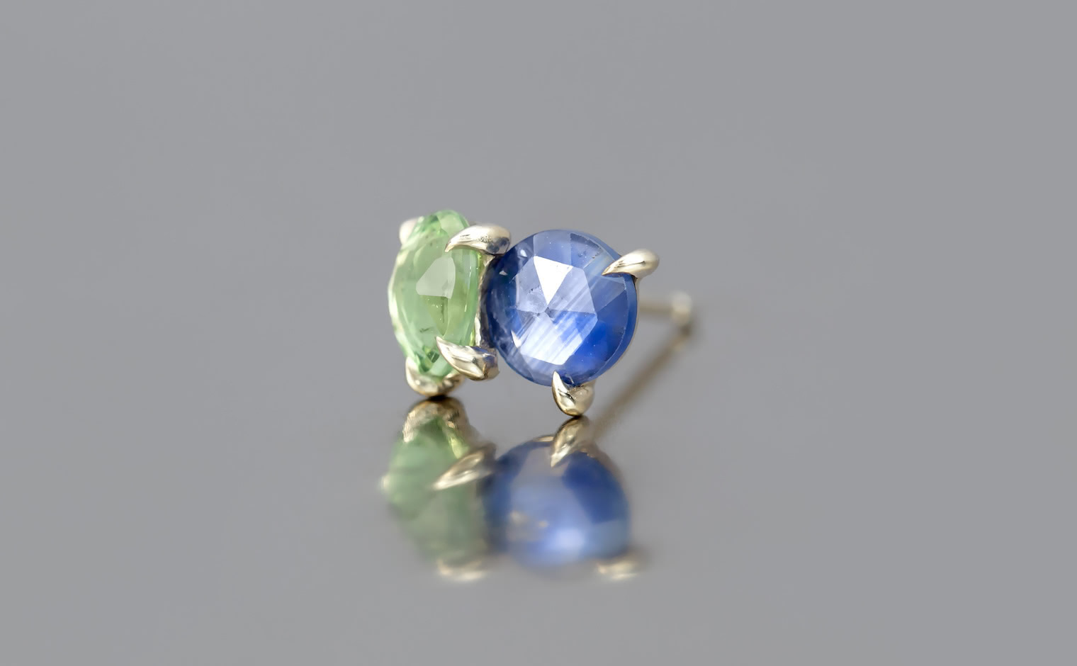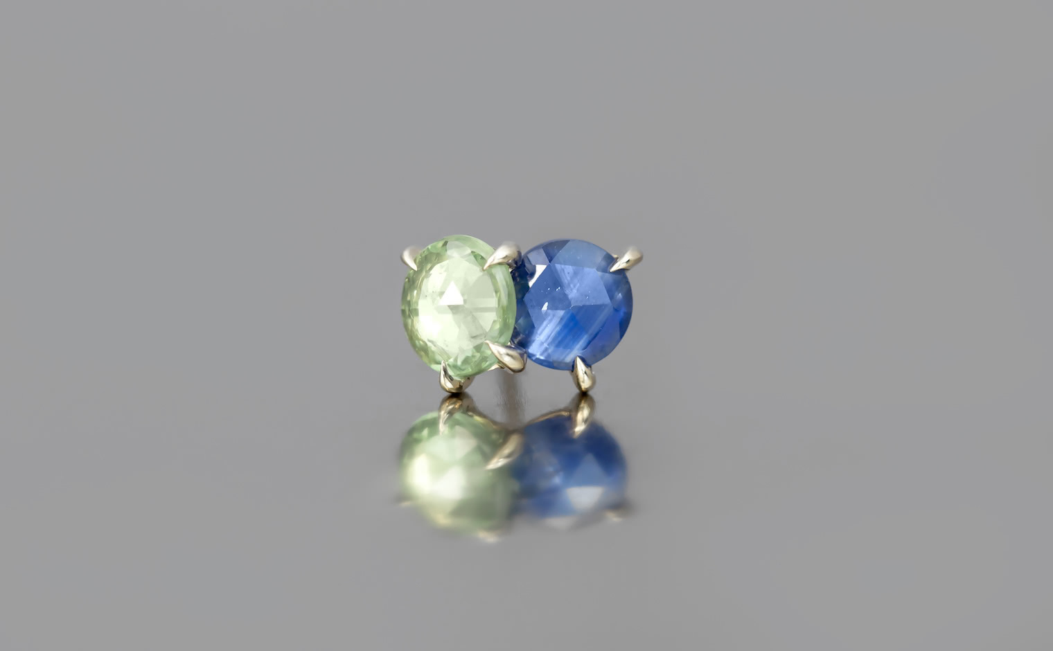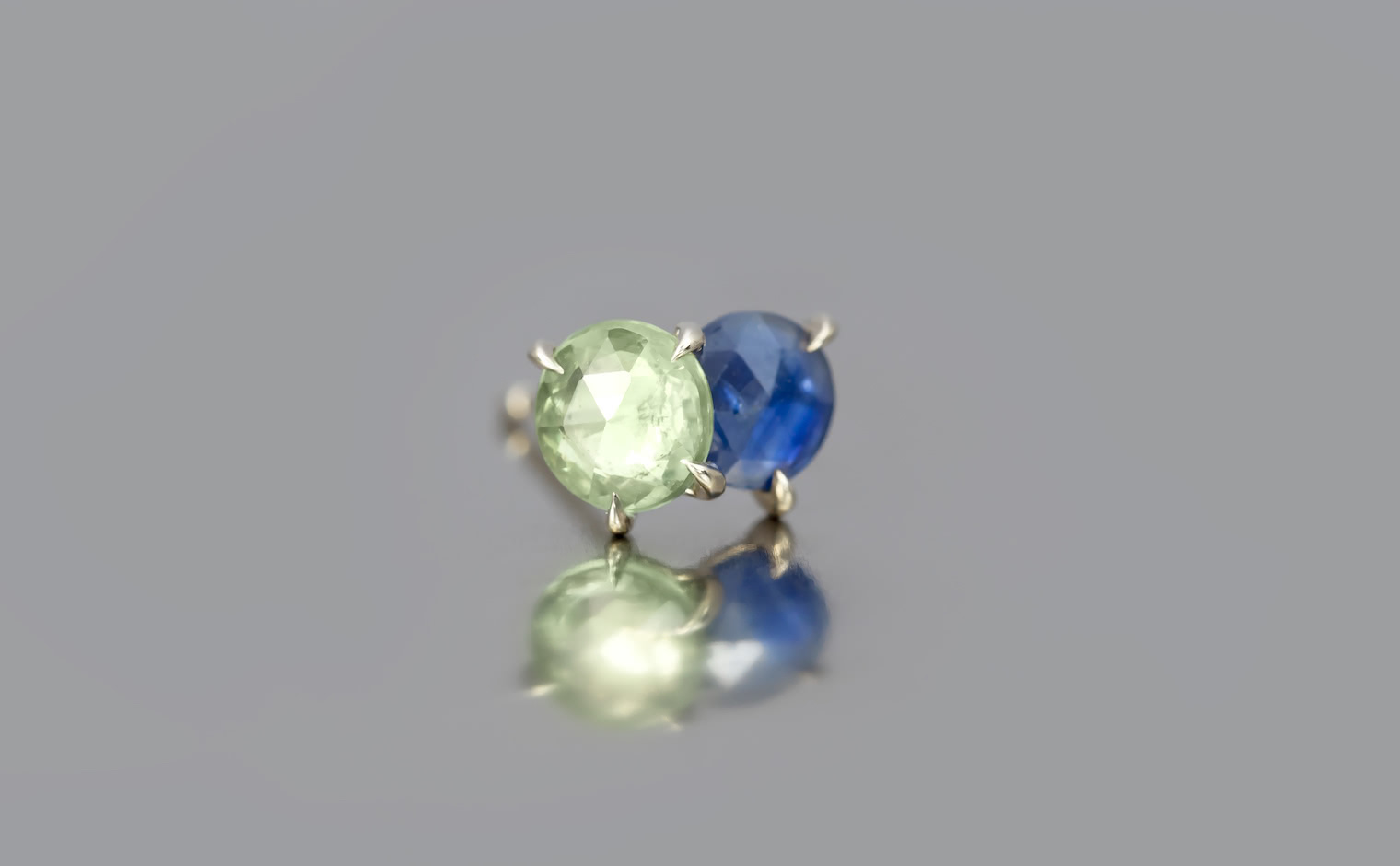 This bright, spring-green sapphire is faceted like the petals of a rose and paired beautifully with a deep blue sapphire nestled next to it.Reflecting light softly off of both surfaces on these precious gems with your every head turn, the colors glow and play off of one another.