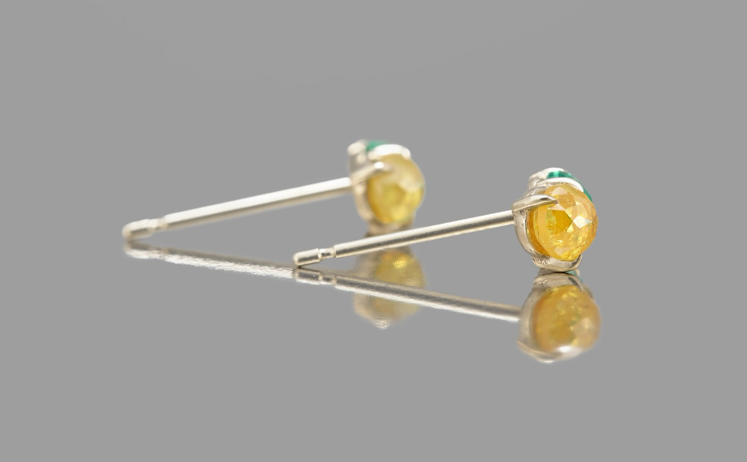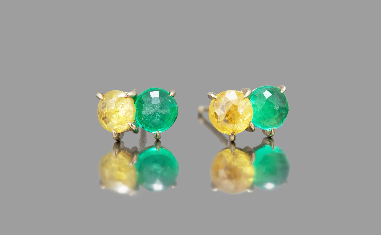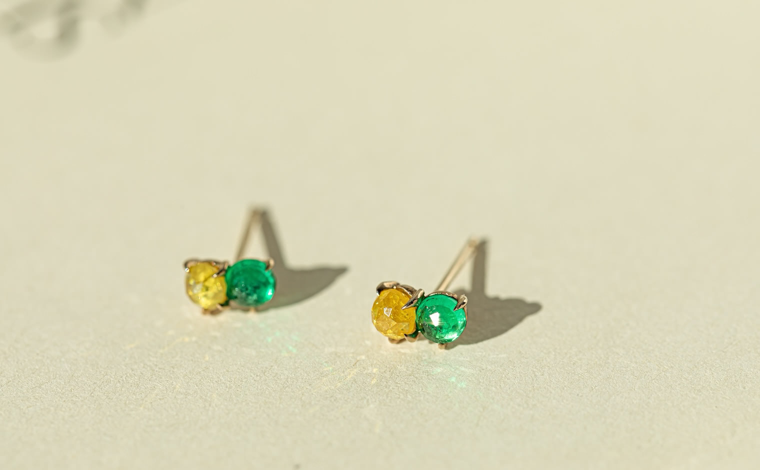 Kismet of simplistic beauty and vibrant elegance. Two-of-a-kind alluring stones in one masterful creation. With their breathtaking, striking emerald green gemstones paired with the brightest of yellow diamonds slightly overlapping against each other on a delicate Beige gold Calyx Setting, the Calyx Studs-Diamond & Emerald delight both the vividly bold and the classically sophisticated.