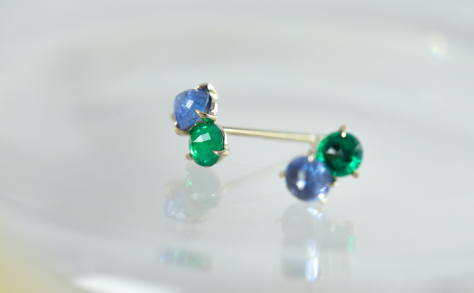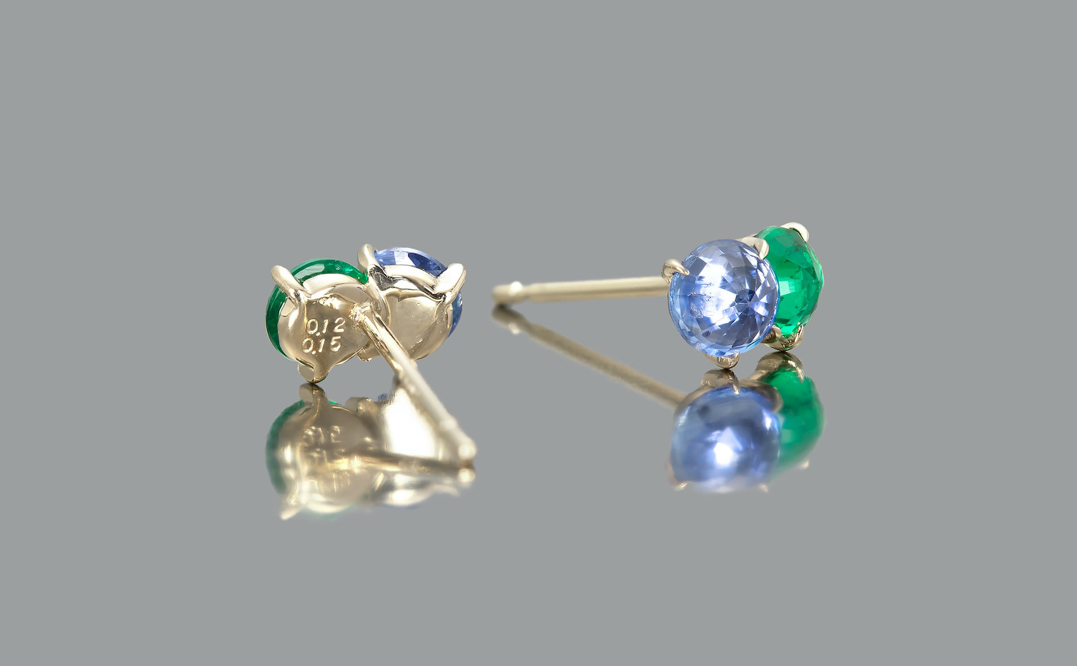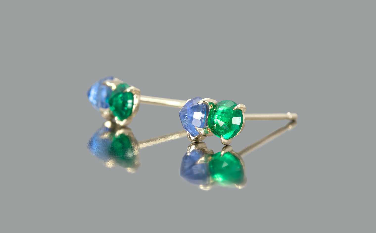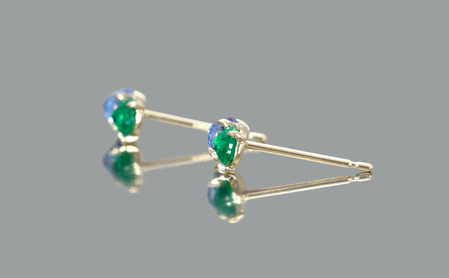 Just like a cool blue breeze blowing a gentle kiss on lushly green fields. Made with carefully selected pristine blue sapphires and deep green emeralds gracing the center of the handcrafted beige gold settings, these Calyx Studs - Emerald & Sapphire capture nature’s essence of an enchanting, dew-filled morning.