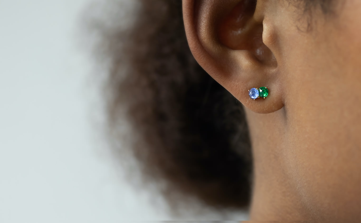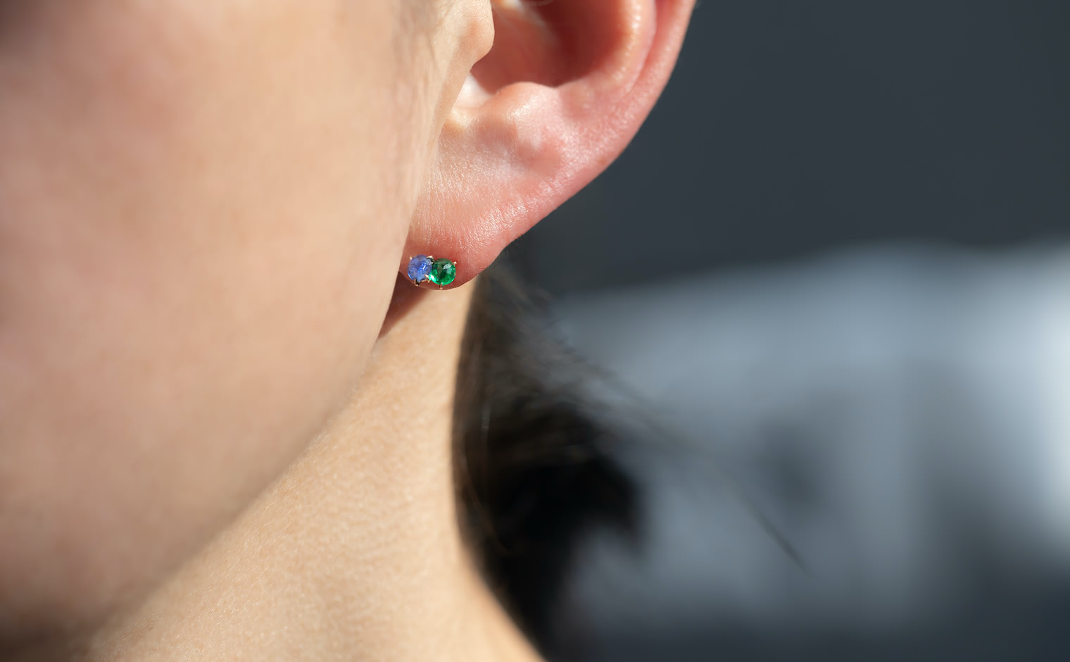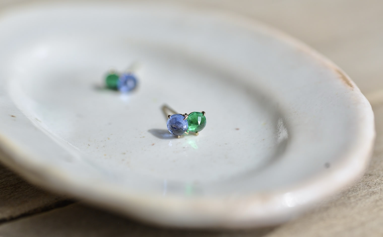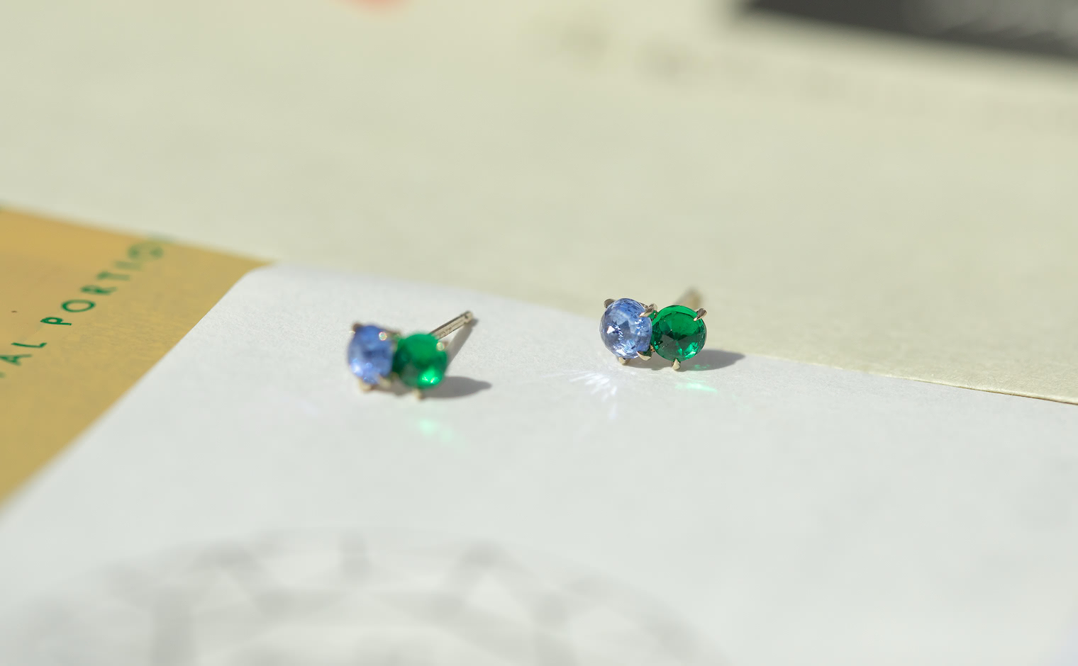 Just like a cool blue breeze blowing a gentle kiss on lushly green fields. Made with carefully selected pristine blue sapphires and deep green emeralds gracing the center of the handcrafted beige gold settings, these Calyx Studs - Emerald & Sapphire capture nature’s essence of an enchanting, dew-filled morning.