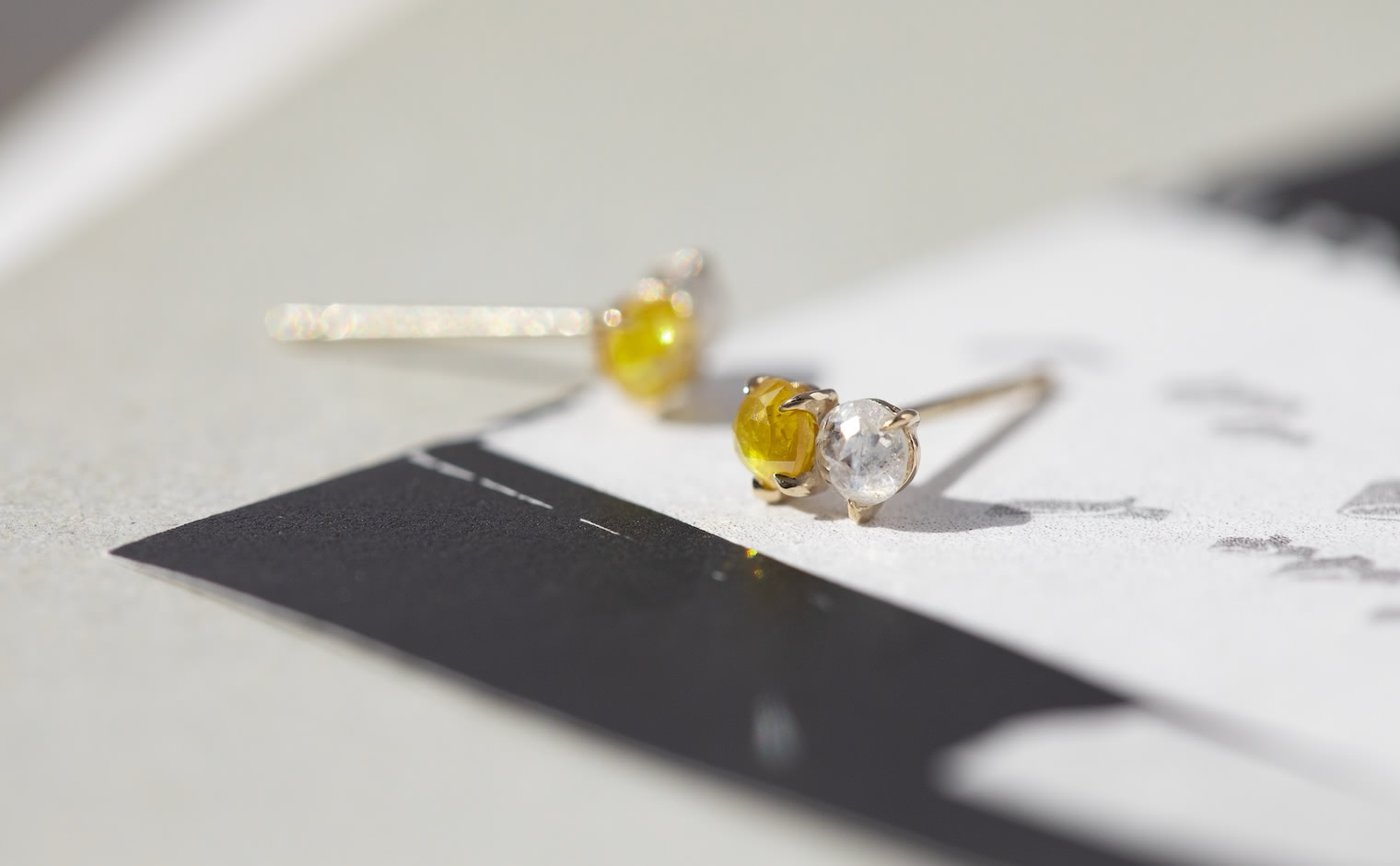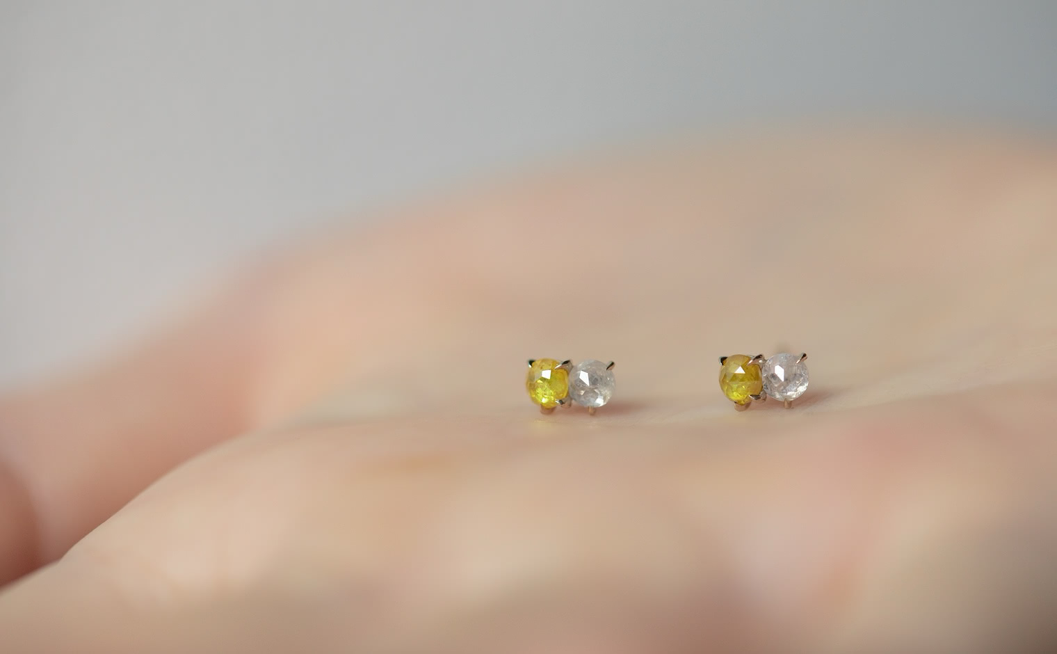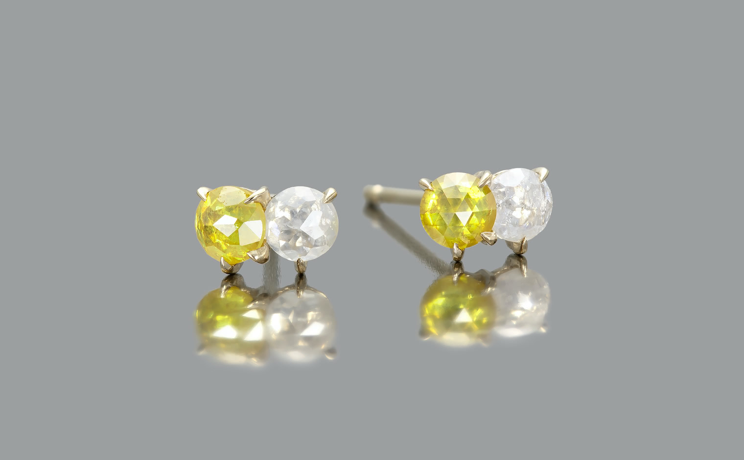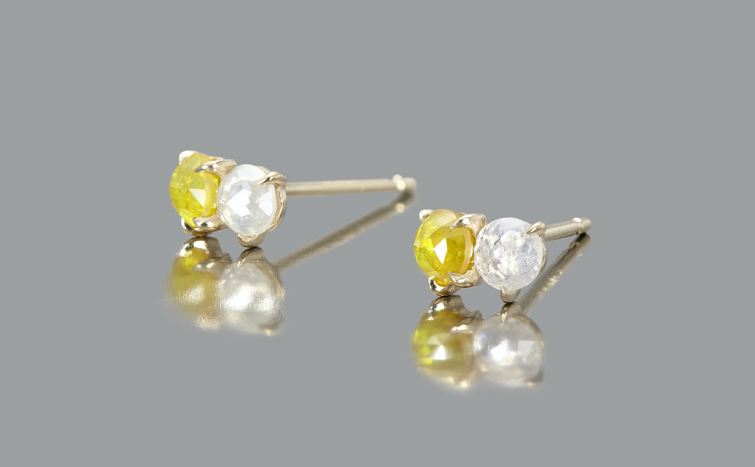 When the Sun kisses the Moon. With delicate glimmering yellow and white diamonds paired together in artisan-made beige gold settings, these charmingly tiny Yellow and White Diamond Studs tell a story of a true and enduring love since the beginning of time.