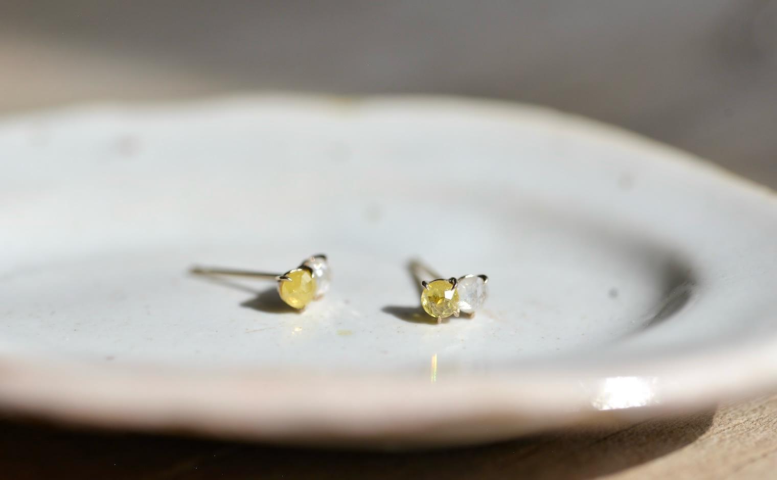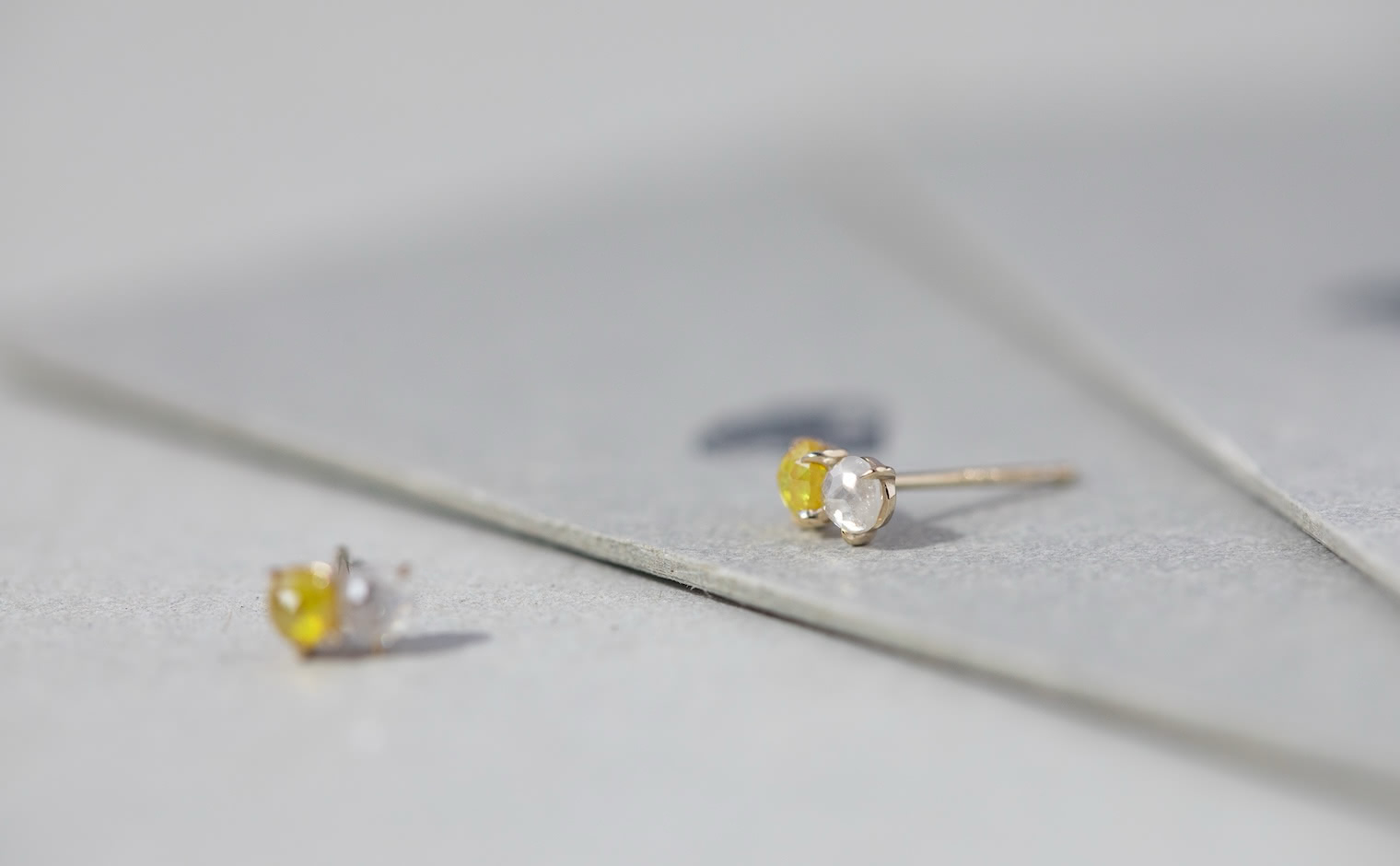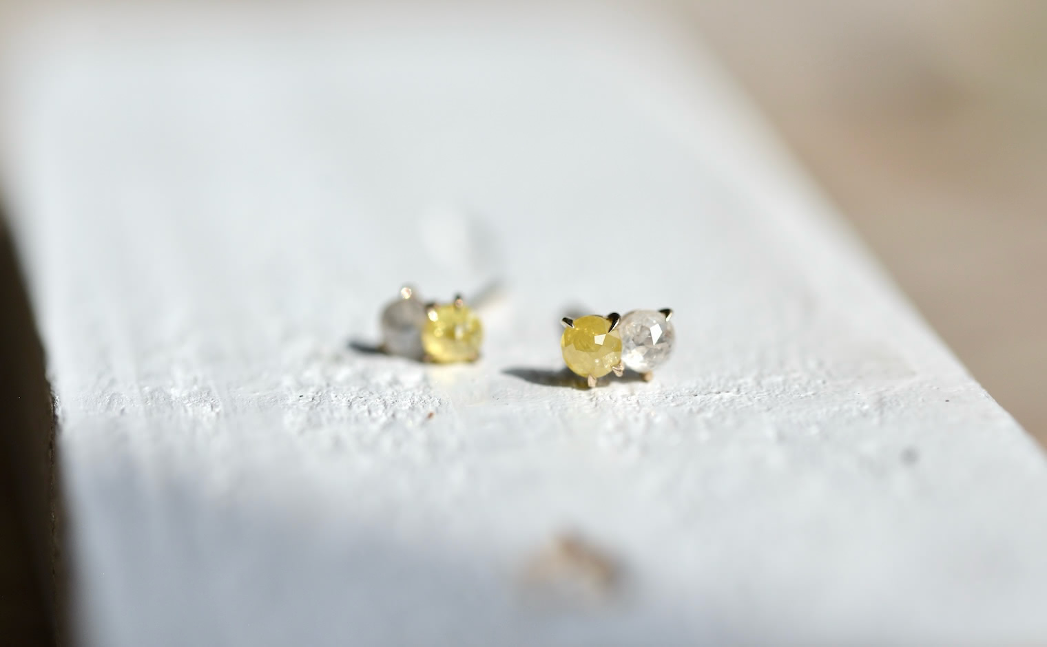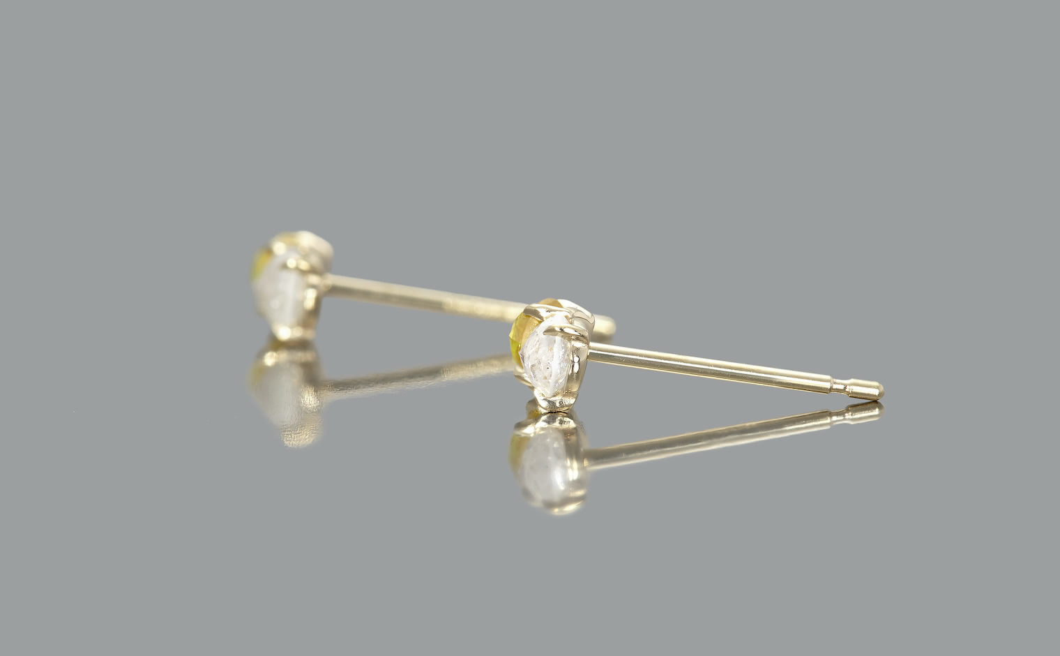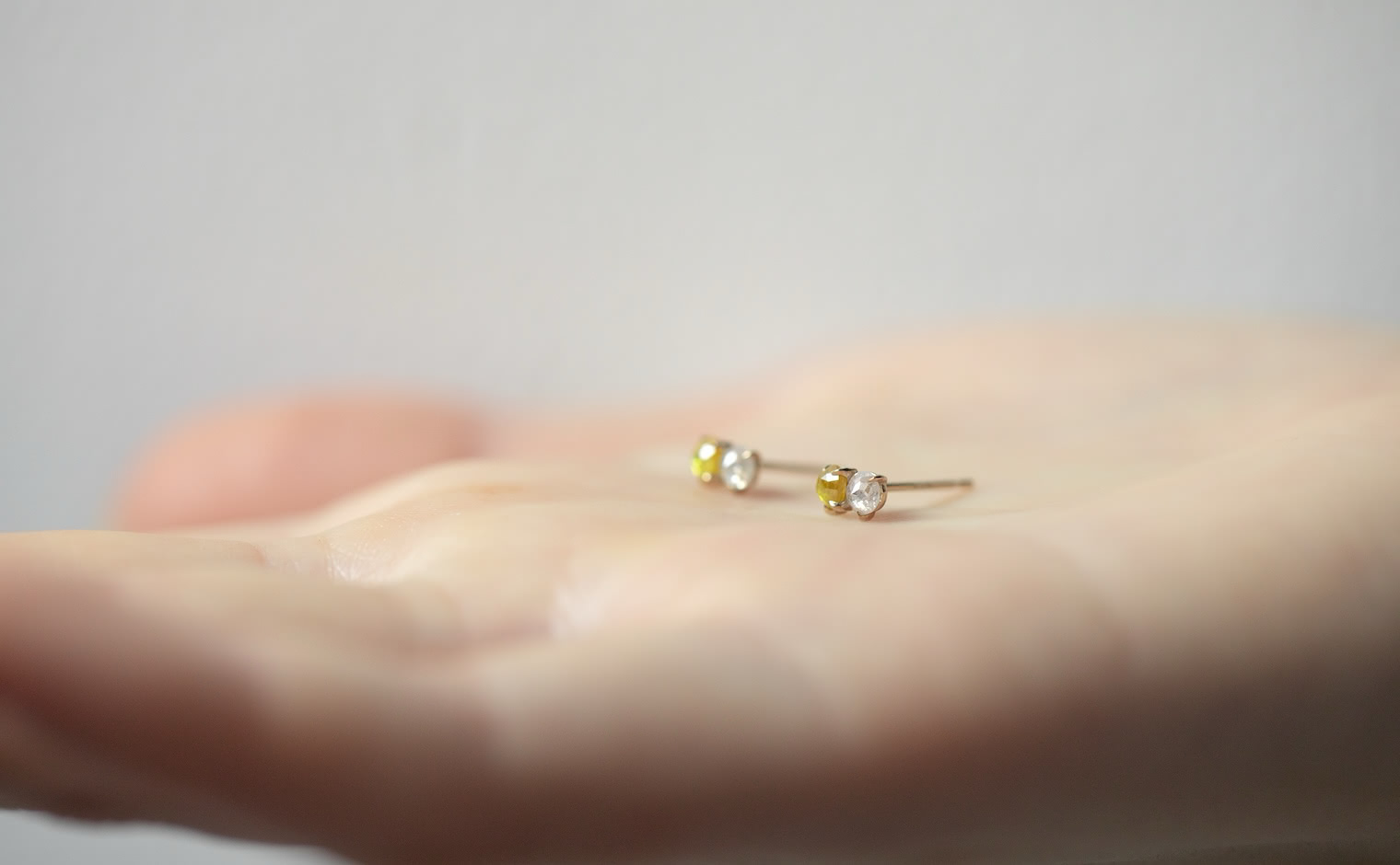 When the Sun kisses the Moon. With delicate glimmering yellow and white diamonds paired together in artisan-made beige gold settings, these charmingly tiny Yellow and White Diamond Studs tell a story of a true and enduring love since the beginning of time.
