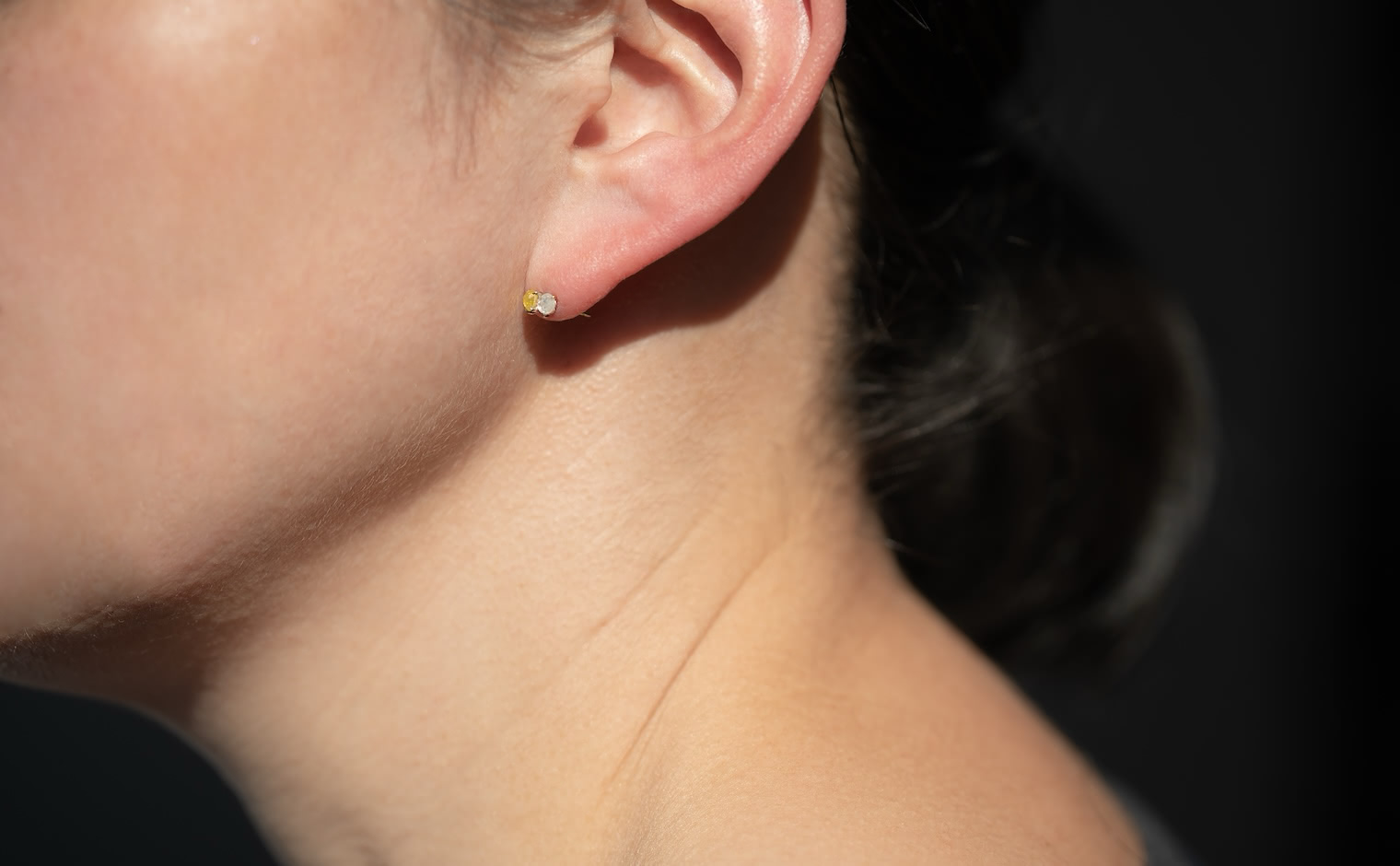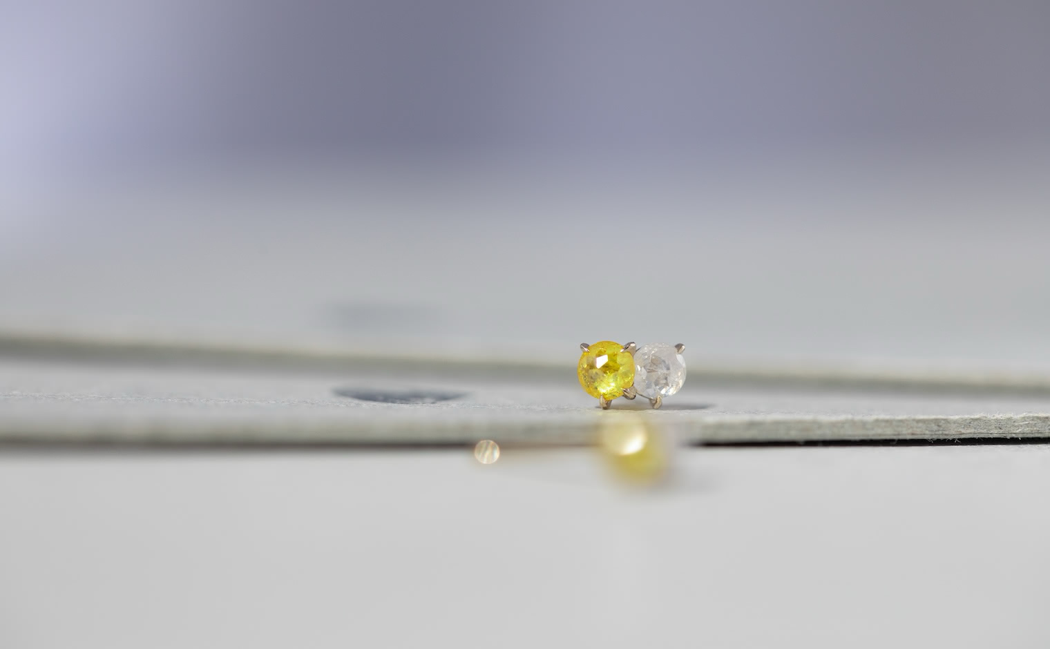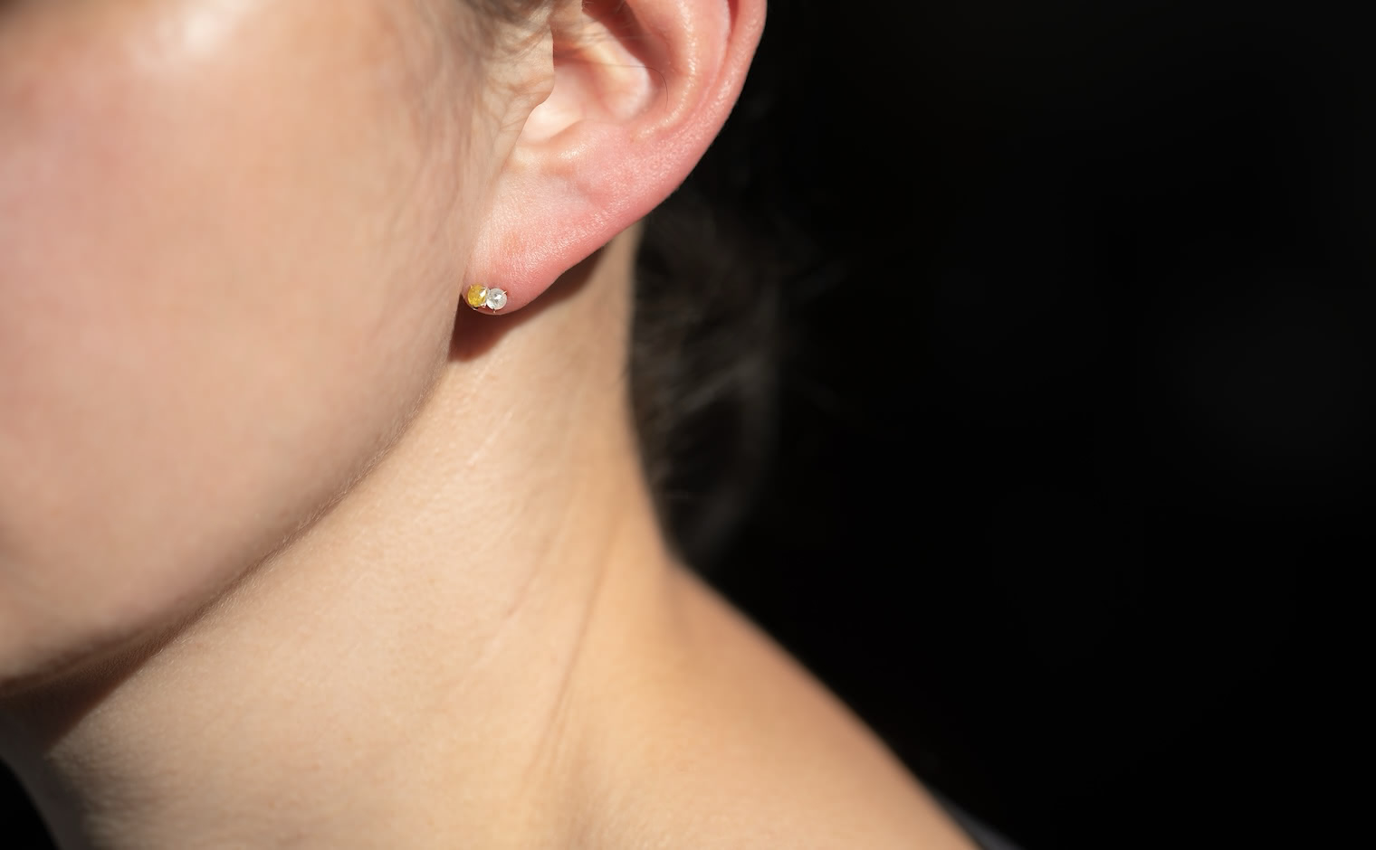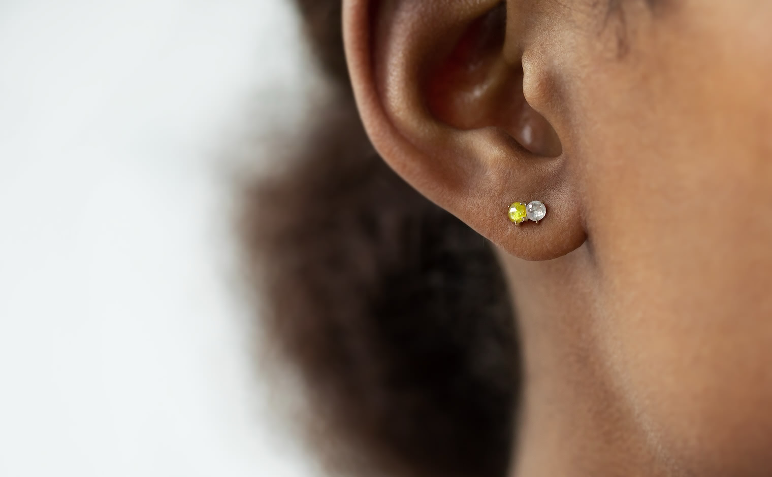 When the Sun kisses the Moon. With delicate glimmering yellow and white diamonds paired together in artisan-made beige gold settings, these charmingly tiny Yellow and White Diamond Studs tell a story of a true and enduring love since the beginning of time.