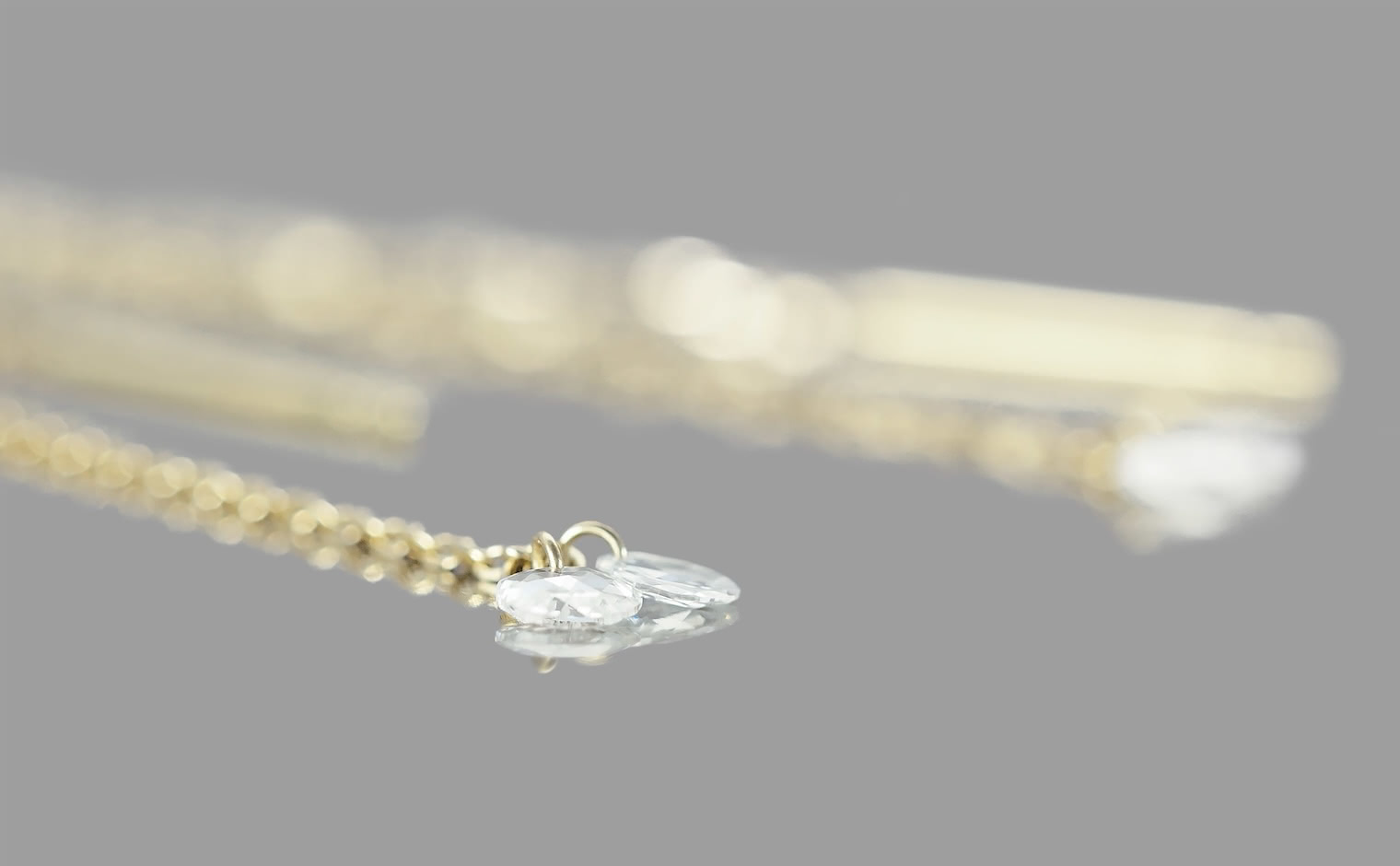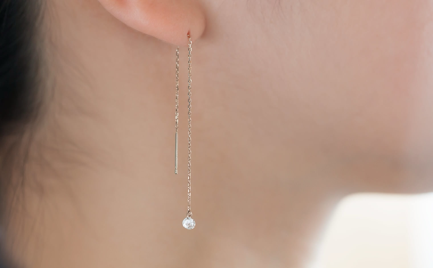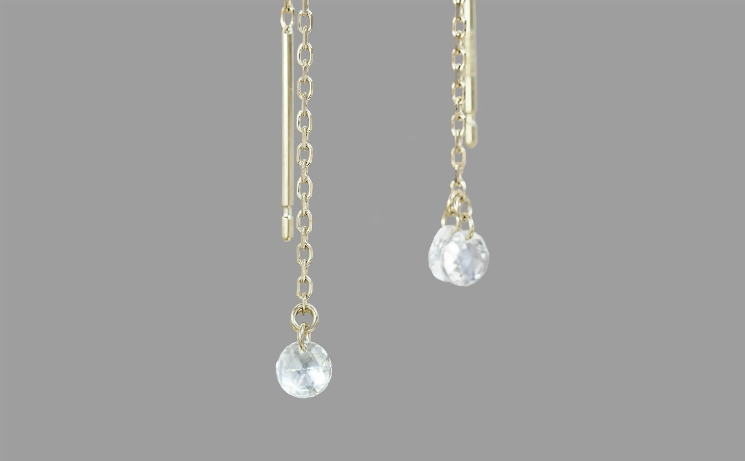 Elegantly thin and beautifully effortless, a long chain of custom-blended gold threads through your ear, each carrying two brightly faceted diamonds. On the other end, a gold post is expertly secured to create balance and dexterity.