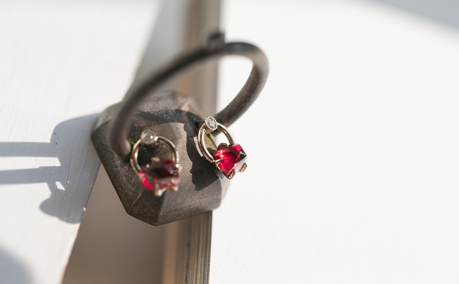 A glimmer of crimson rests within golden arcs, like a flame gently held in stillness.
