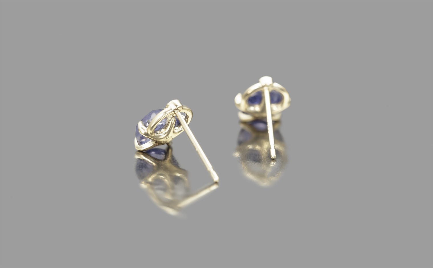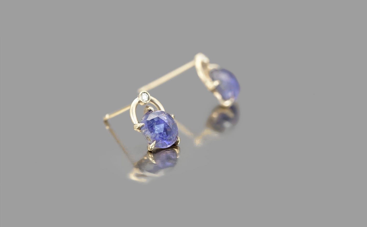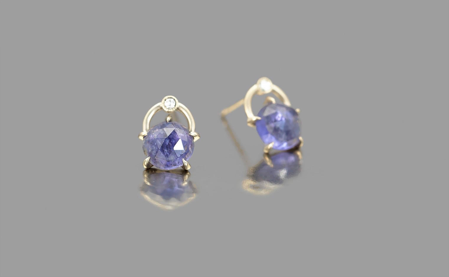 Romantic, dusky tanzanites are faceted like the petals of a rose and set with elegantly thin golden prongs.