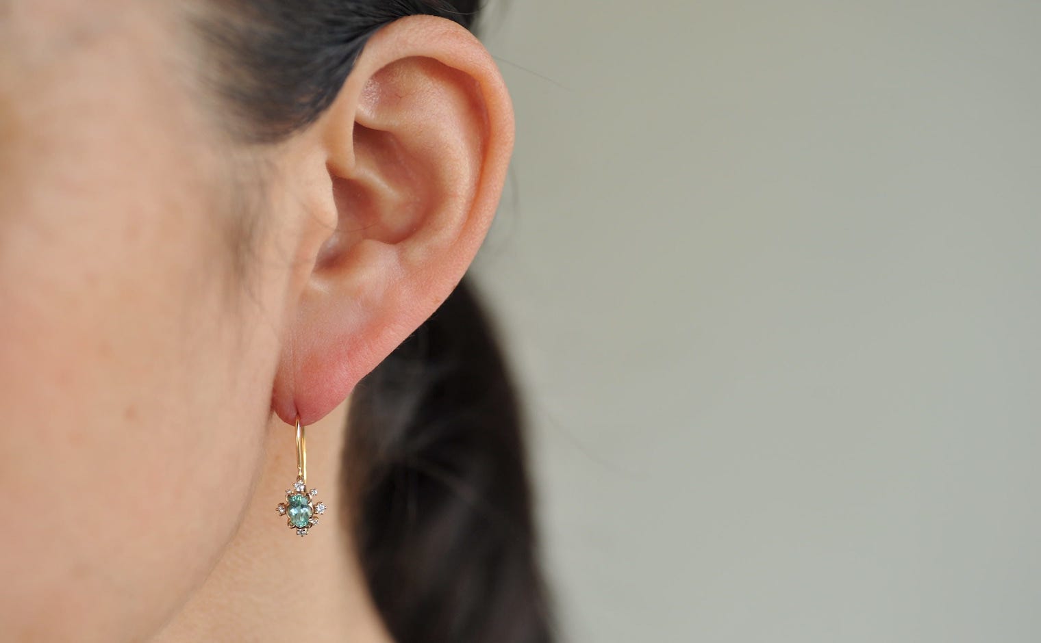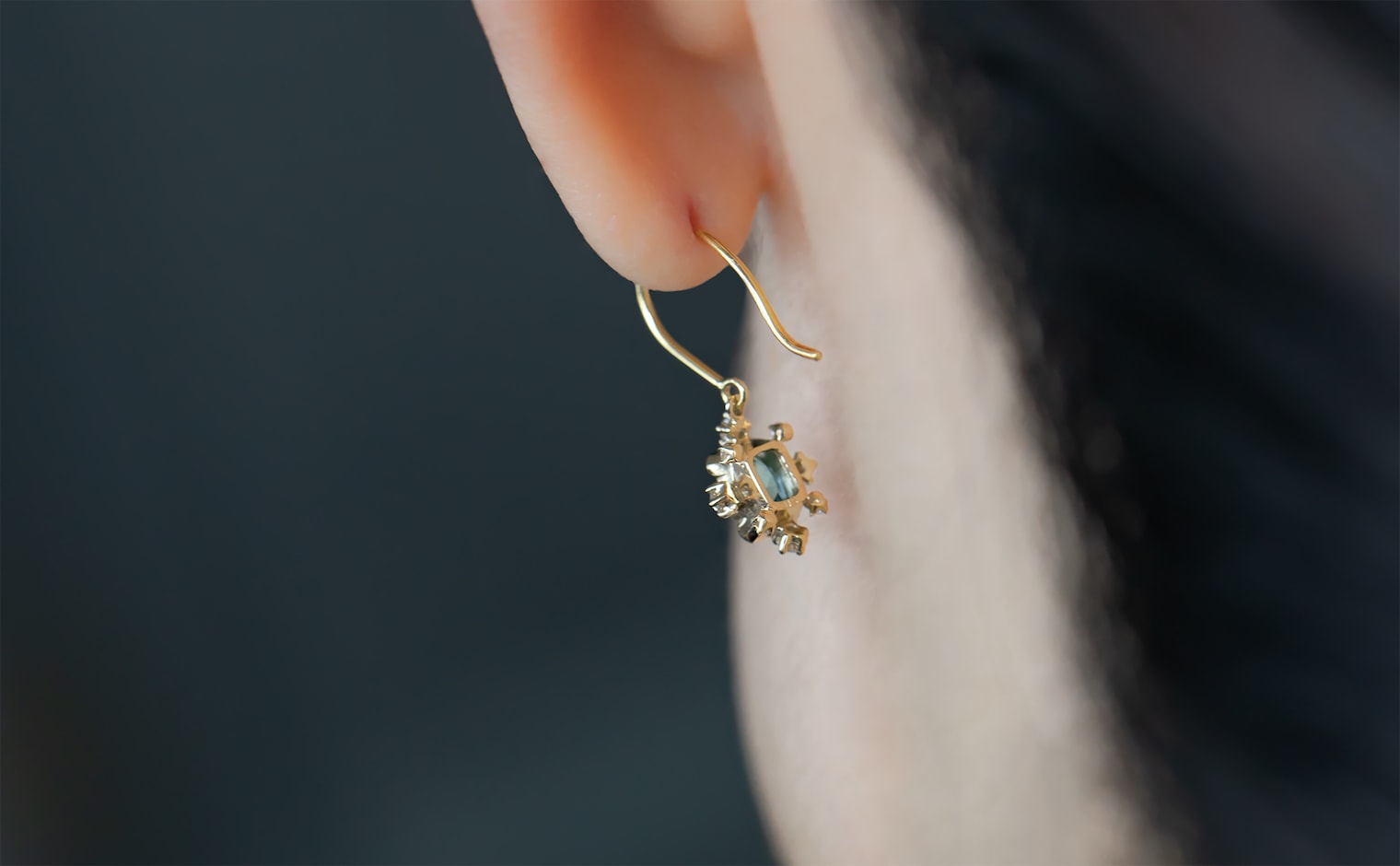 Suspended from a curved gold ear wire, these earrings shimmer and catch the light just like a falling snowflake. -