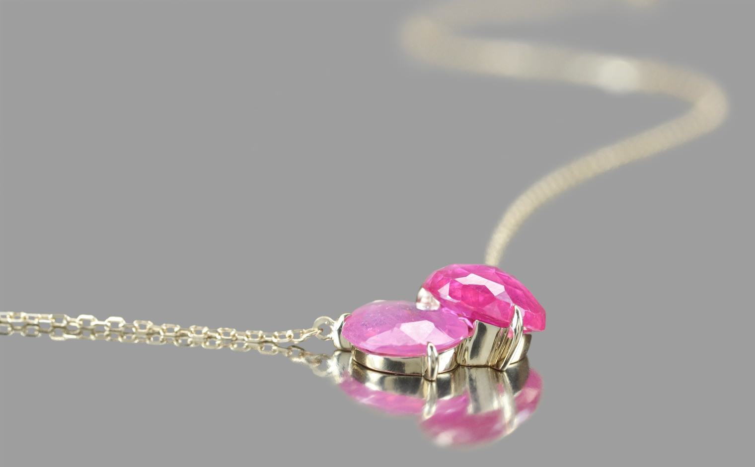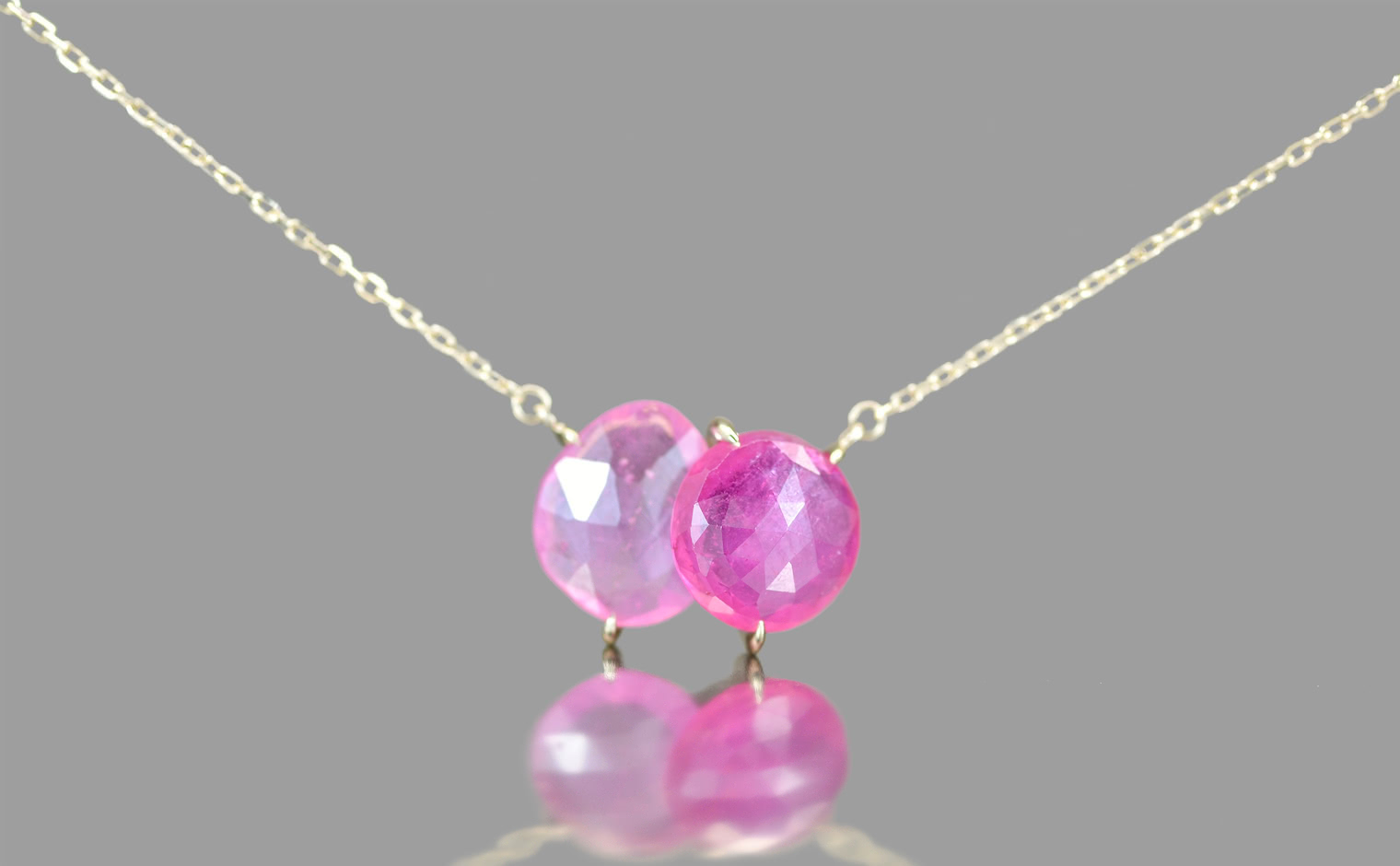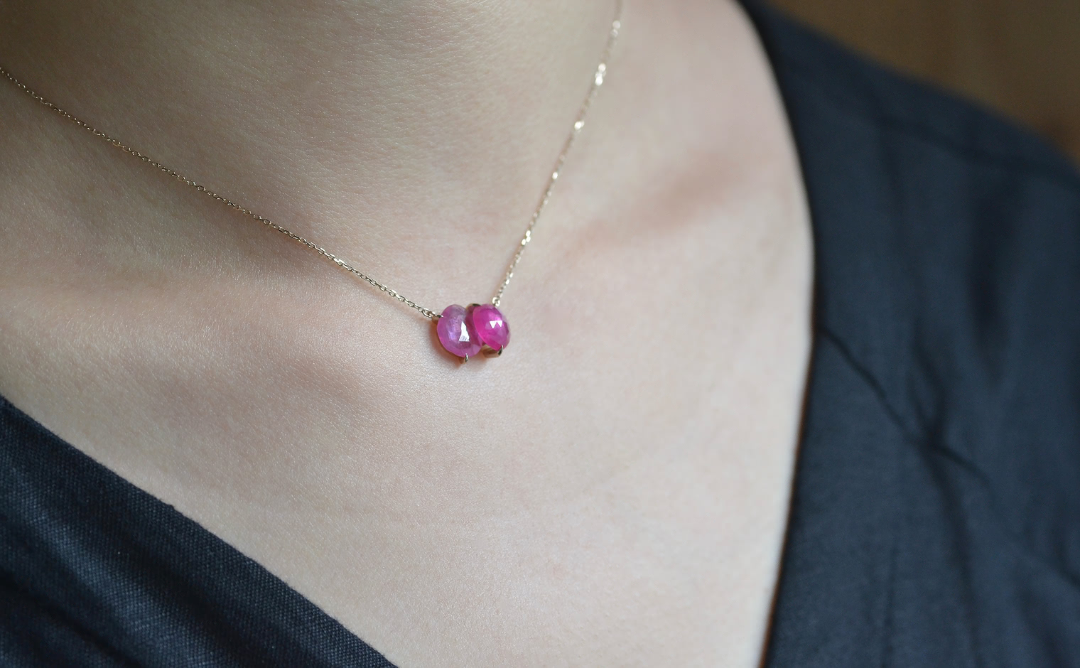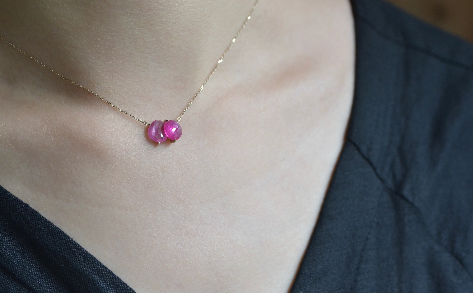 A beautiful way to brighten any day, this necklace of an expertly selected ruby and sapphire has a uniquely crafted sliding mechanism for custom length. The rosy hues and blush tones create a romanticism that's both playful and elegant at the same time.