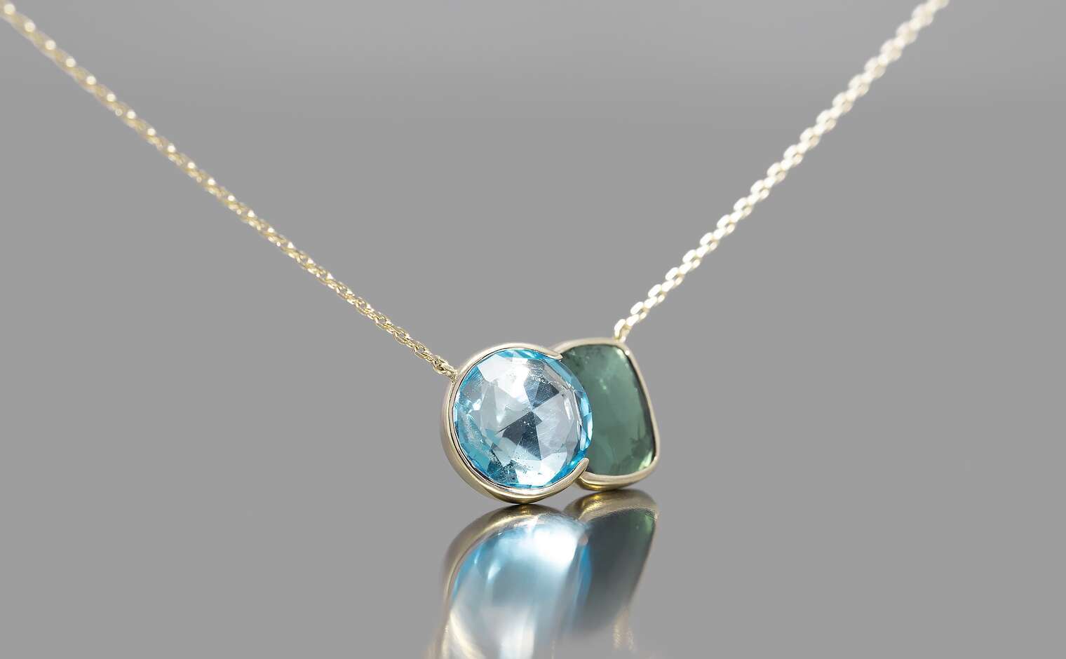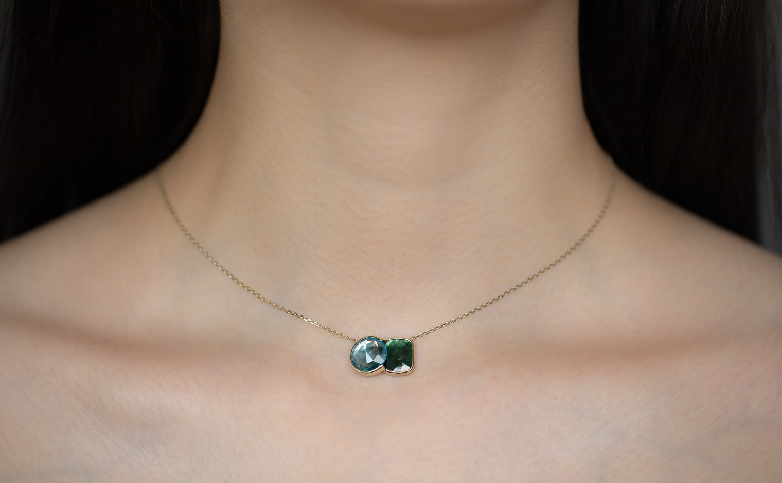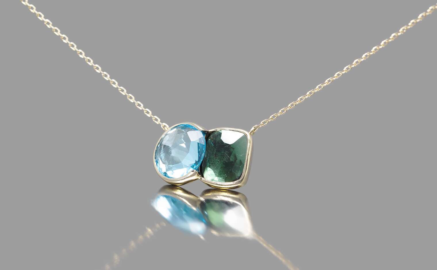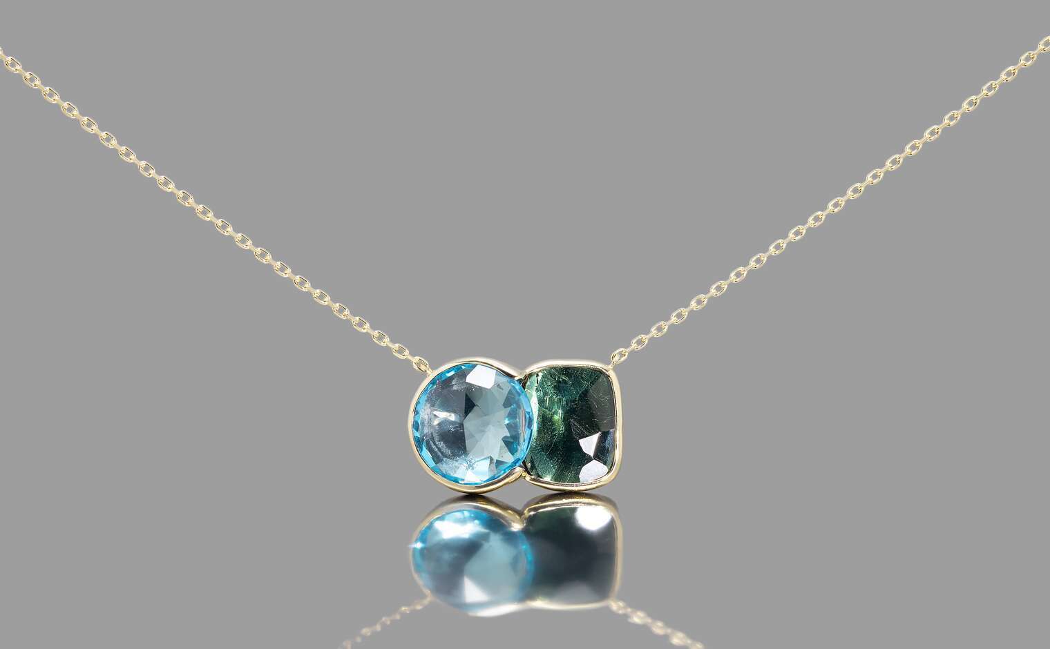 The contrasting hues of this necklace, inspired by Blue Morpho butterflies found in tropical forests of South and Central America, is an ode to everything beautiful and delicate observed in nature.The sky blue topaz is in the most gentle and healing blue tones, and the darker green tourmaline evokes time-immemorial rainforests, known for their abundance and prosperity.