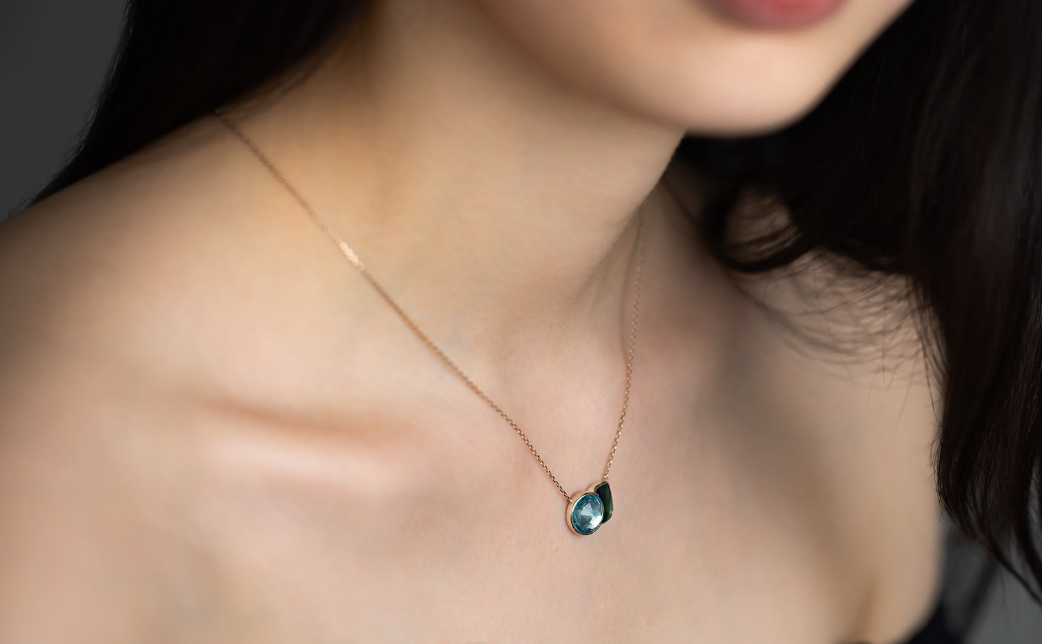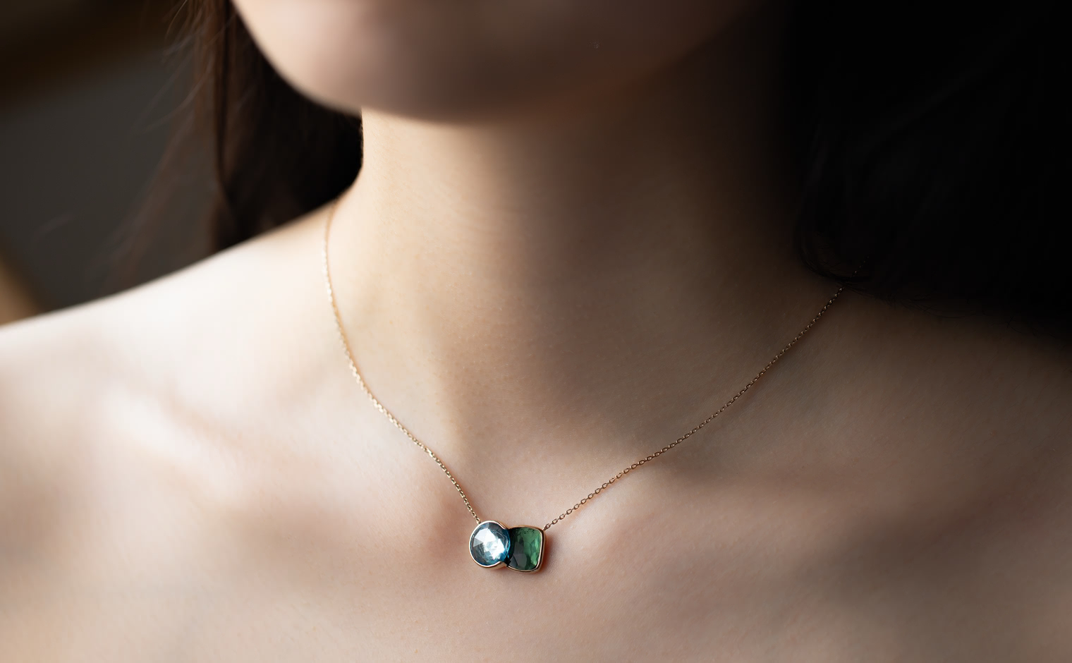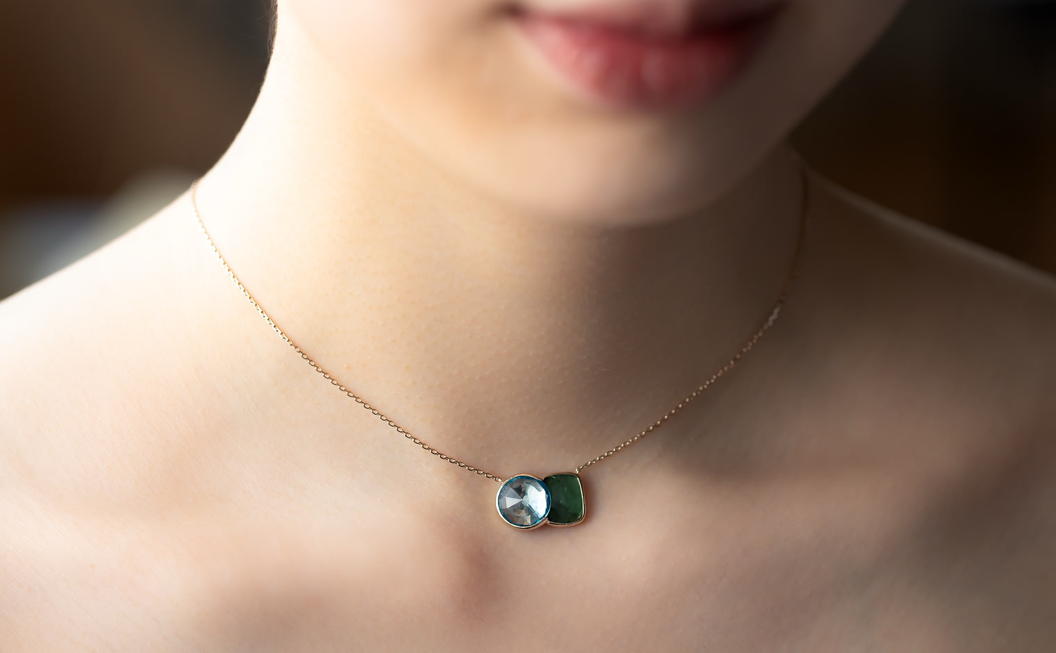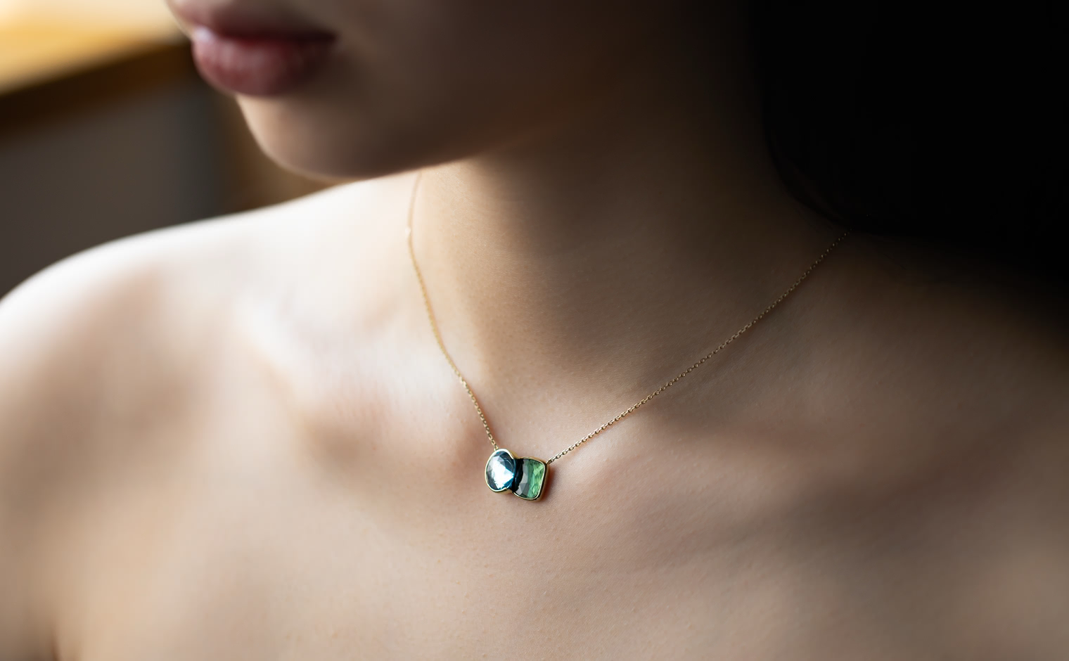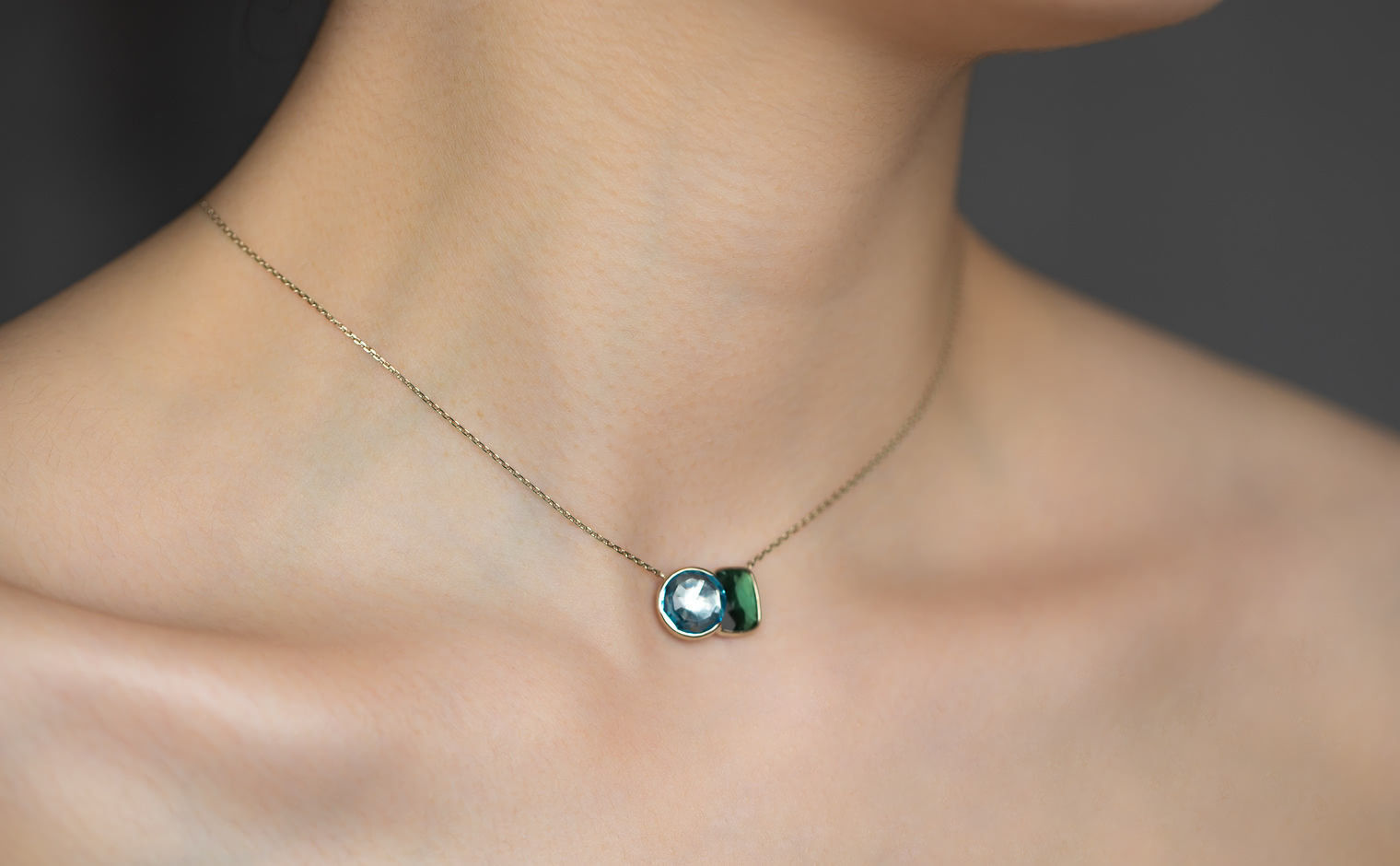 The contrasting hues of this necklace, inspired by Blue Morpho butterflies found in tropical forests of South and Central America, is an ode to everything beautiful and delicate observed in nature.The sky blue topaz is in the most gentle and healing blue tones, and the darker green tourmaline evokes time-immemorial rainforests, known for their abundance and prosperity.