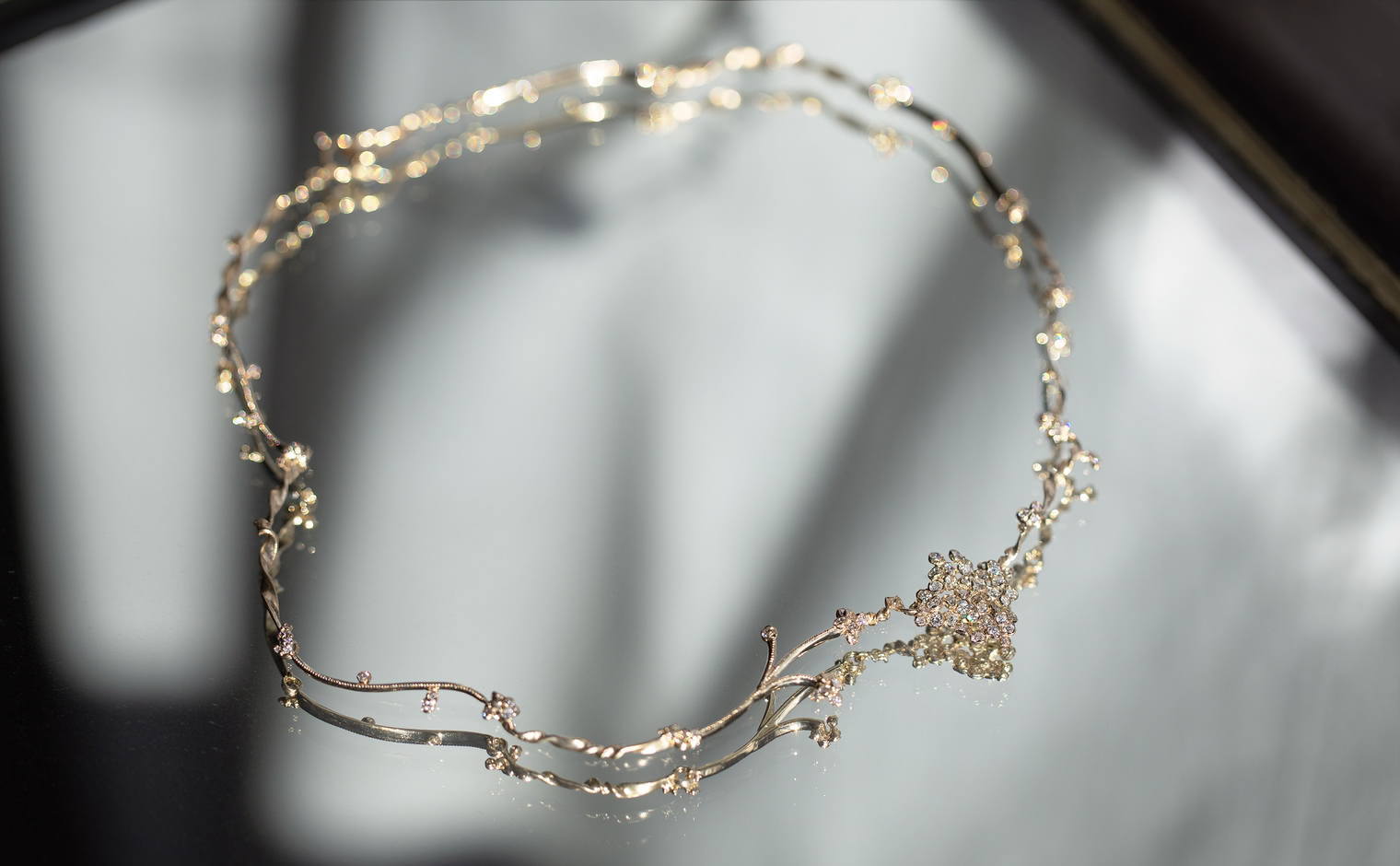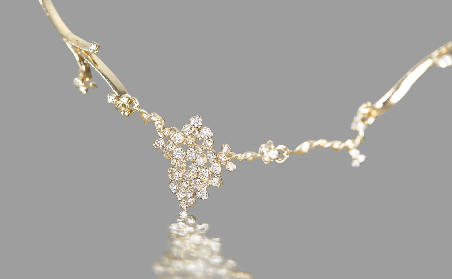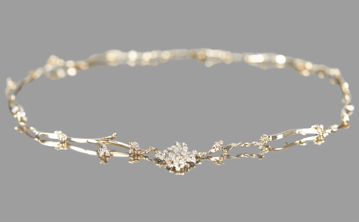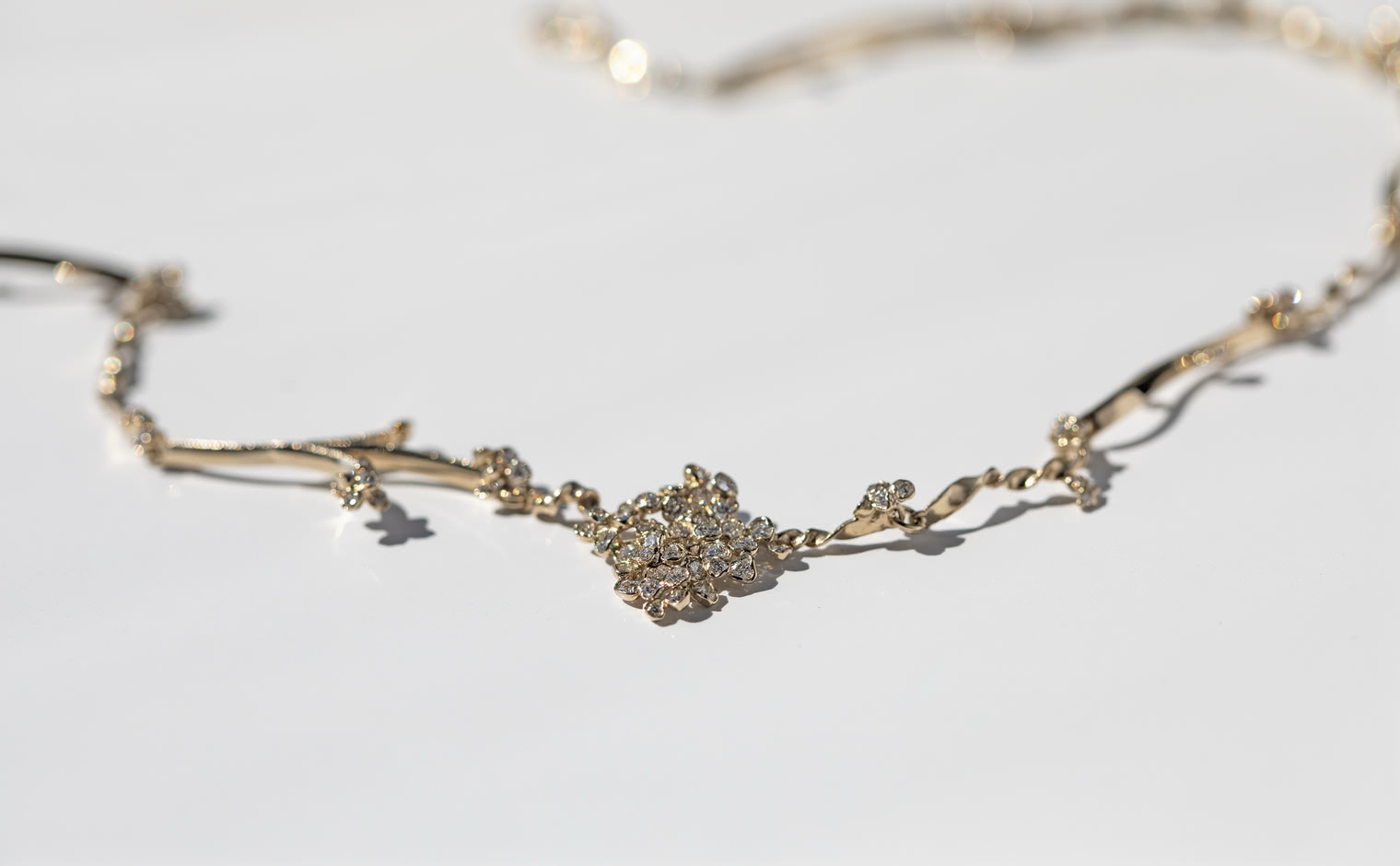 From a center of brilliantly sparkling diamonds set clustered together, thin ribbons of custom-blended metal seem to swirl and branch with tiny single diamonds dancing along the way.