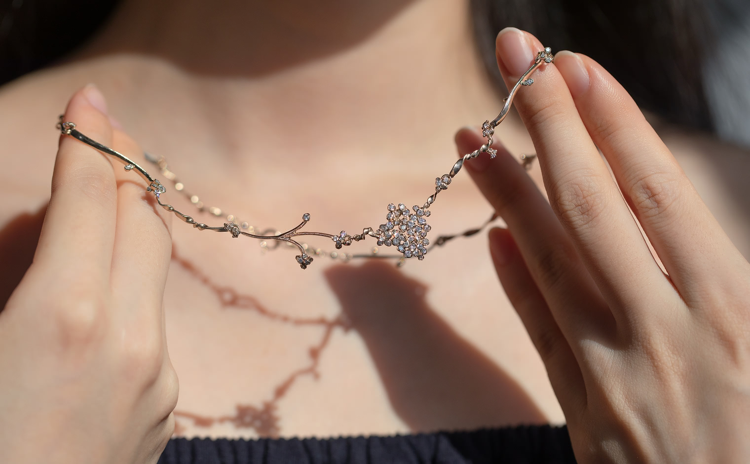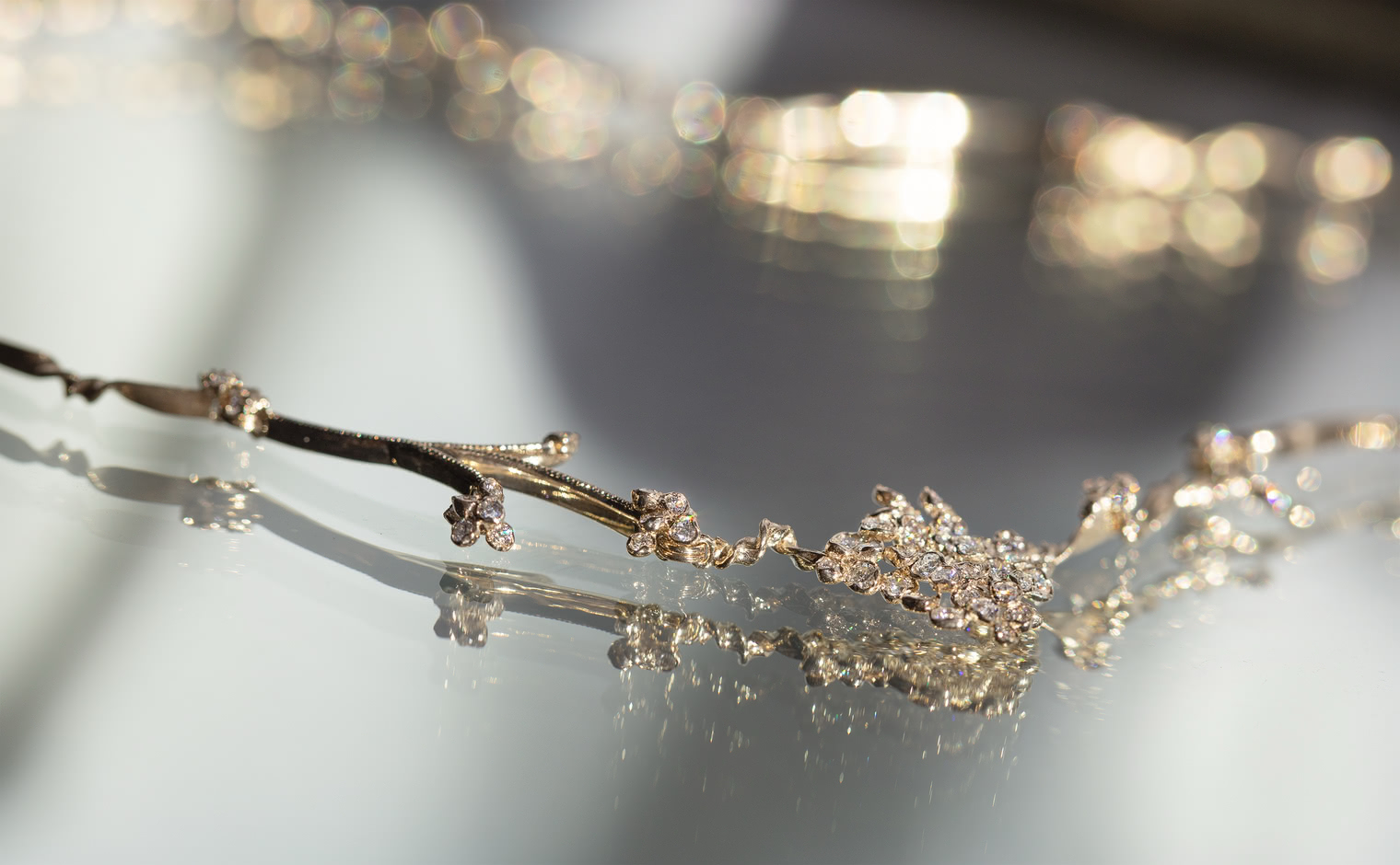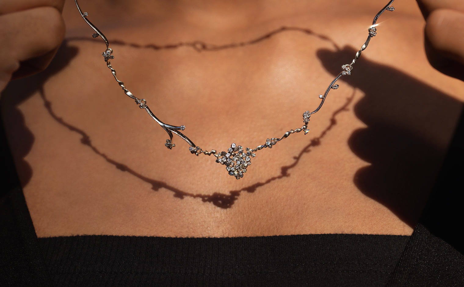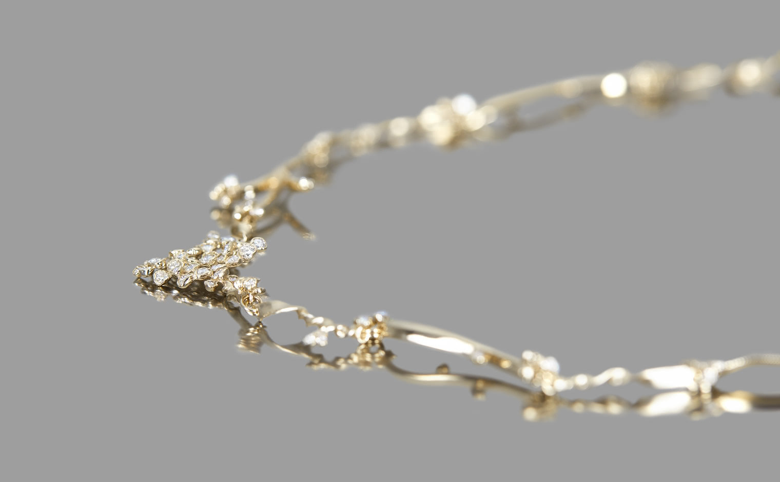 From a center of brilliantly sparkling diamonds set clustered together, thin ribbons of custom-blended metal seem to swirl and branch with tiny single diamonds dancing along the way.