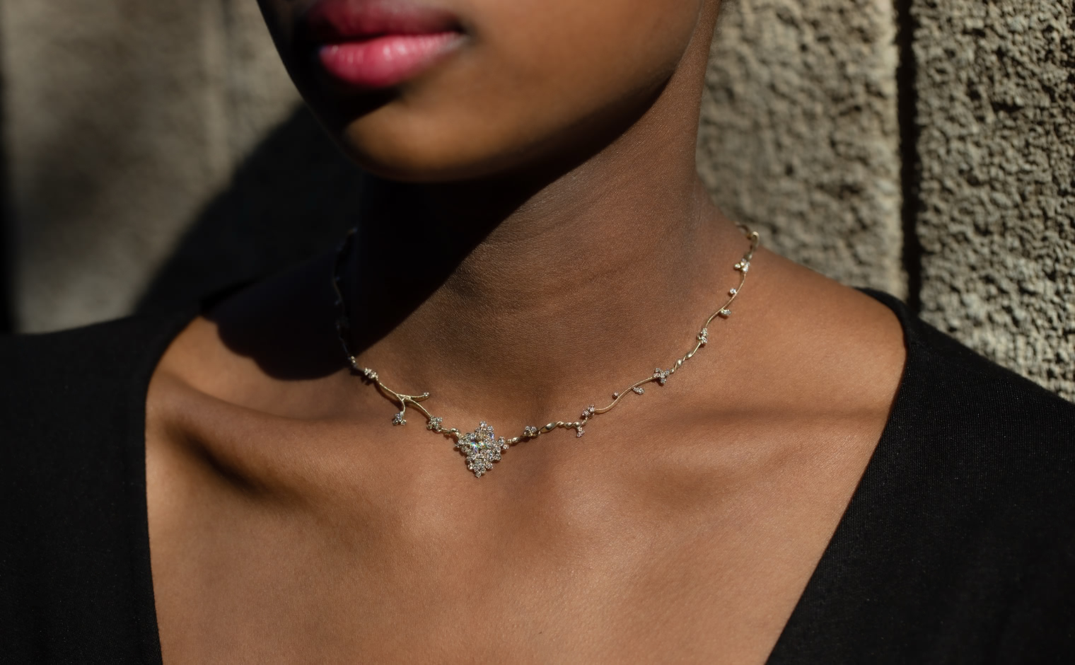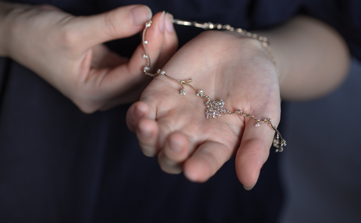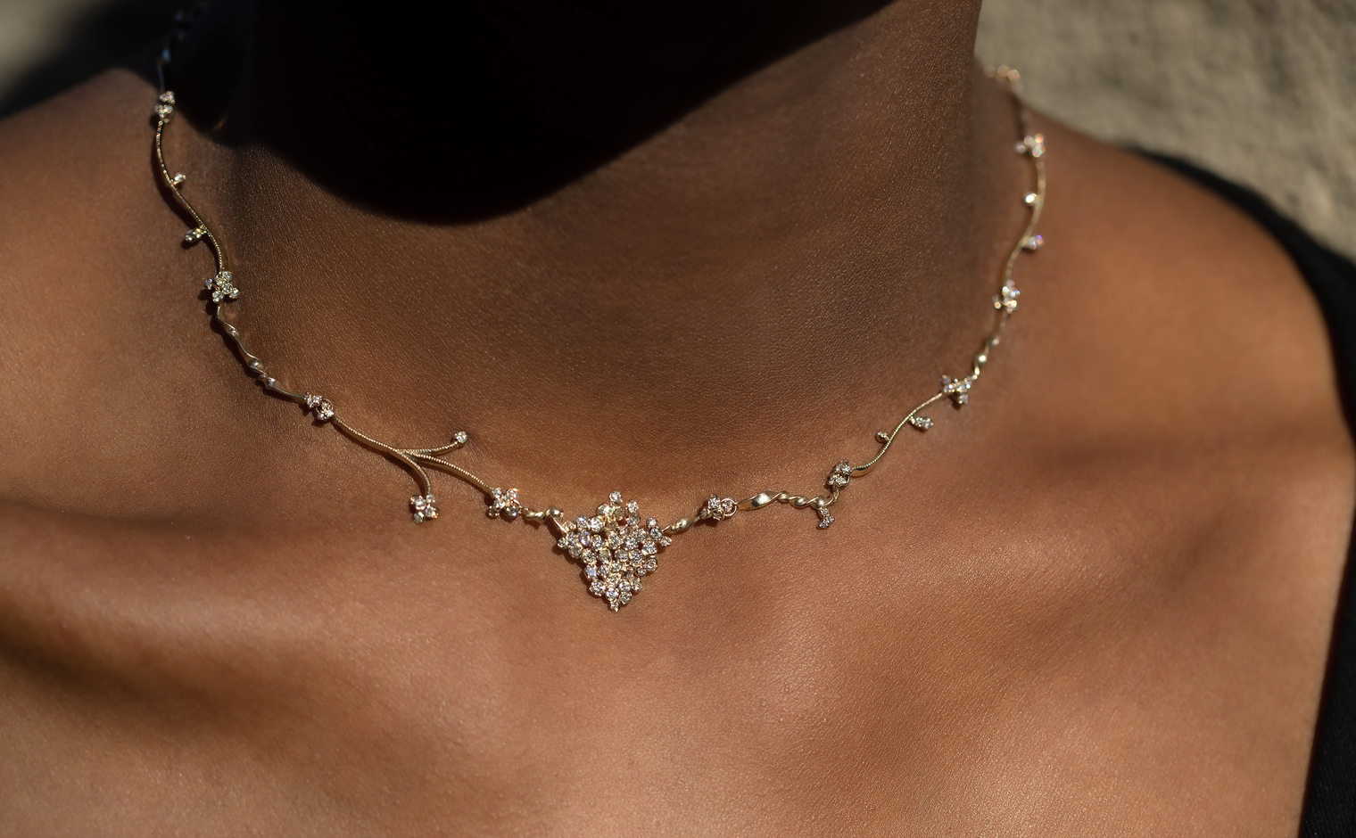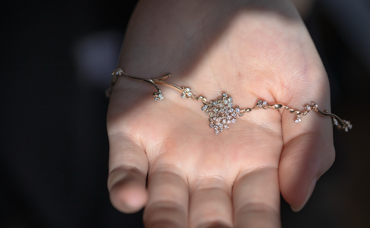 From a center of brilliantly sparkling diamonds set clustered together, thin ribbons of custom-blended metal seem to swirl and branch with tiny single diamonds dancing along the way.