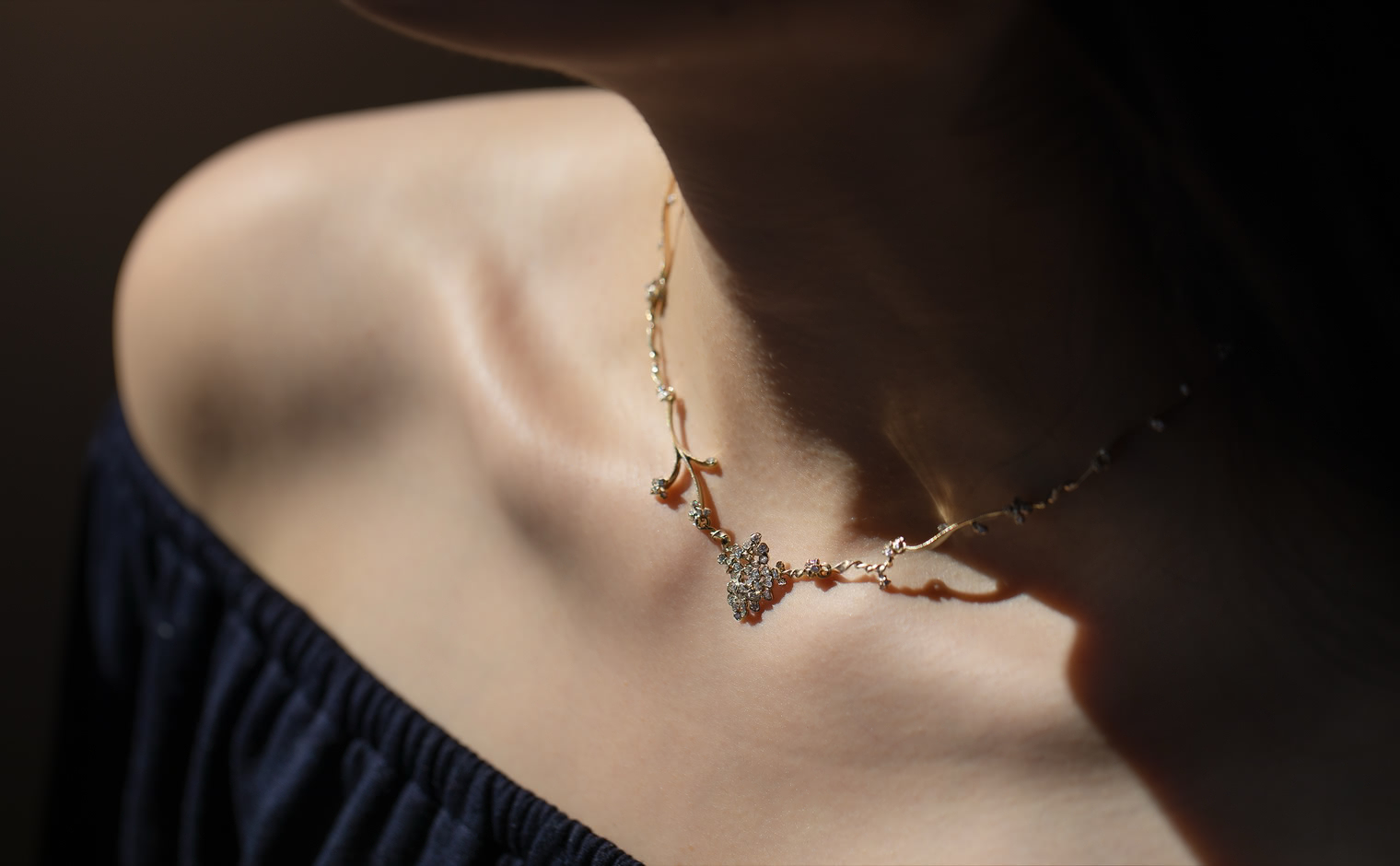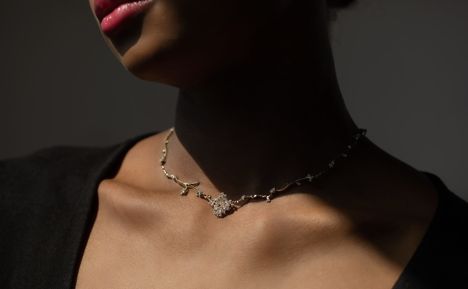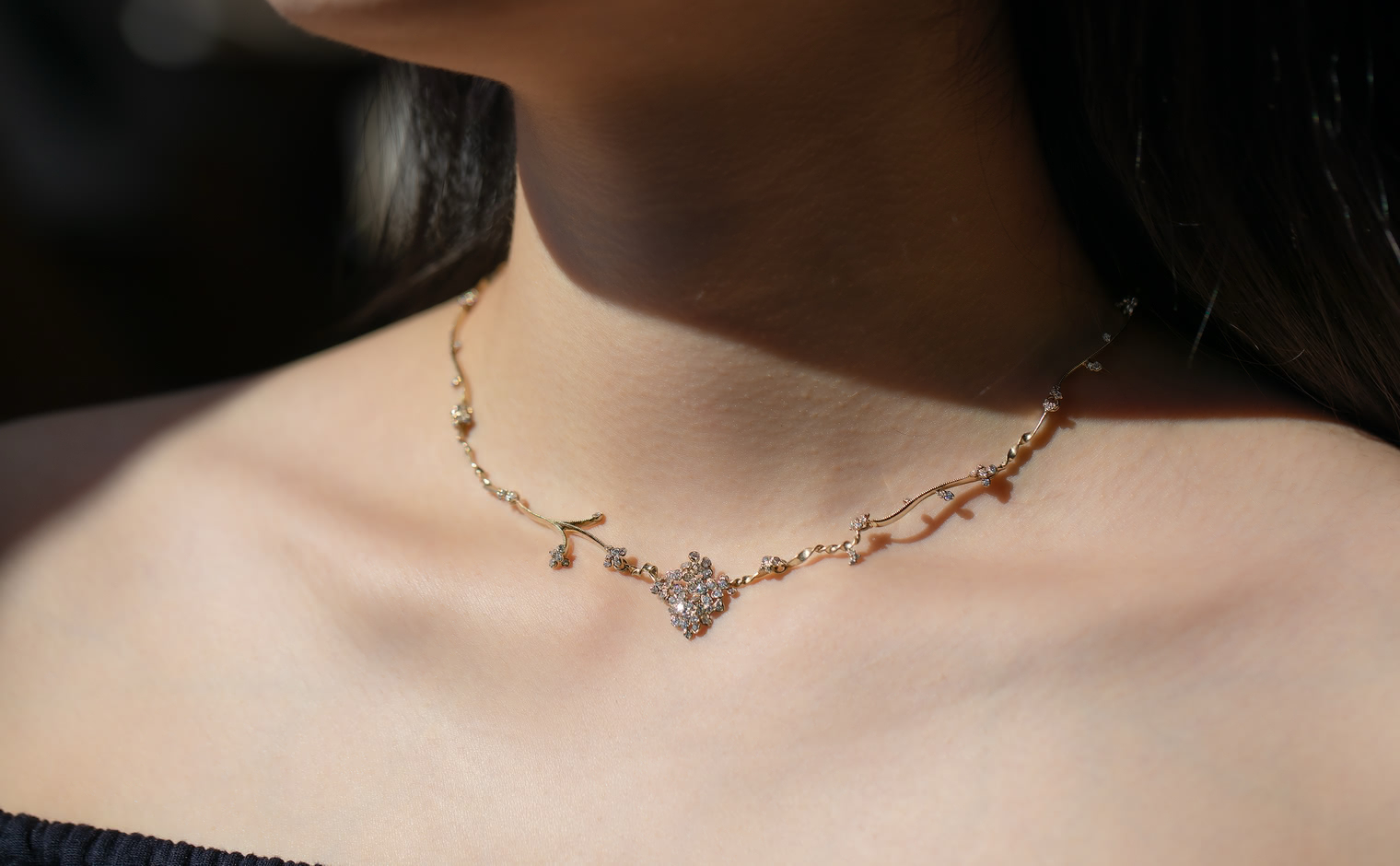 A sight to behold, this masterpiece of twirling, textured and gleaming metal wraps closely around your neck.
