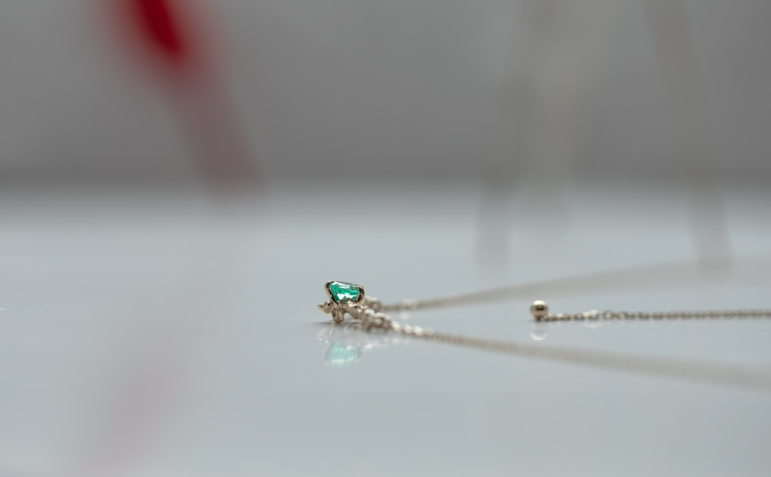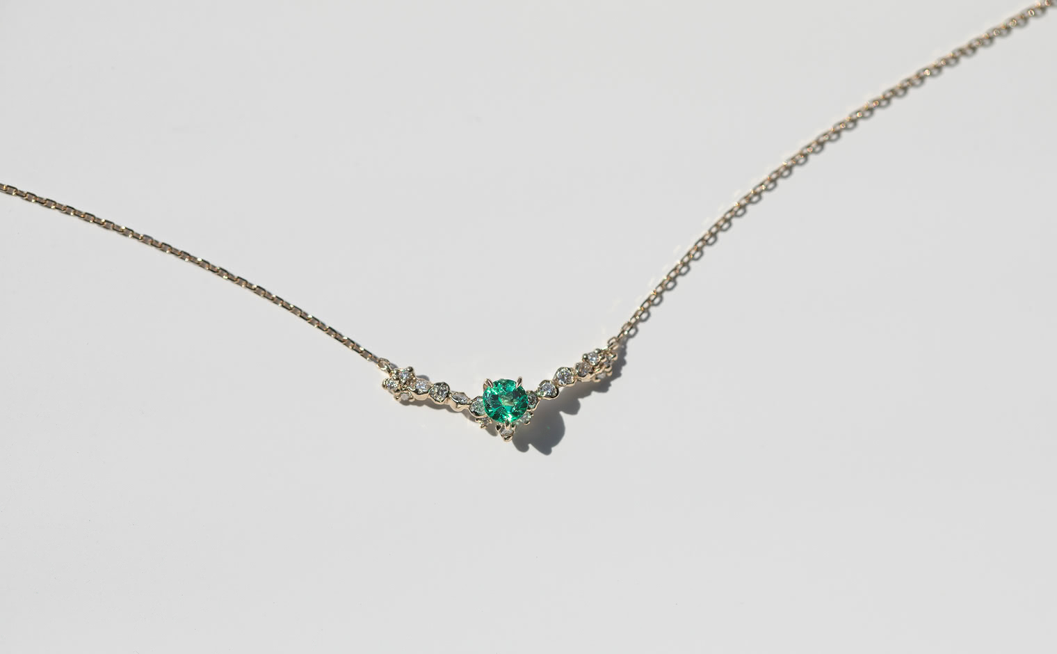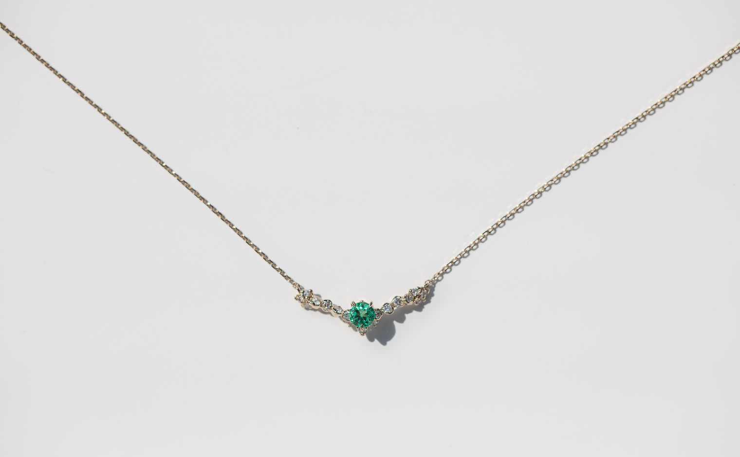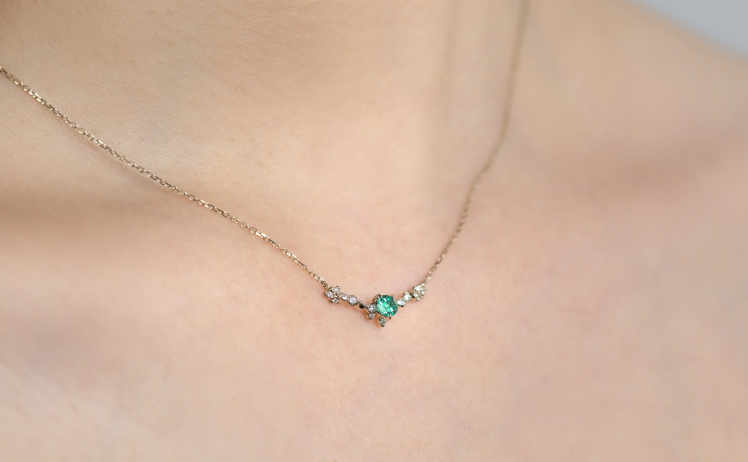 An emerald, vibrant and serene, its light unfolding with quiet elegance. The Curved Snowflake Necklace–Emerald reflects nature’s grace, a timeless whisper of beauty.
