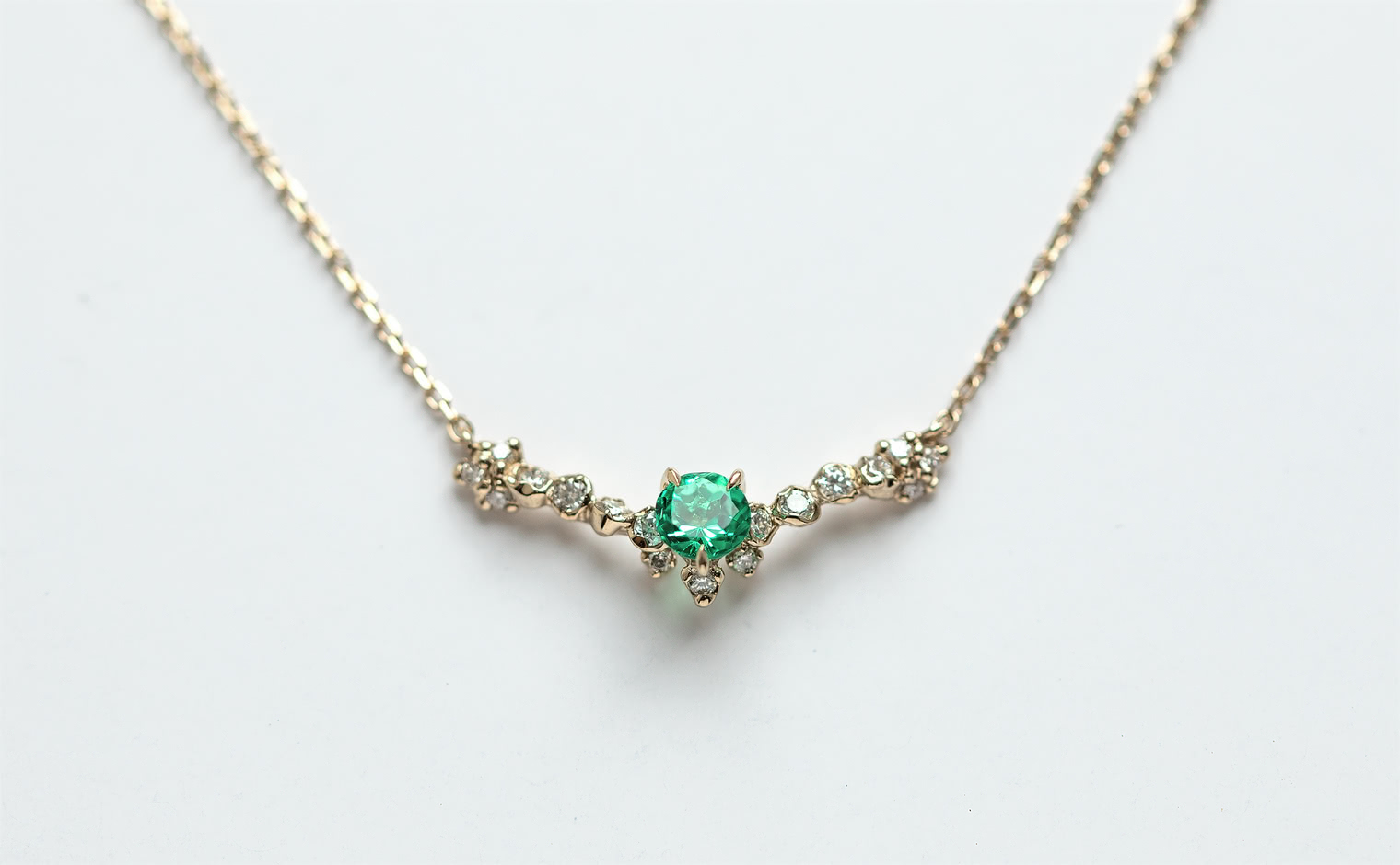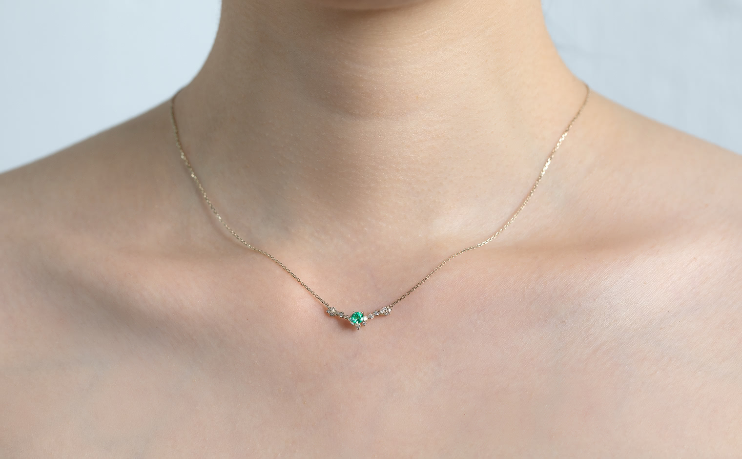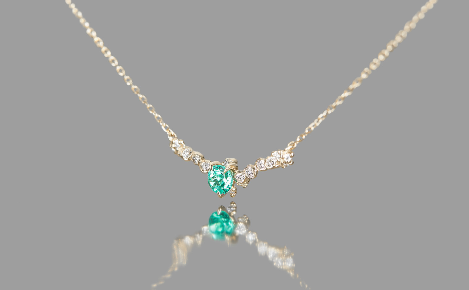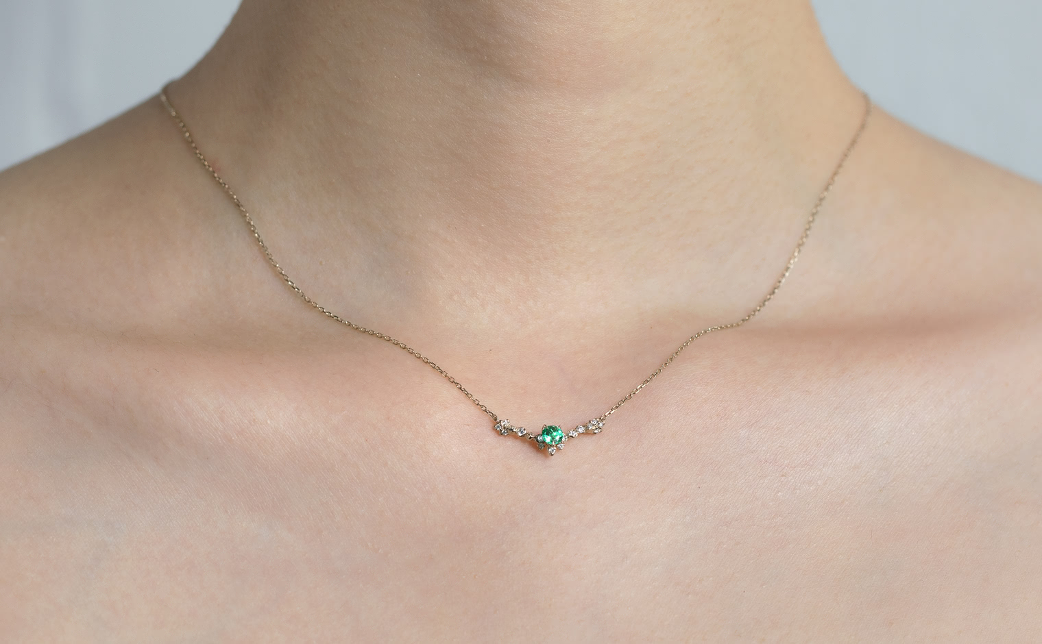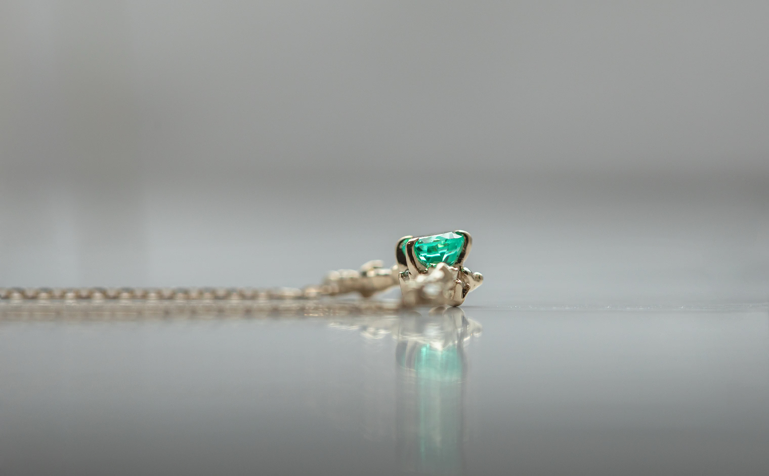 An emerald, vibrant and serene, its light unfolding with quiet elegance. The Curved Snowflake Necklace–Emerald reflects nature’s grace, a timeless whisper of beauty.
