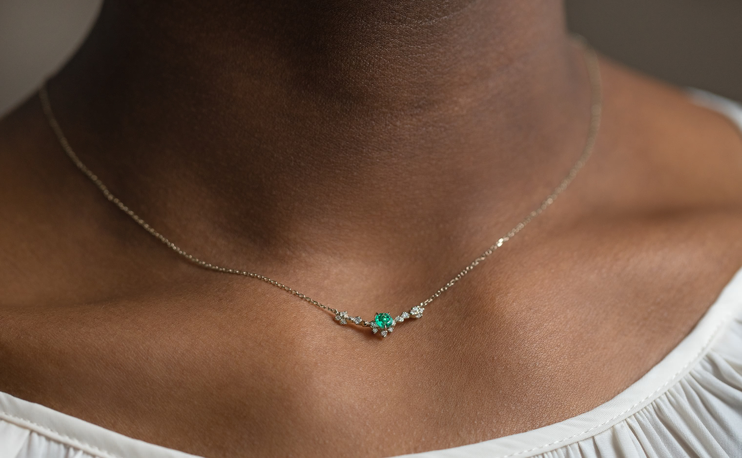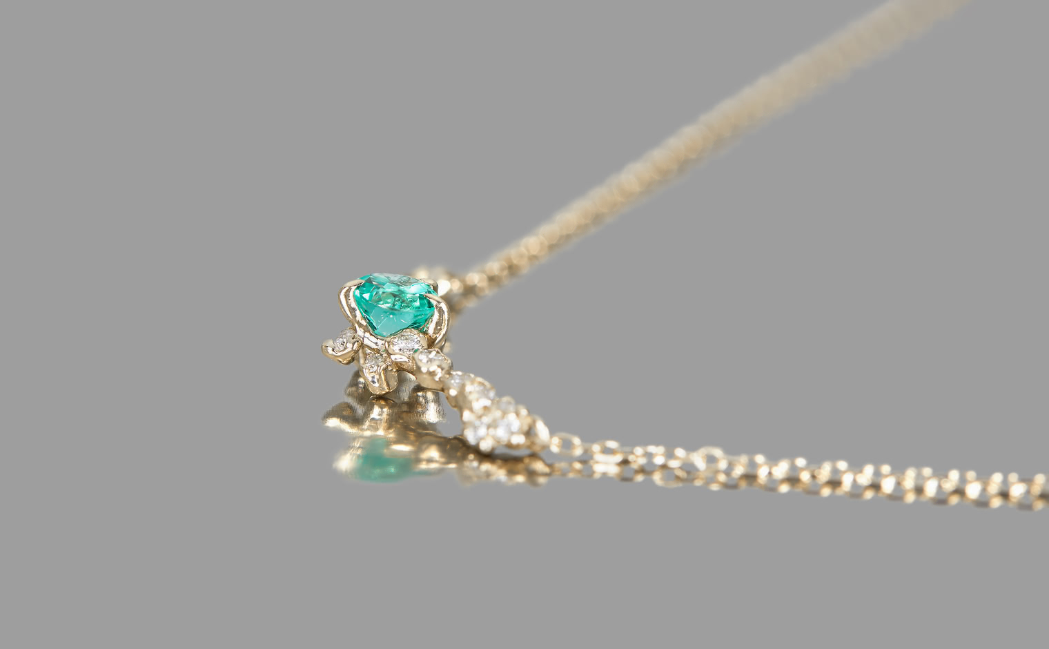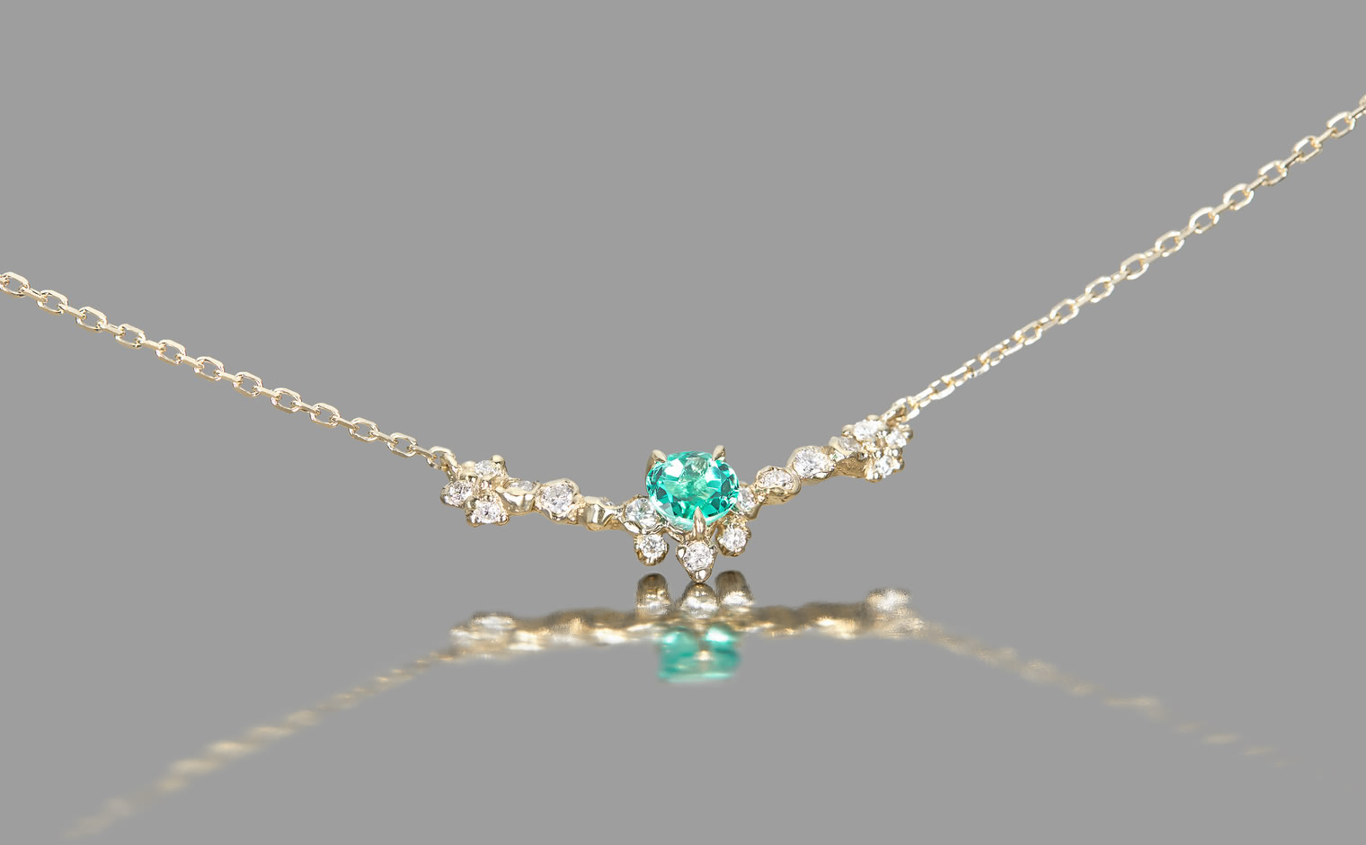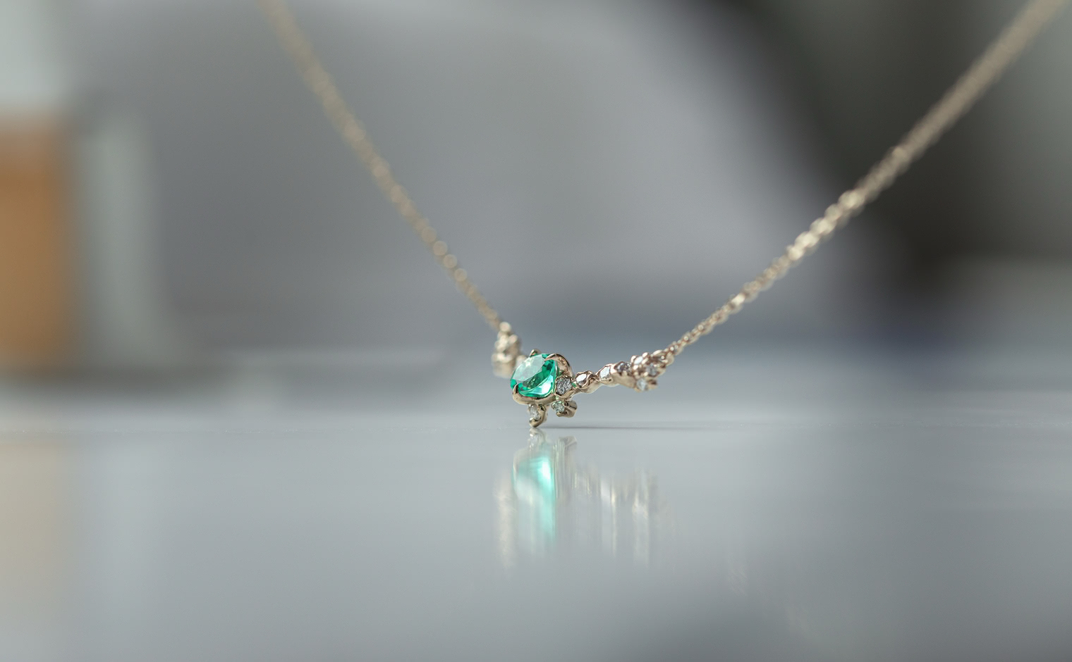 An emerald, vibrant and serene, its light unfolding with quiet elegance. The Curved Snowflake Necklace–Emerald reflects nature’s grace, a timeless whisper of beauty.