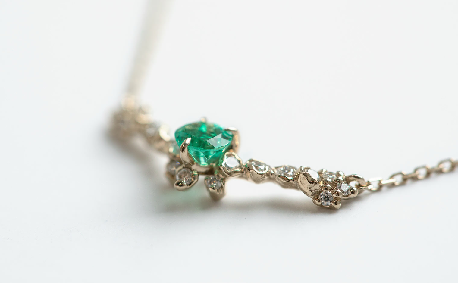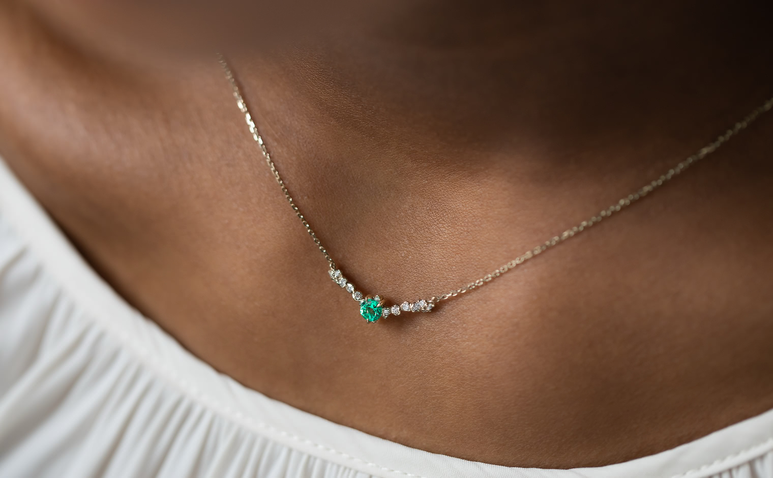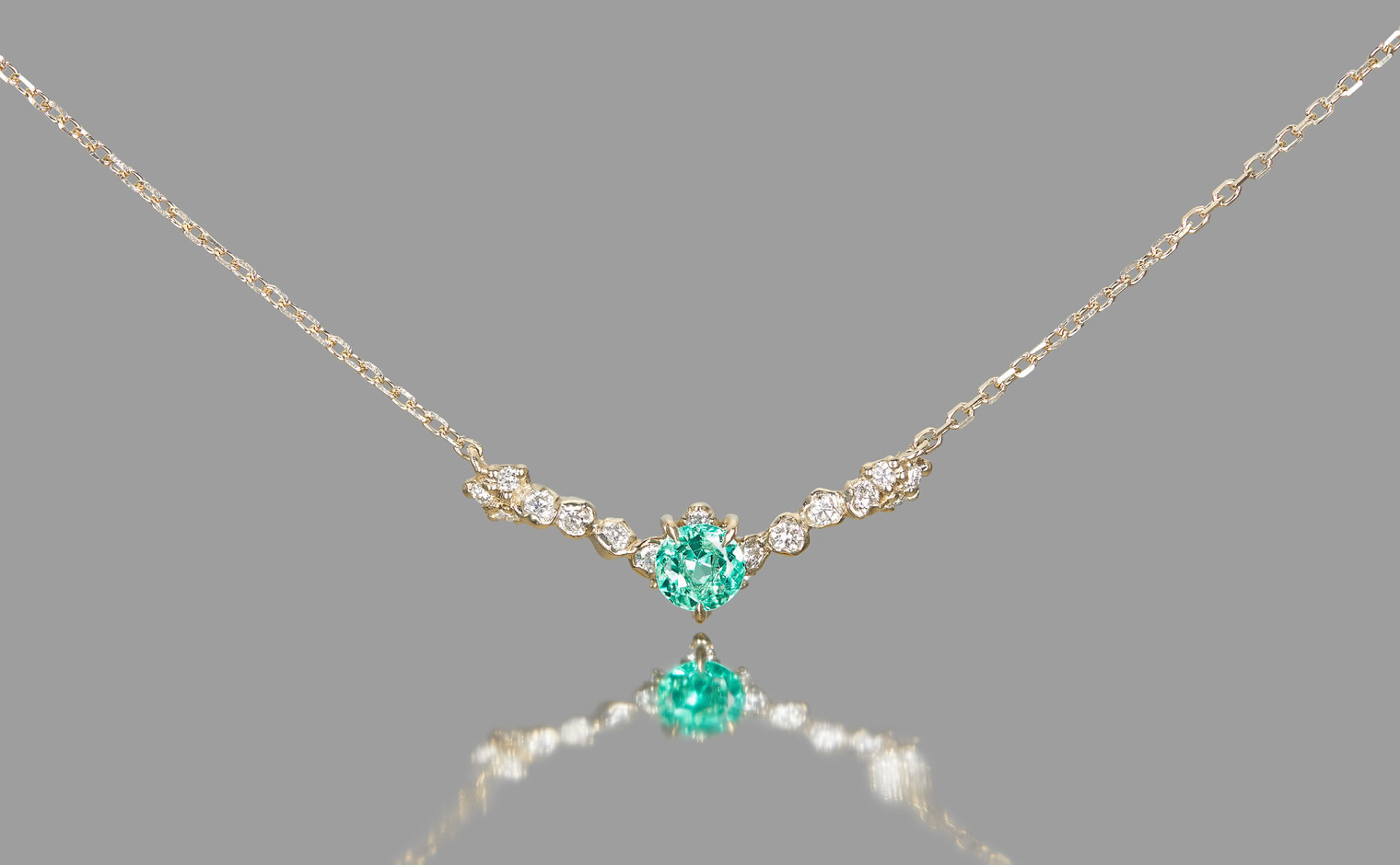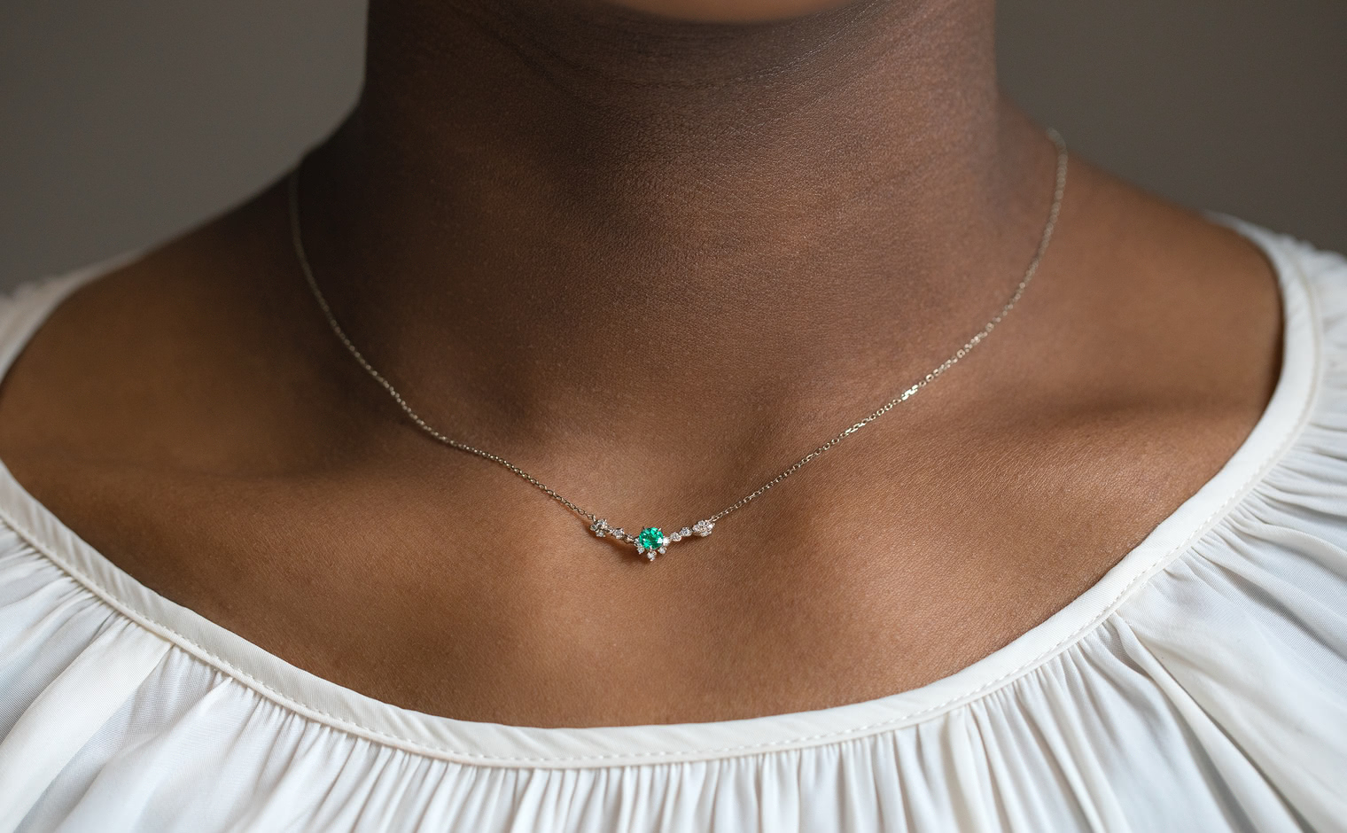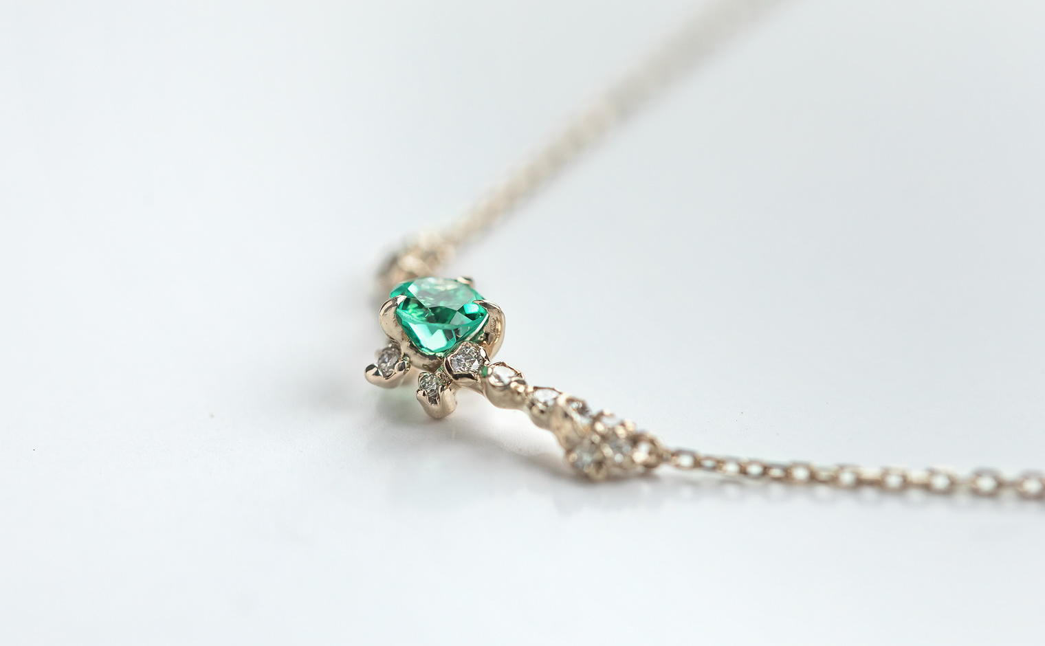 An emerald, vibrant and serene, its light unfolding with quiet elegance. The Curved Snowflake Necklace–Emerald reflects nature’s grace, a timeless whisper of beauty.