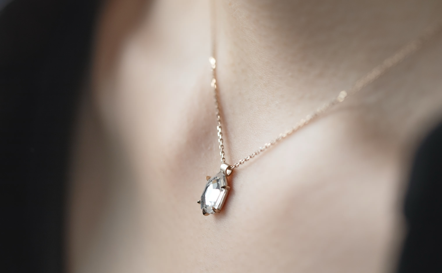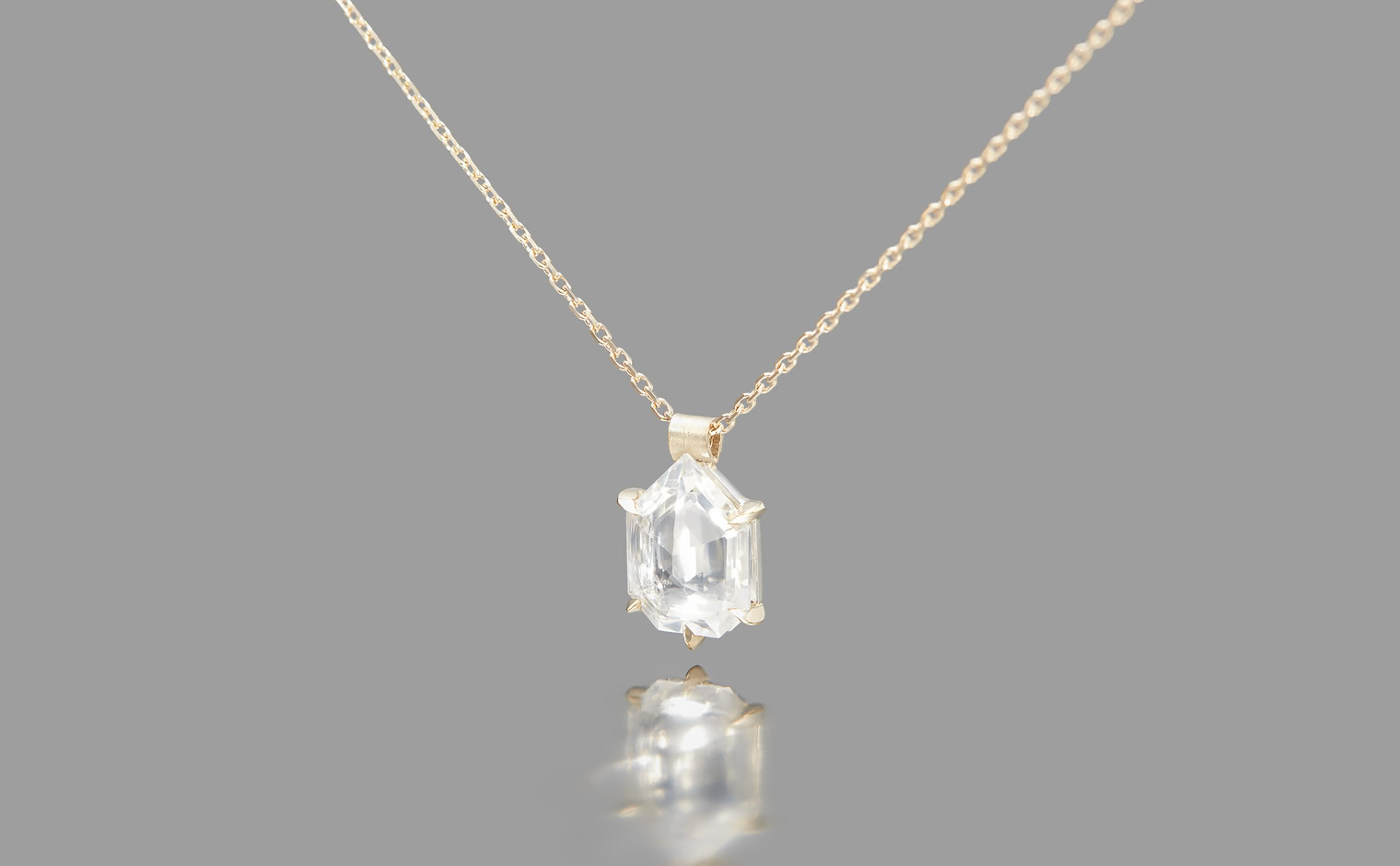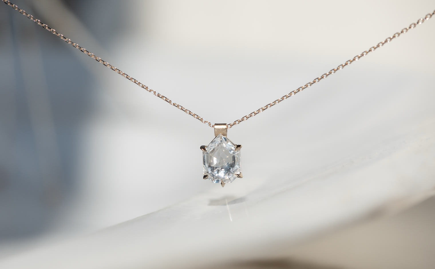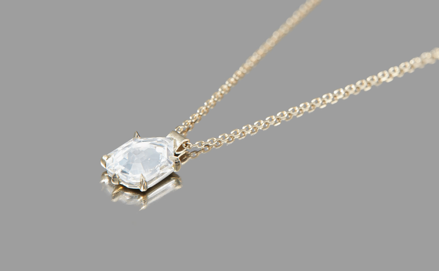 Capturing winter’s ethereal essence, the Escudo Necklace-Ice Drop embodies nature's quiet beauty. Its hand-cut white sapphire sits within platinum, hung from an beige gold adjustable chain, allowing it to rest near one's heart, echoing nature’s intimate whispers.