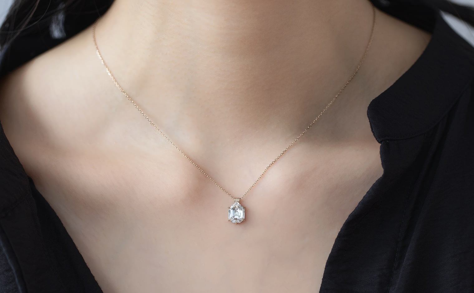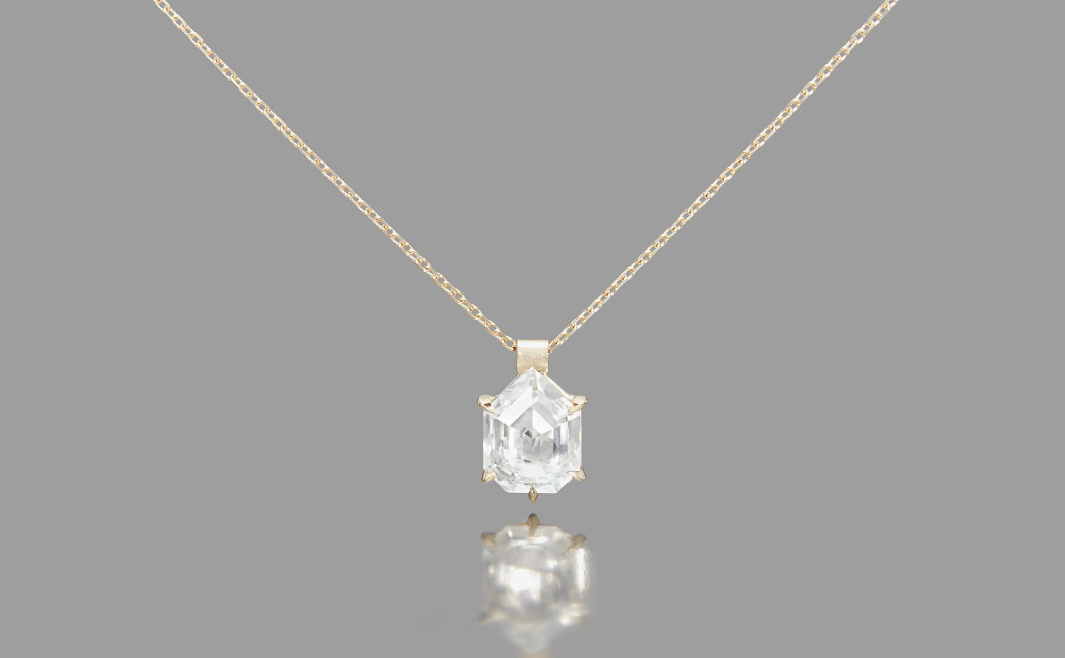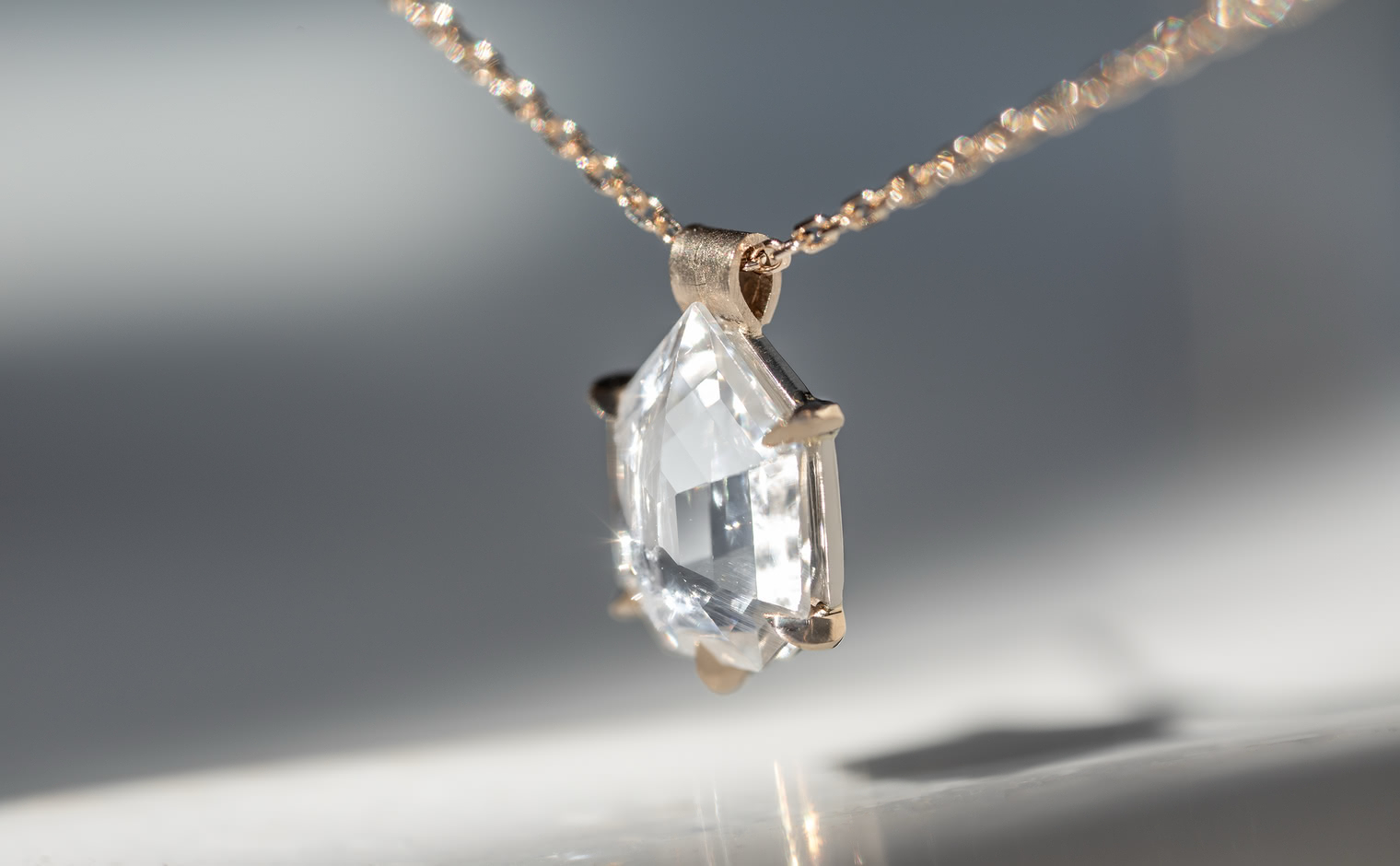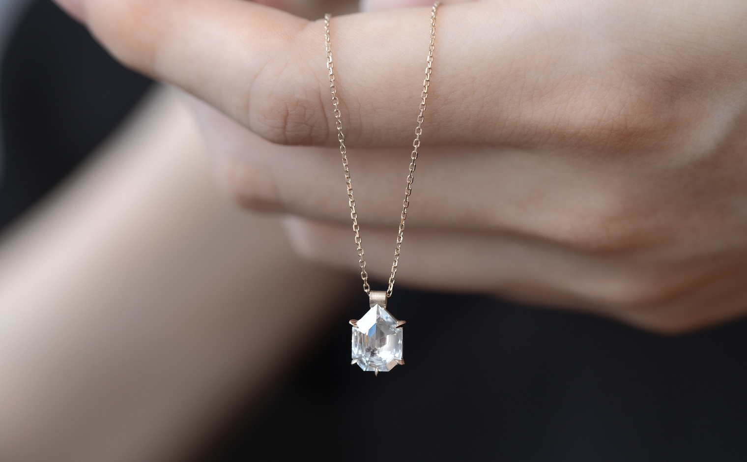 Capturing winter’s ethereal essence, the Escudo Necklace-Ice Drop embodies nature's quiet beauty. Its hand-cut white sapphire sits within platinum, hung from an beige gold adjustable chain, allowing it to rest near one's heart, echoing nature’s intimate whispers.