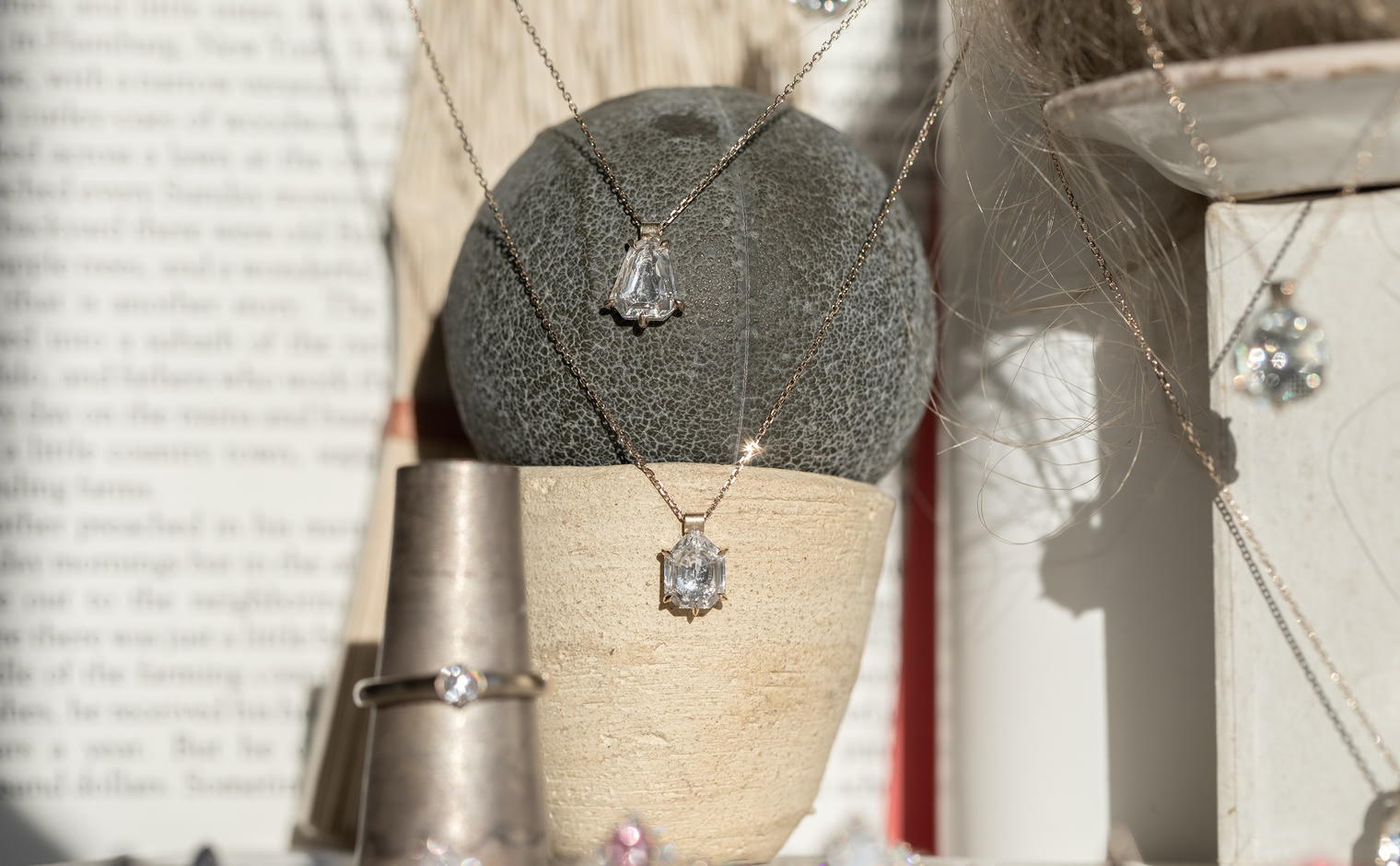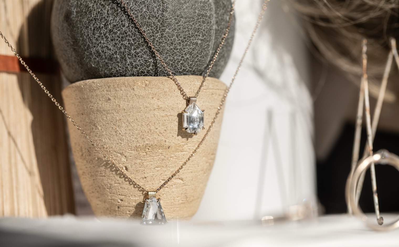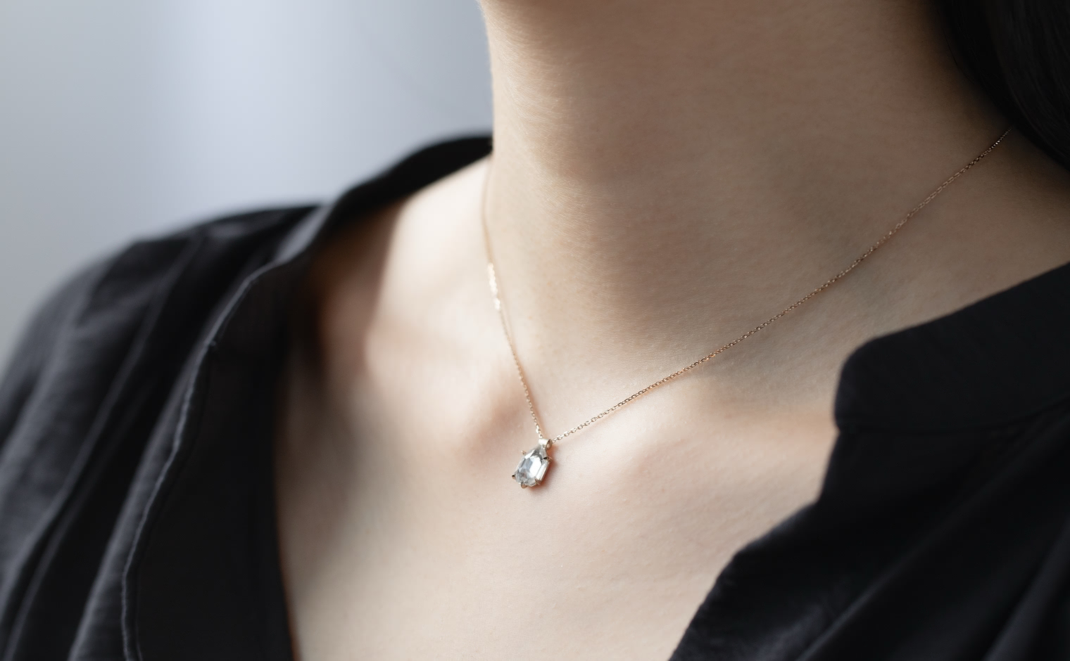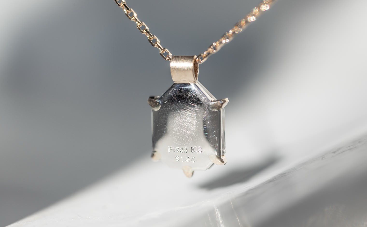Capturing winter’s ethereal essence, the Escudo Necklace-Ice Drop embodies nature's quiet beauty. Its hand-cut white sapphire sits within platinum, hung from an beige gold adjustable chain, allowing it to rest near one's heart, echoing nature’s intimate whispers.