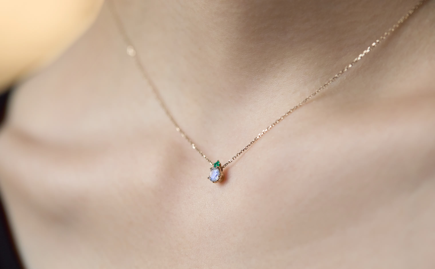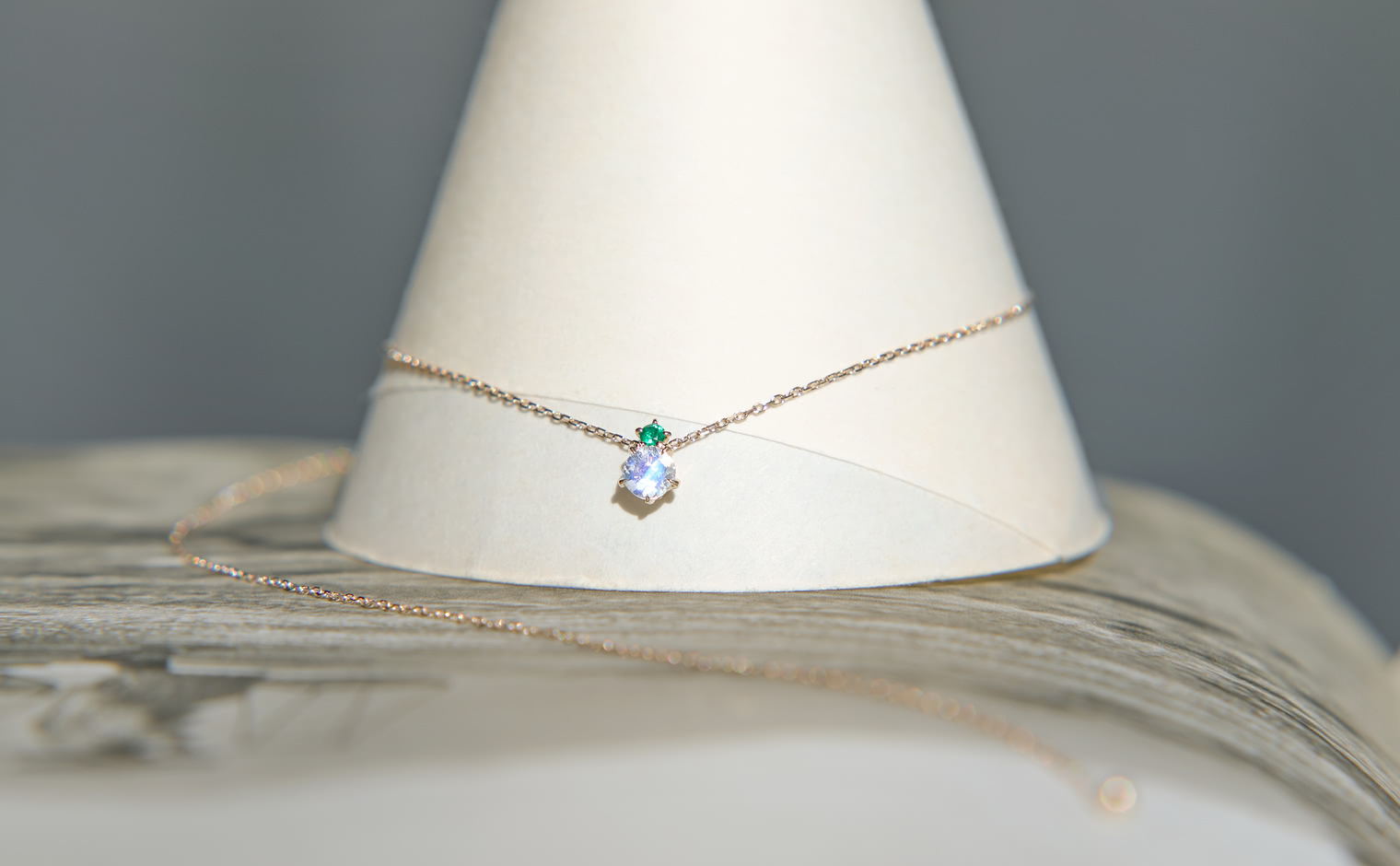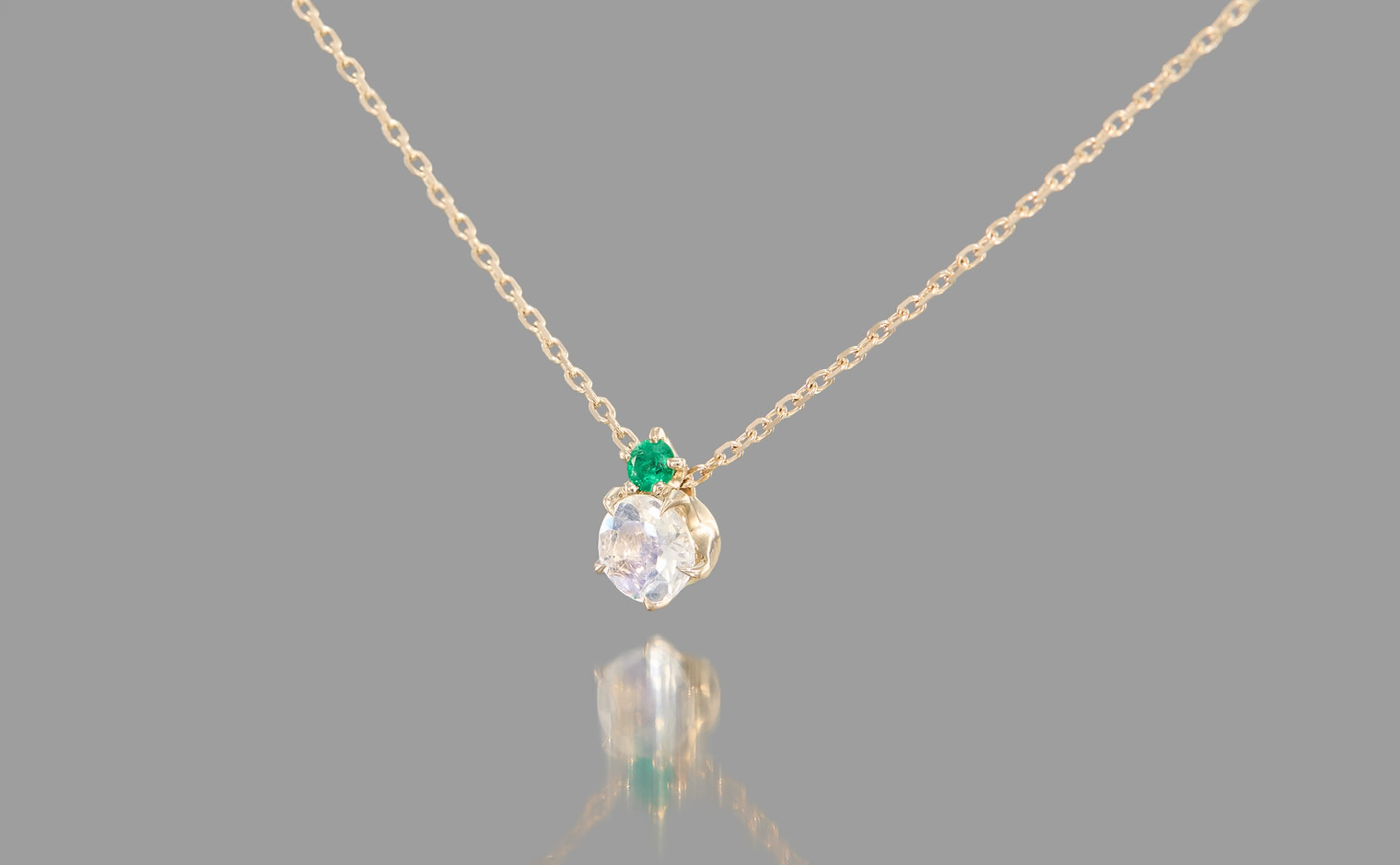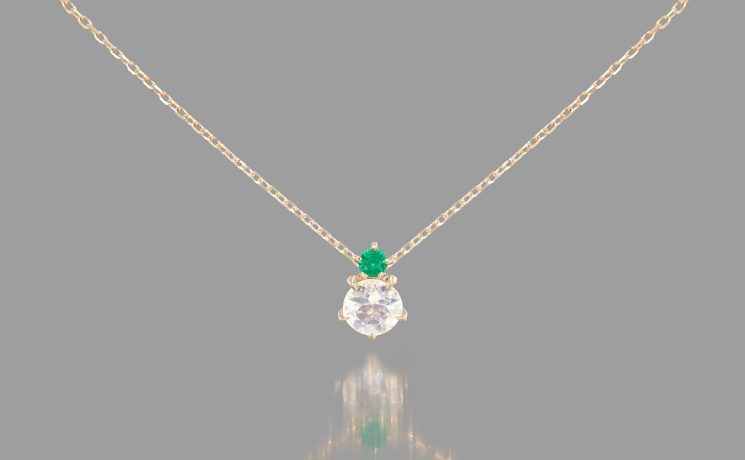A glowing rainbow moonstone, crowned with a vivid emerald, rests effortlessly on a silken chain. The interplay of vibrant green and soft iridescence evokes a sense of harmony, making this creation a celebration of nature’s quiet elegance.