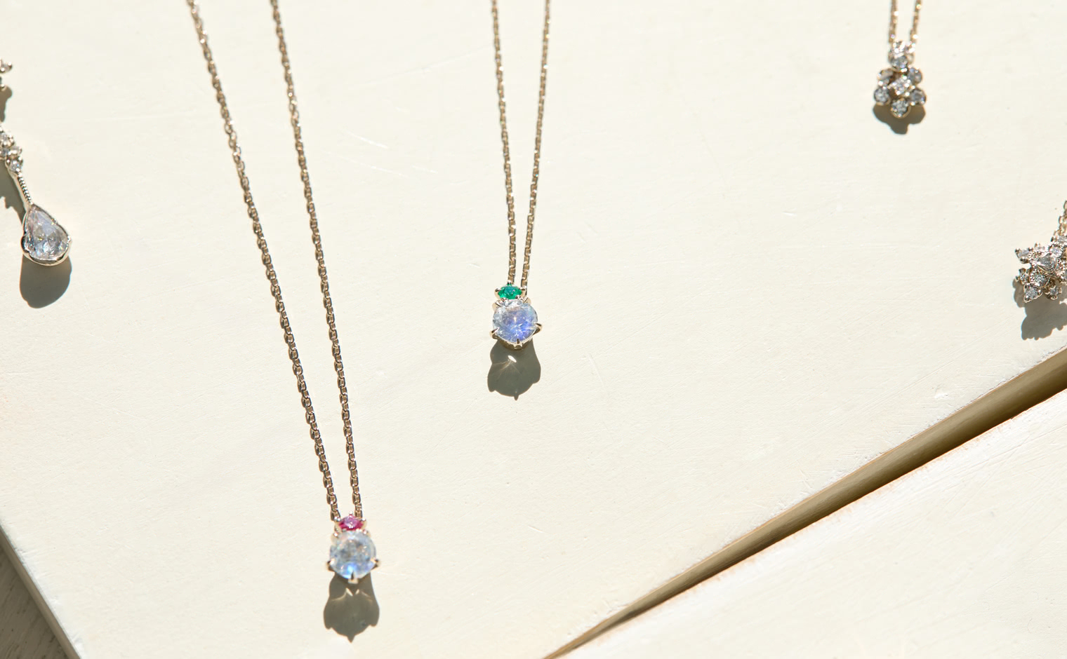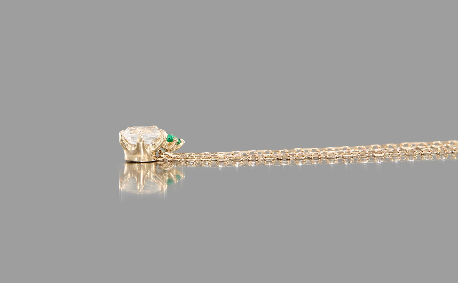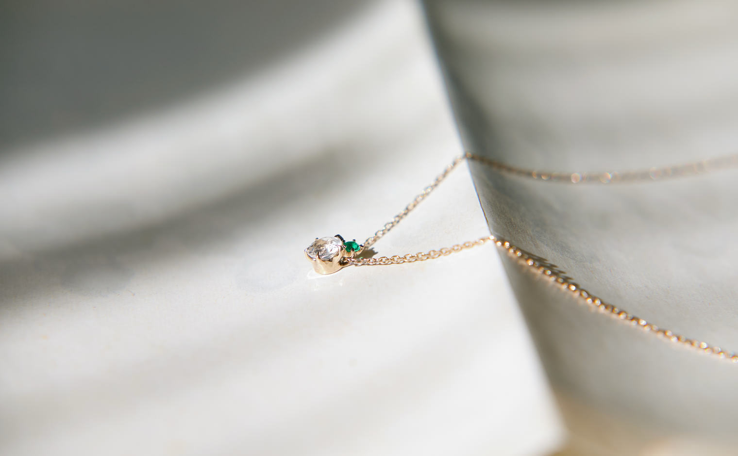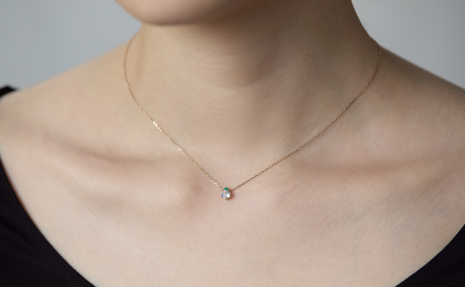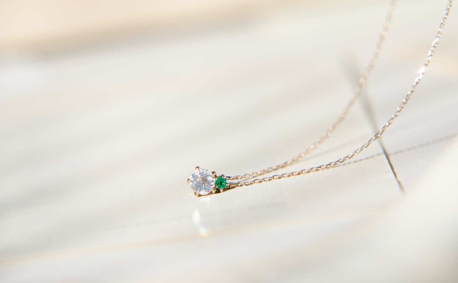 A glowing rainbow moonstone, crowned with a vivid emerald, rests effortlessly on a silken chain. The interplay of vibrant green and soft iridescence evokes a sense of harmony, making this creation a celebration of nature’s quiet elegance.