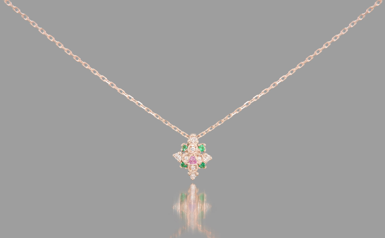 A delicate arrangement of pink sapphires, vibrant emeralds, and shimmering diamonds forms a graceful orchid bloom. Suspended from a slender, adjustable chain, the Orchid Necklace-Rainbow captures the quiet harmony of nature’s most vibrant hues.