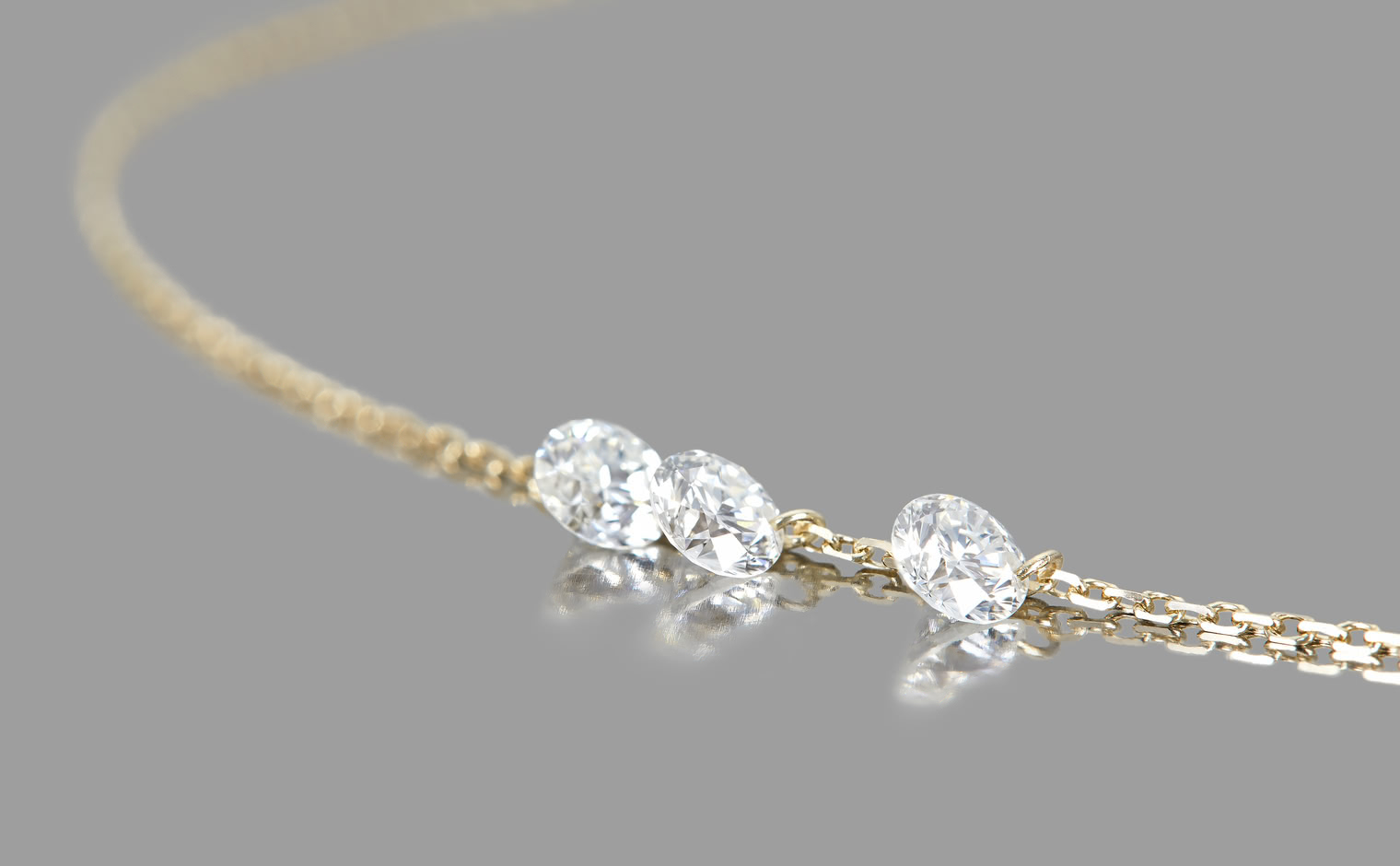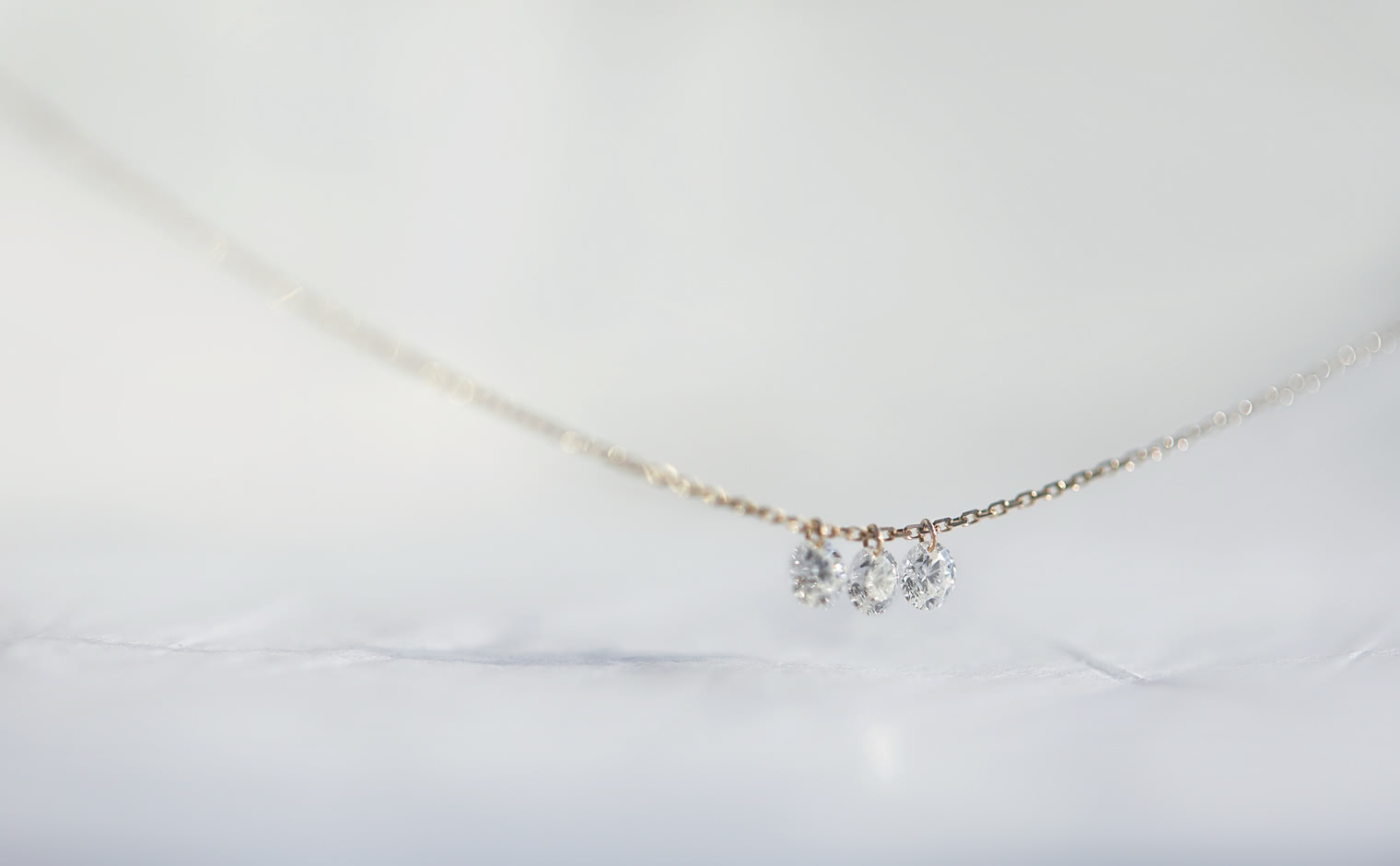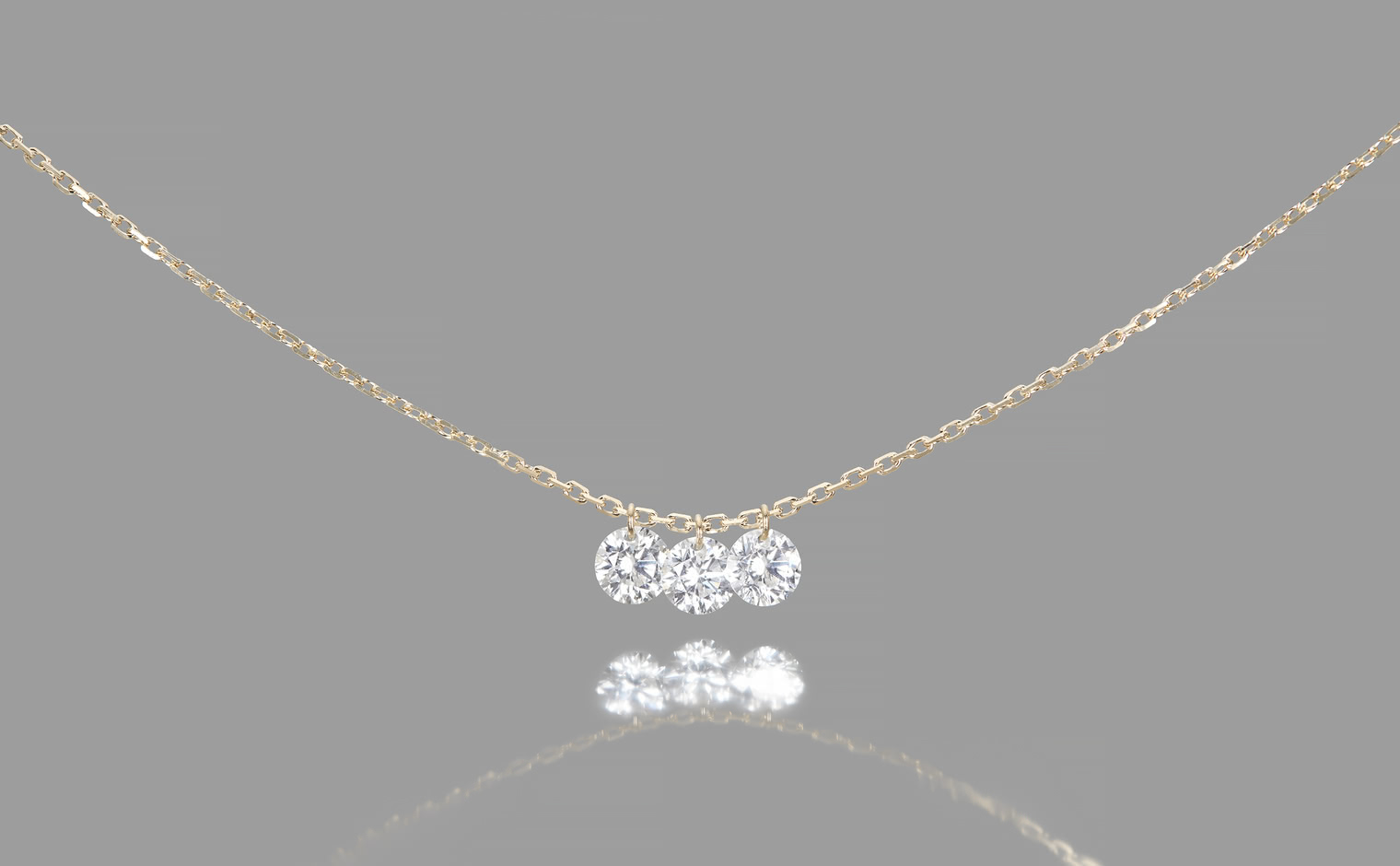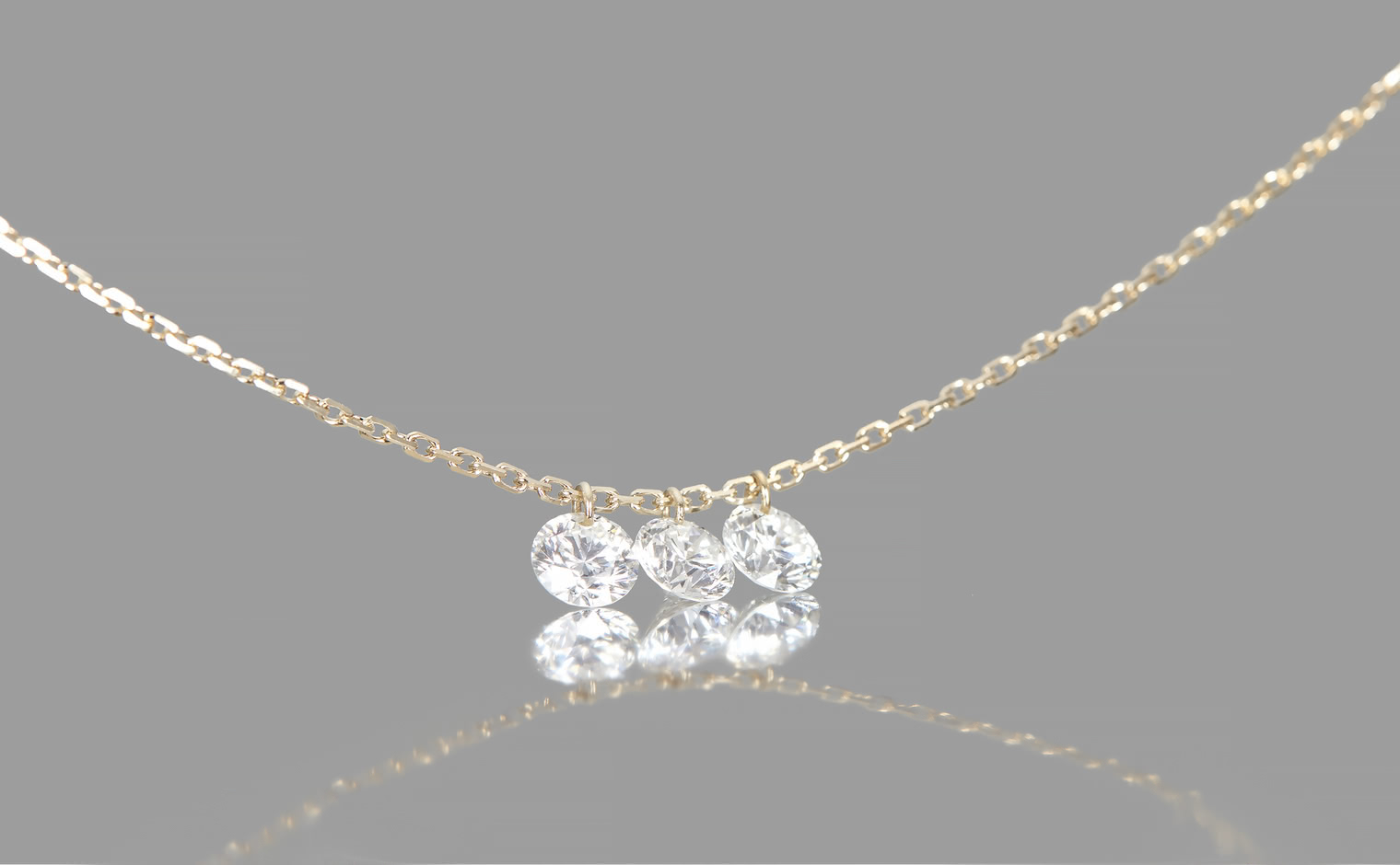 Three beautifully sparkling diamonds are expertly laser drilled and suspended from gleaming gold jump rings.