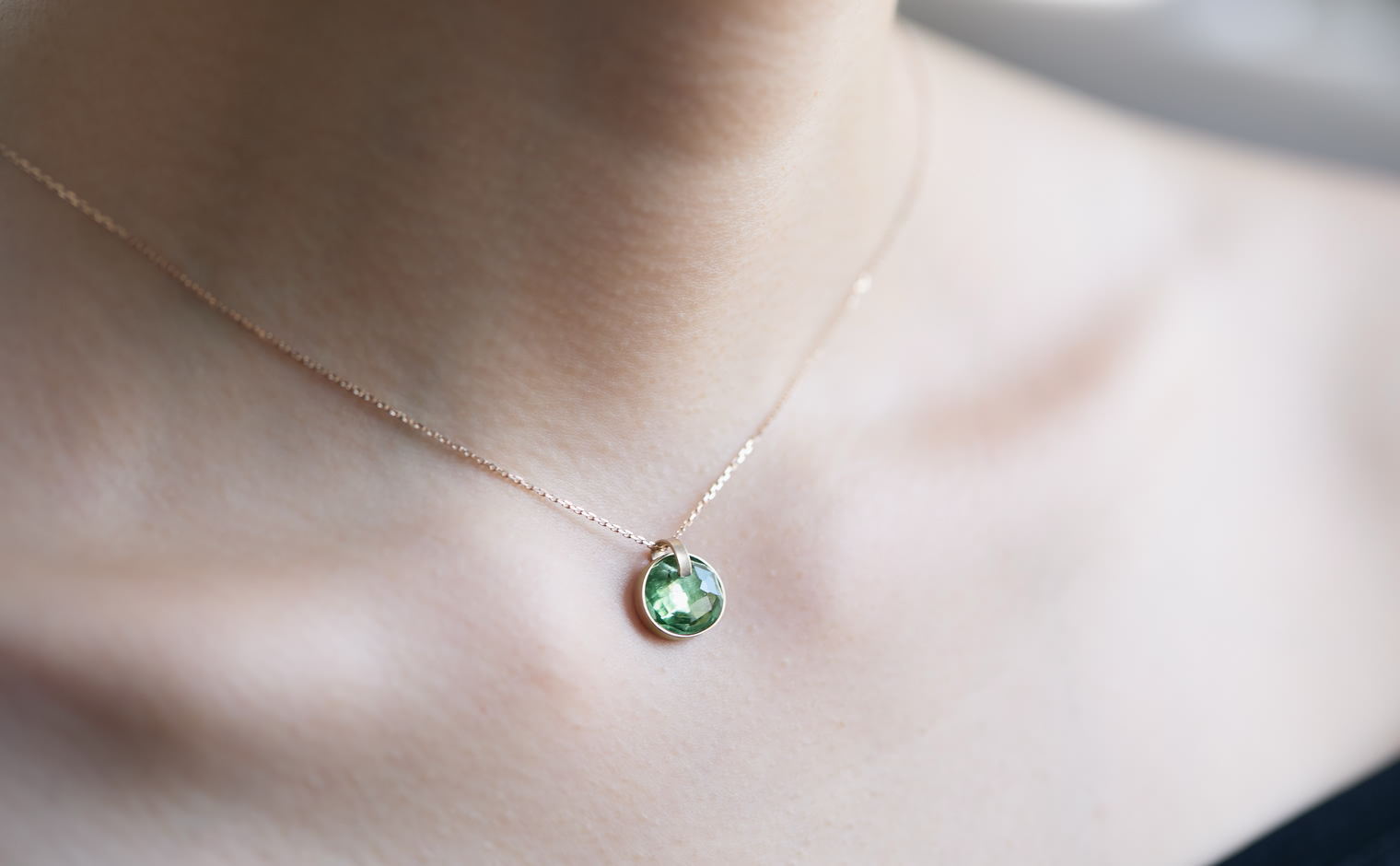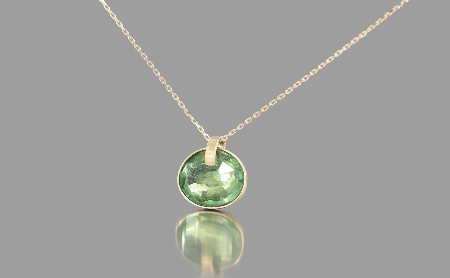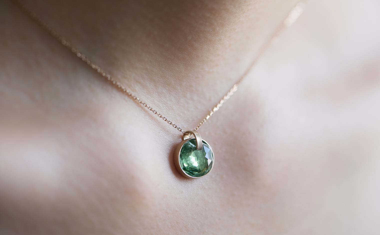 A tourmaline steeped in forested calm, its surface exuding quiet richness. The Verdance Tourmaline Necklace reflects serene depth, a subtle expression of grounding beauty and inner stillness.