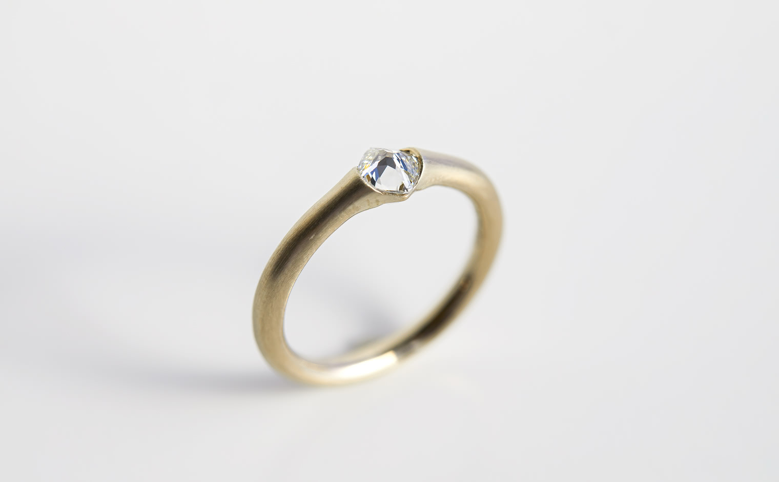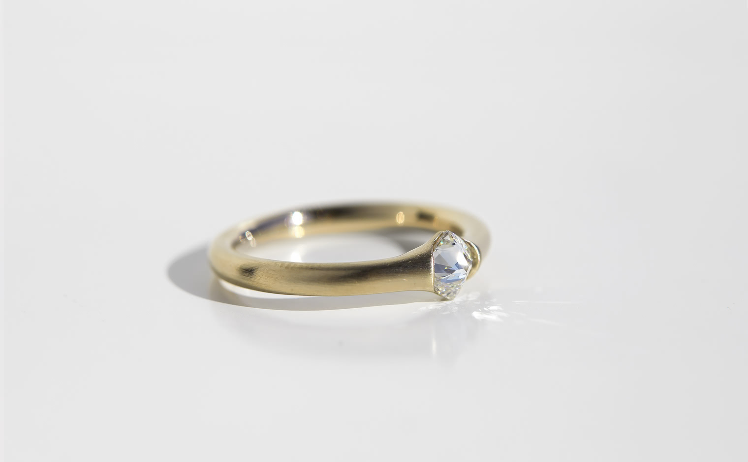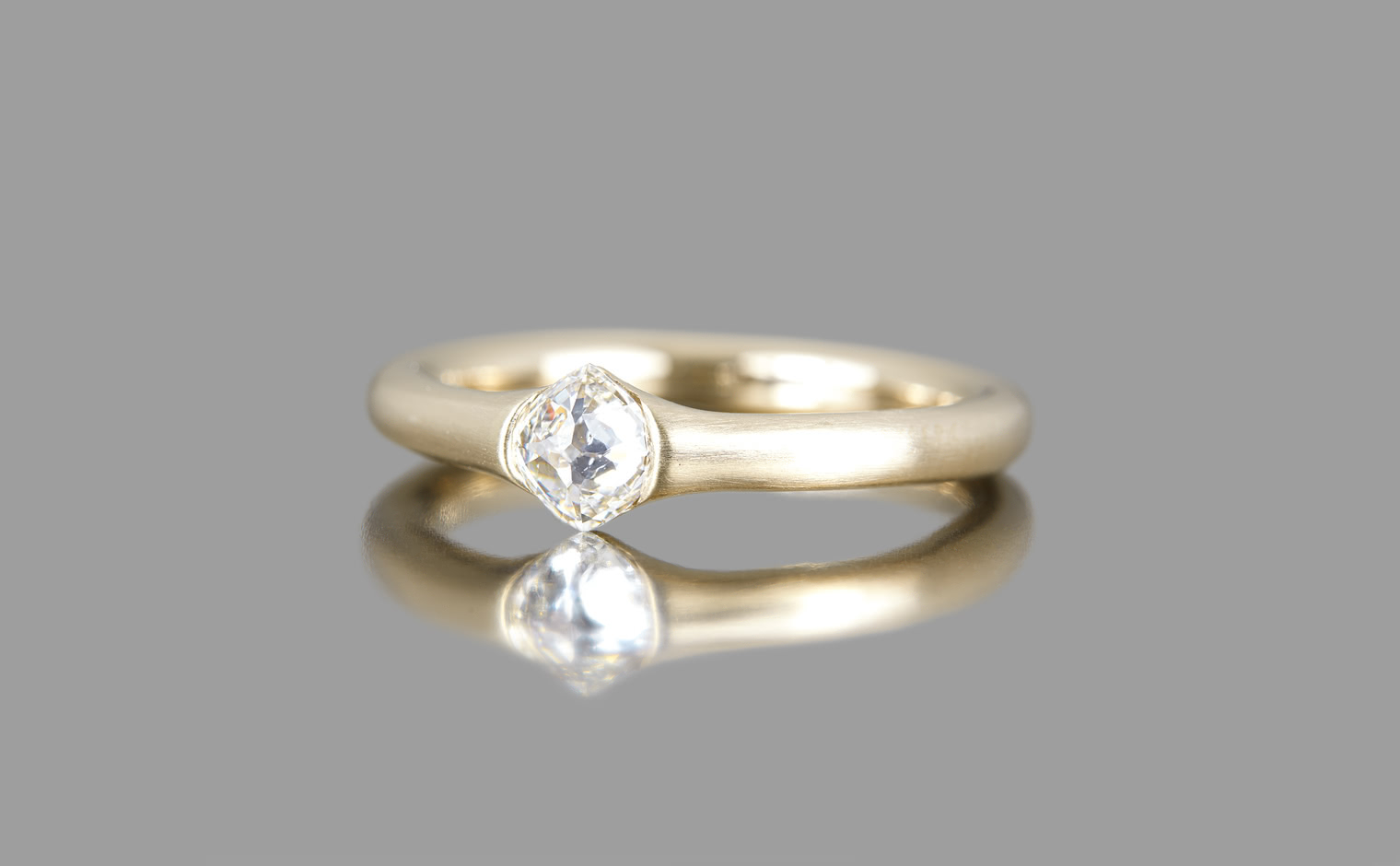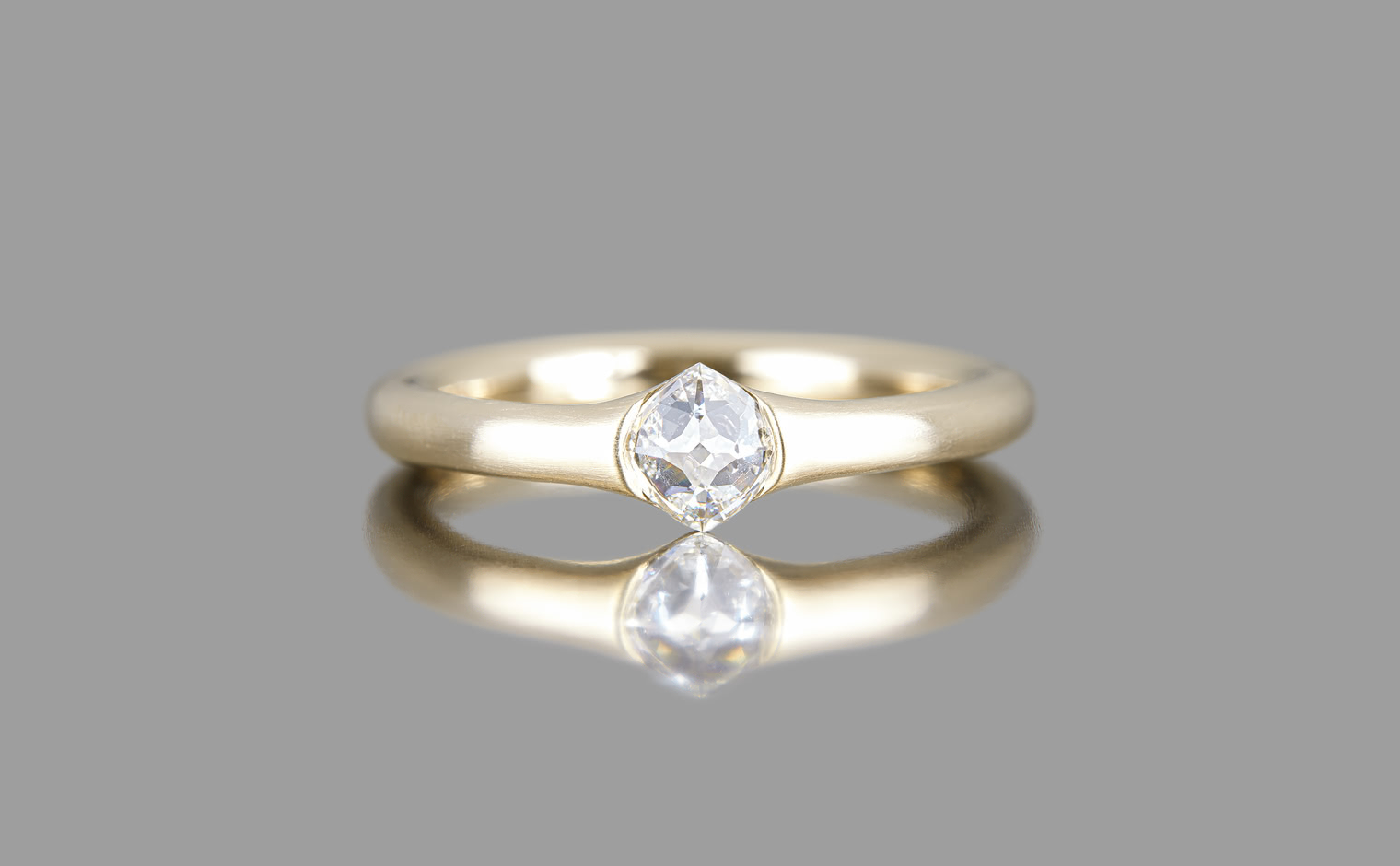 A Time for Pillow Talk. Let the radiant cushion-cut diamond take center stage as it nestles atop the delectable rose-cut diamond on a hand-polished beige gold band.