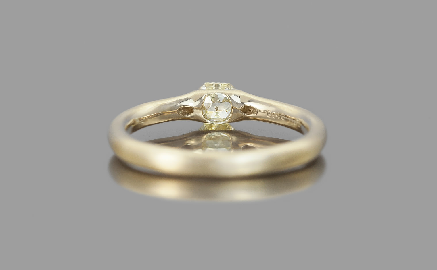 With an artistic approach, a smaller diamond is set back-to-back to the top diamond, resting against your finger and creating a seemingly endless depth in the stones.