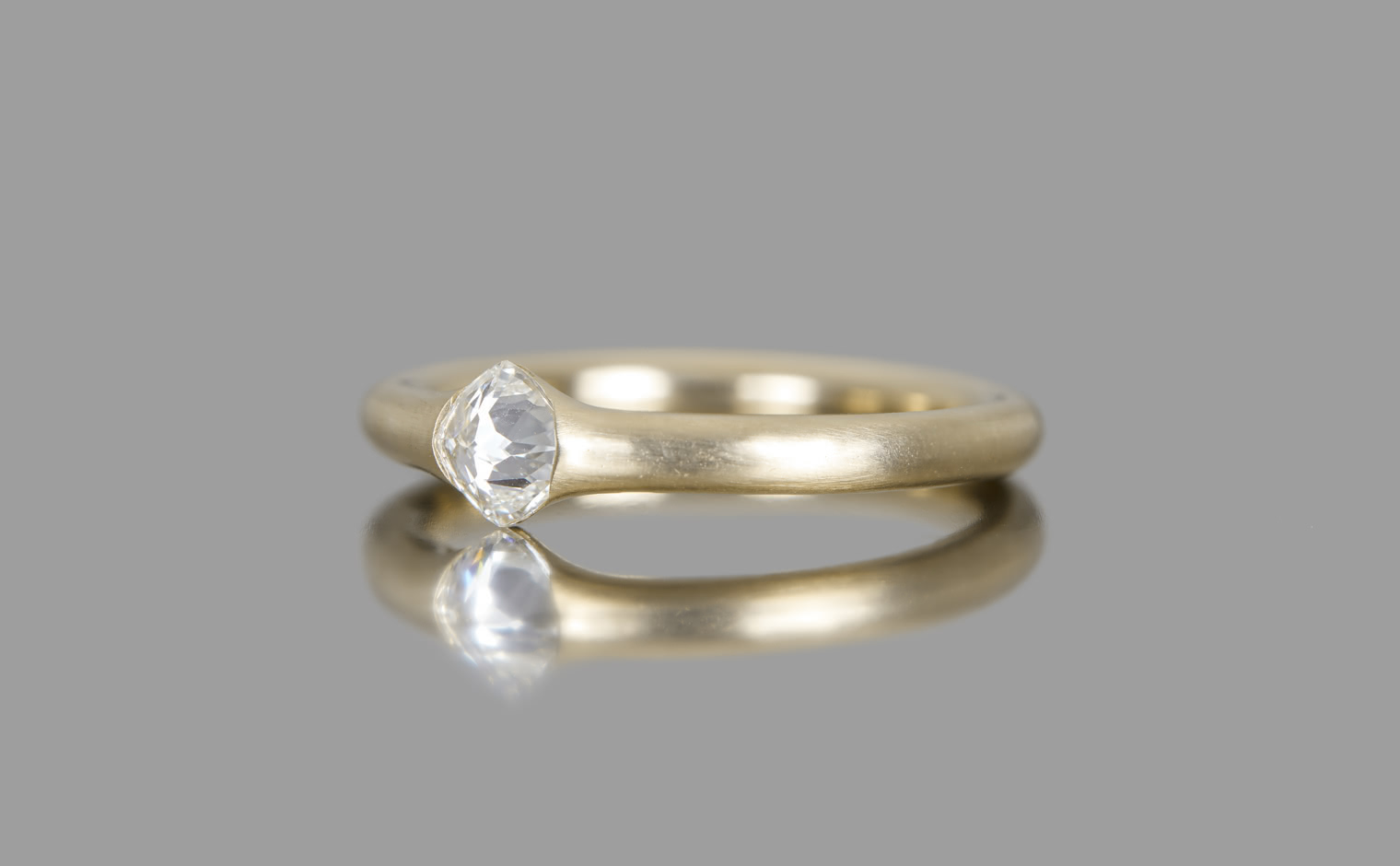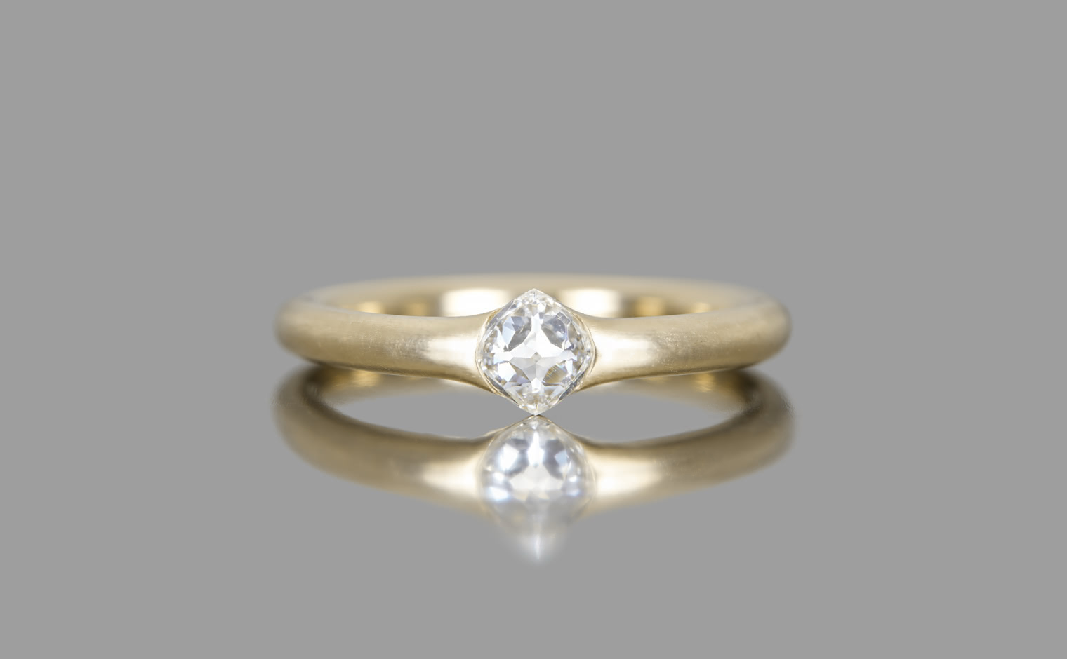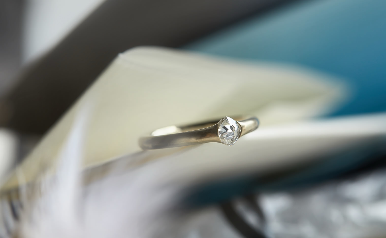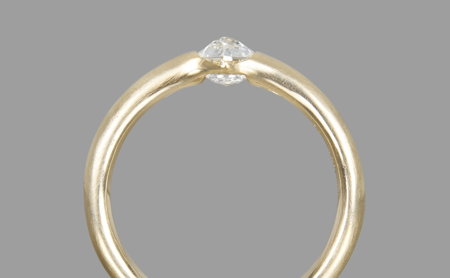 Back-to-back brilliance. With its two pristinely dazzling hand-cut diamonds set back-to-back with their culets exposed, one center and one under, embedded in the middle of a wide, partially polished band, the Diamond Adamas Ring–Iceberg denotes the timeless truth, that love must be strong and pure.