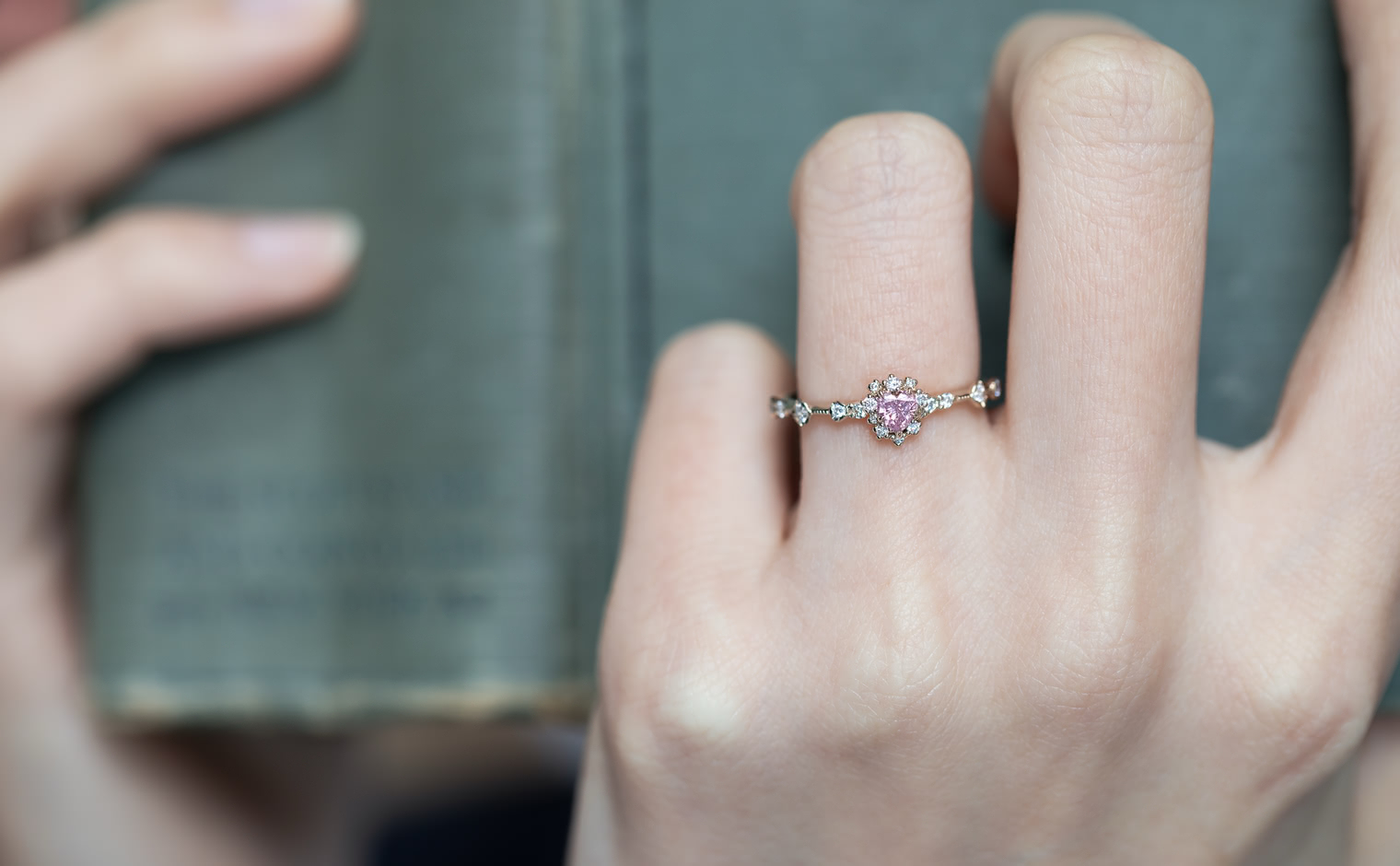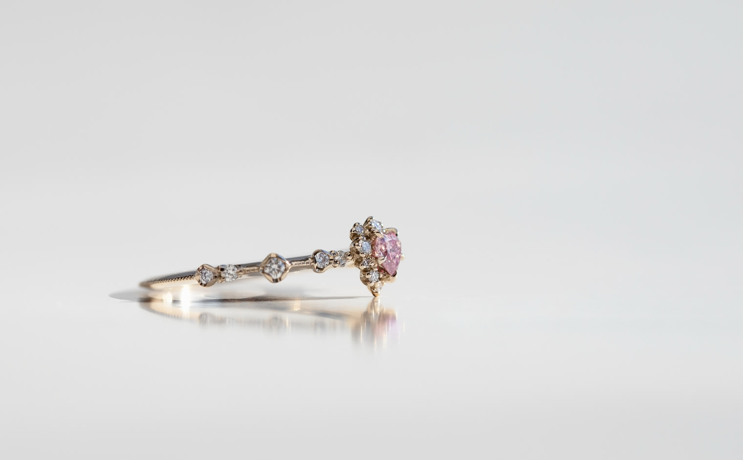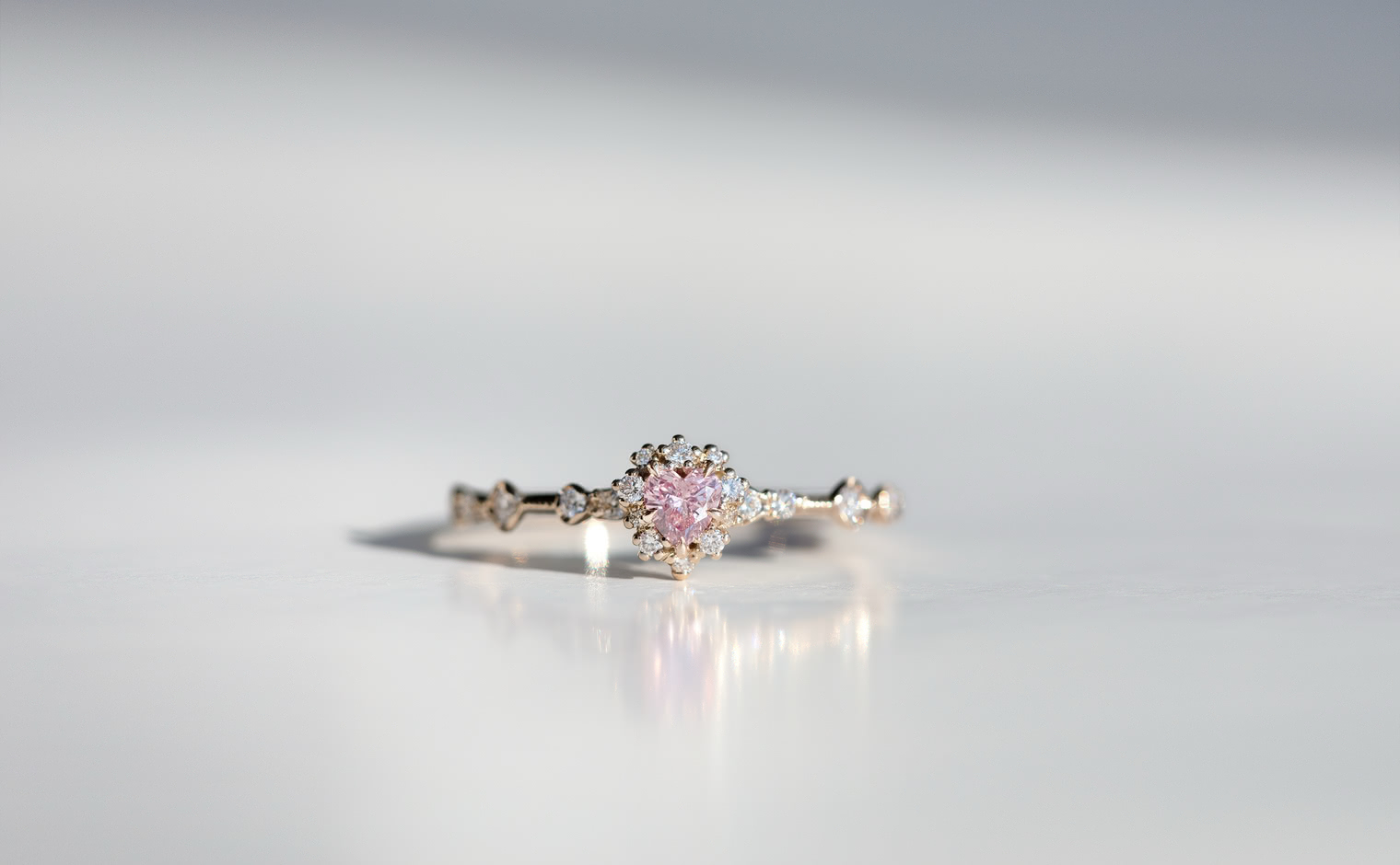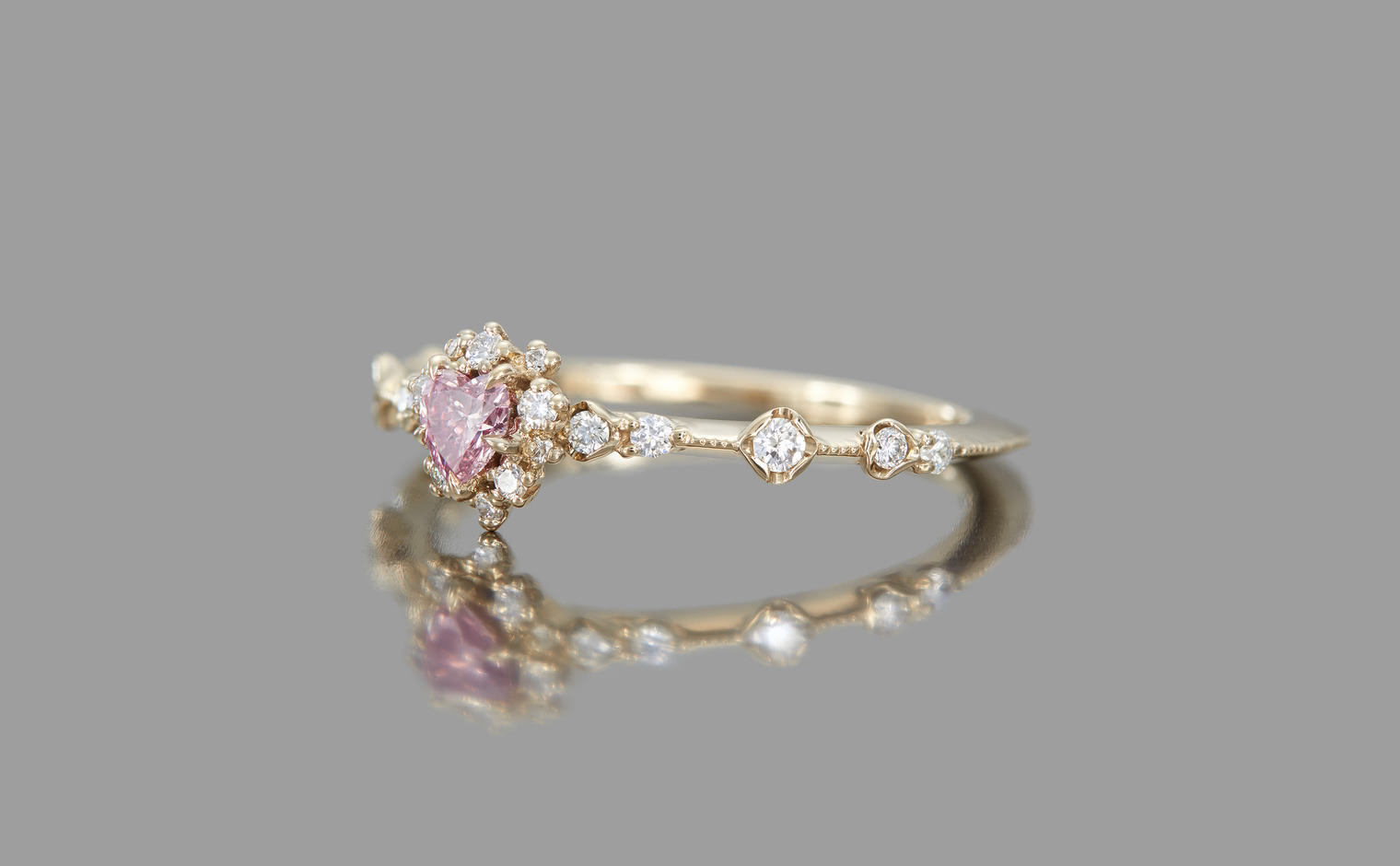 Indulge in the breathtaking beauty of the Argyle Heart Ring, reminiscent of a blooming pink rose in the midst of winter's snowfall. The exquisite pink diamond center, surrounded by luminous white diamond accents, is set on a slim milgrain-finished band that feels as soft as silk on your finger.