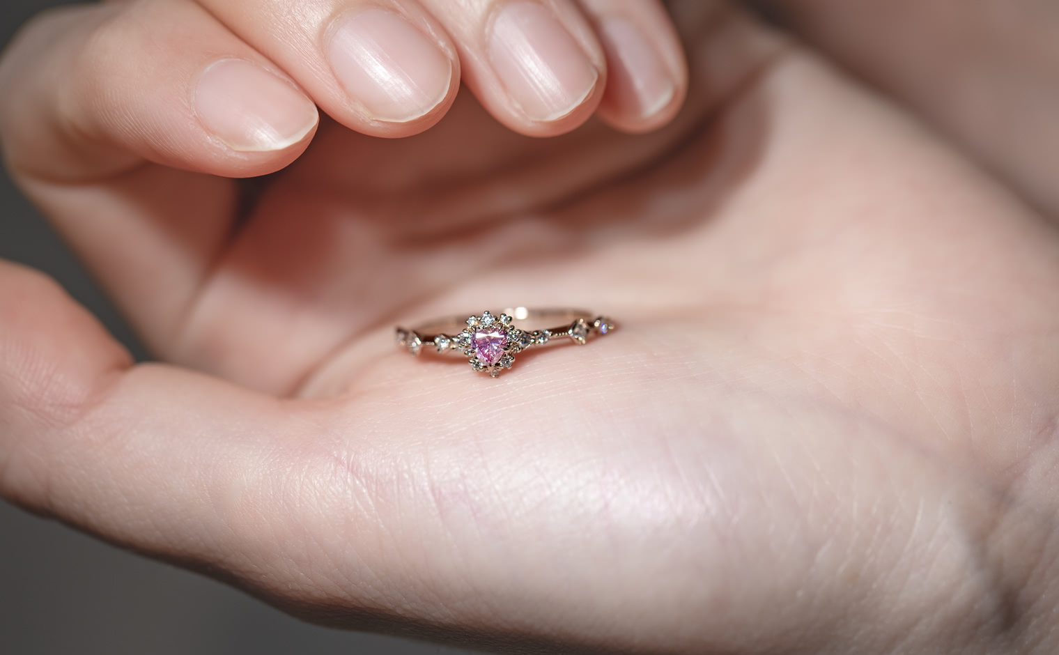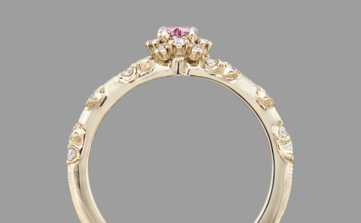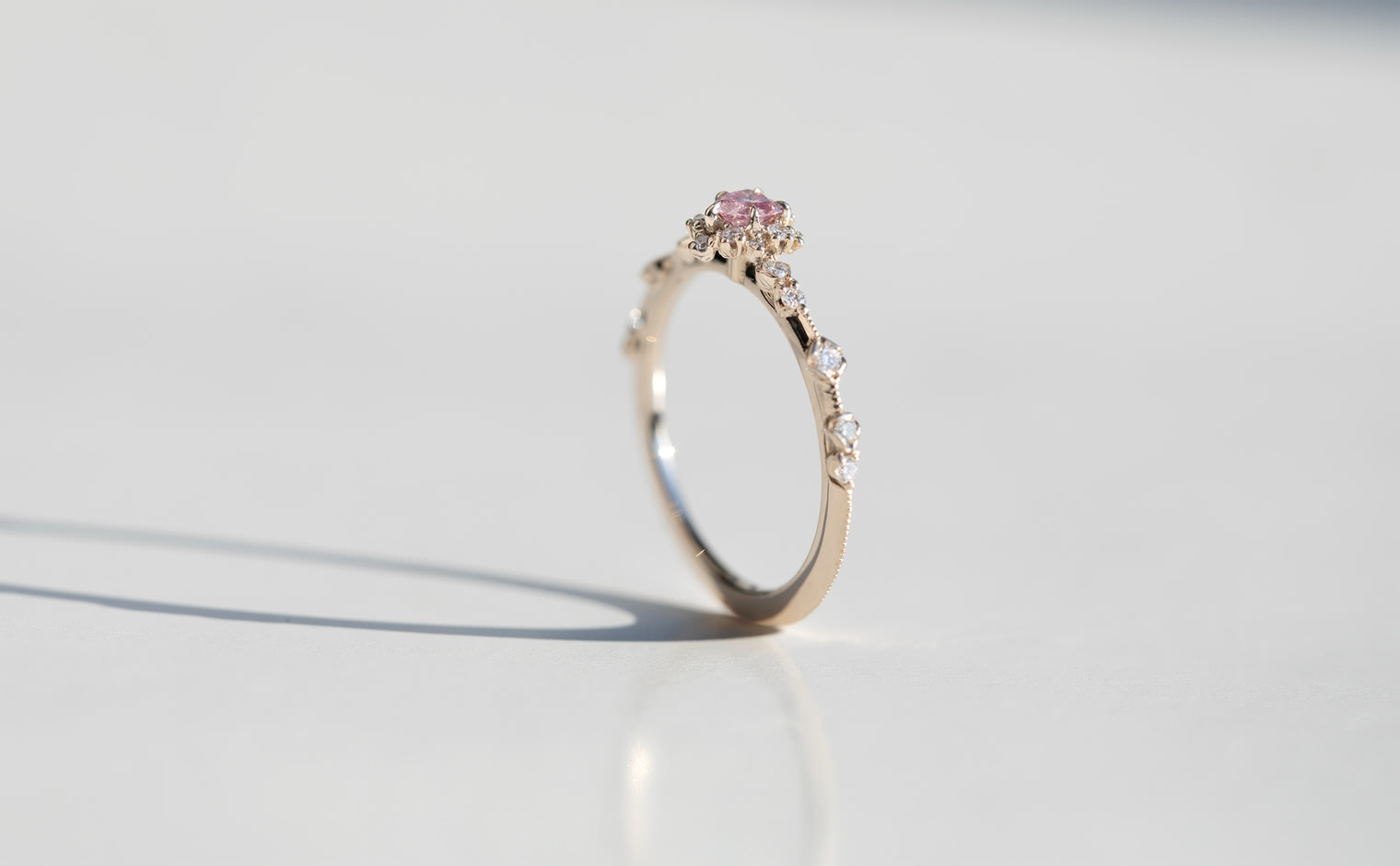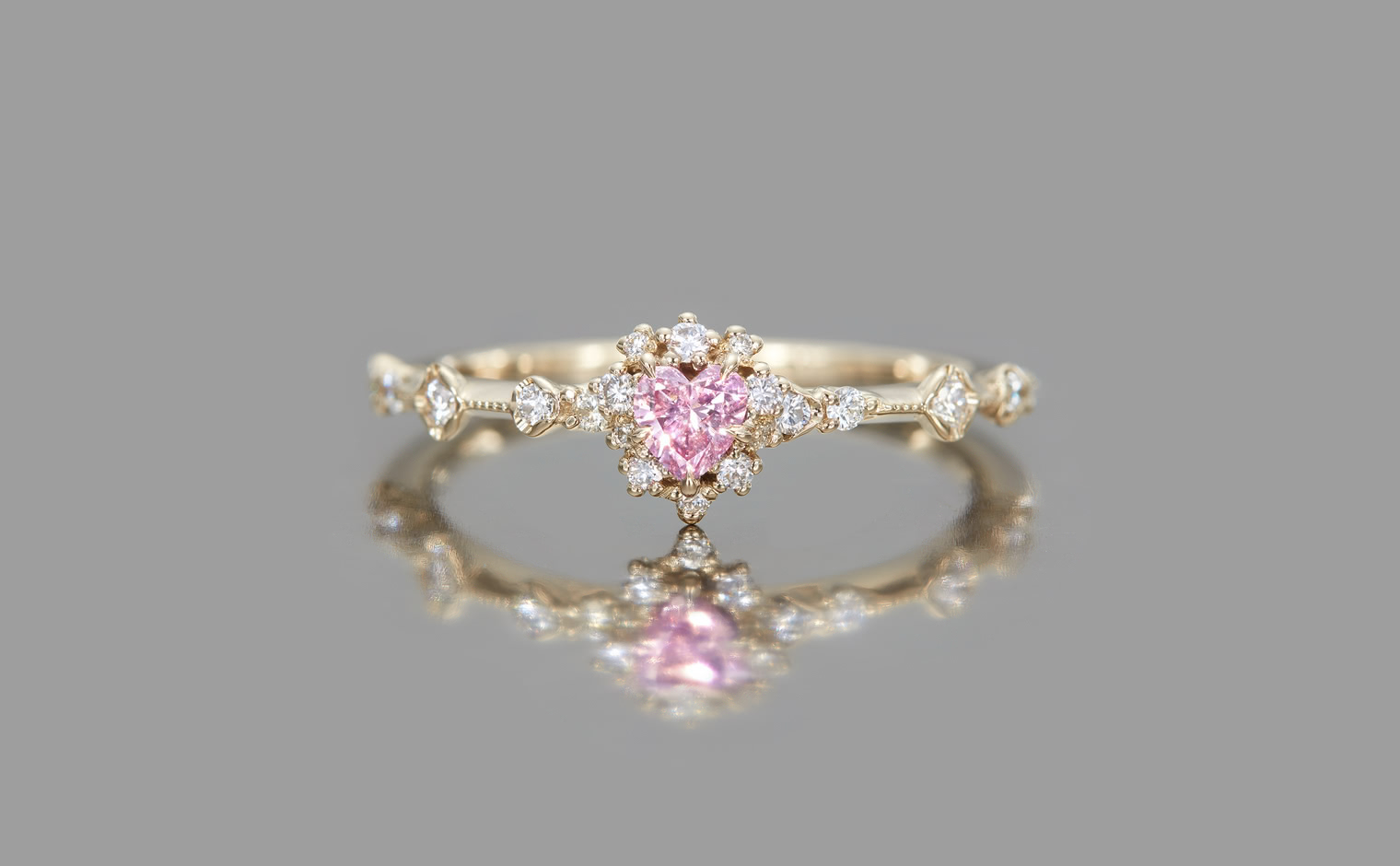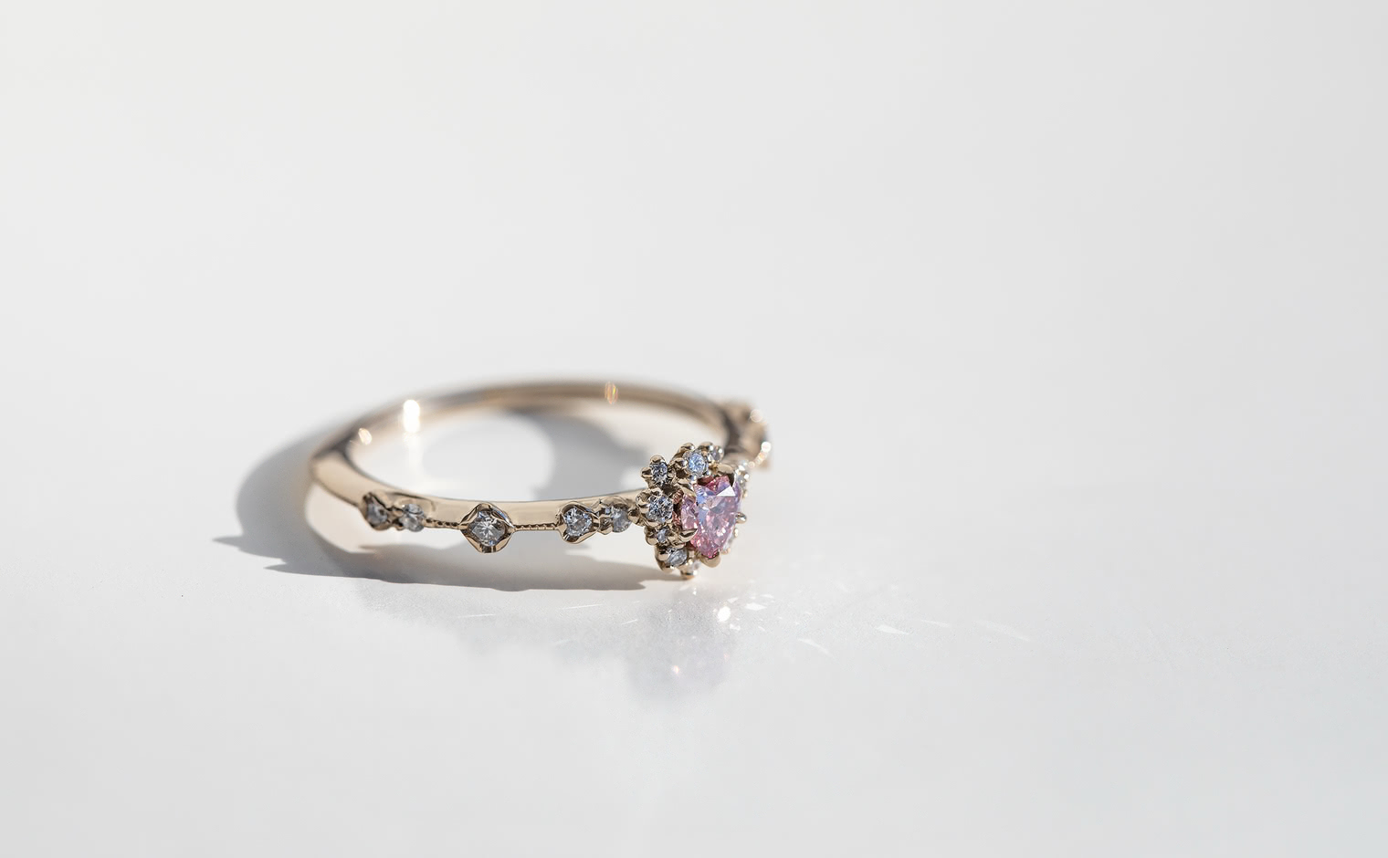 Indulge in the breathtaking beauty of the Argyle Heart Ring, reminiscent of a blooming pink rose in the midst of winter's snowfall. The exquisite pink diamond center, surrounded by luminous white diamond accents, is set on a slim milgrain-finished band that feels as soft as silk on your finger.