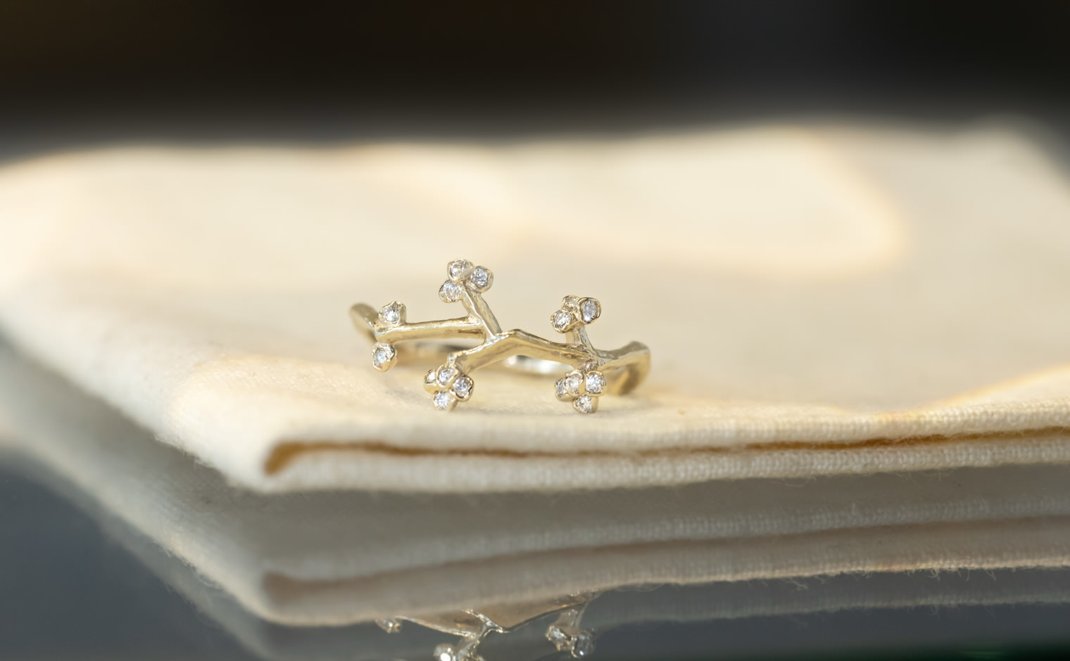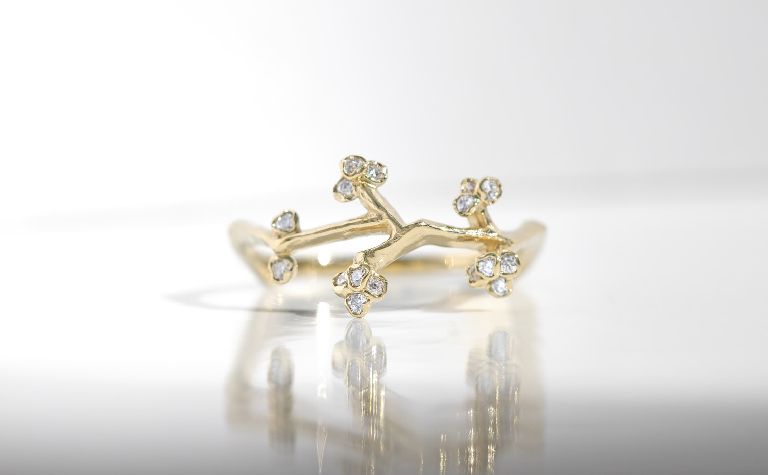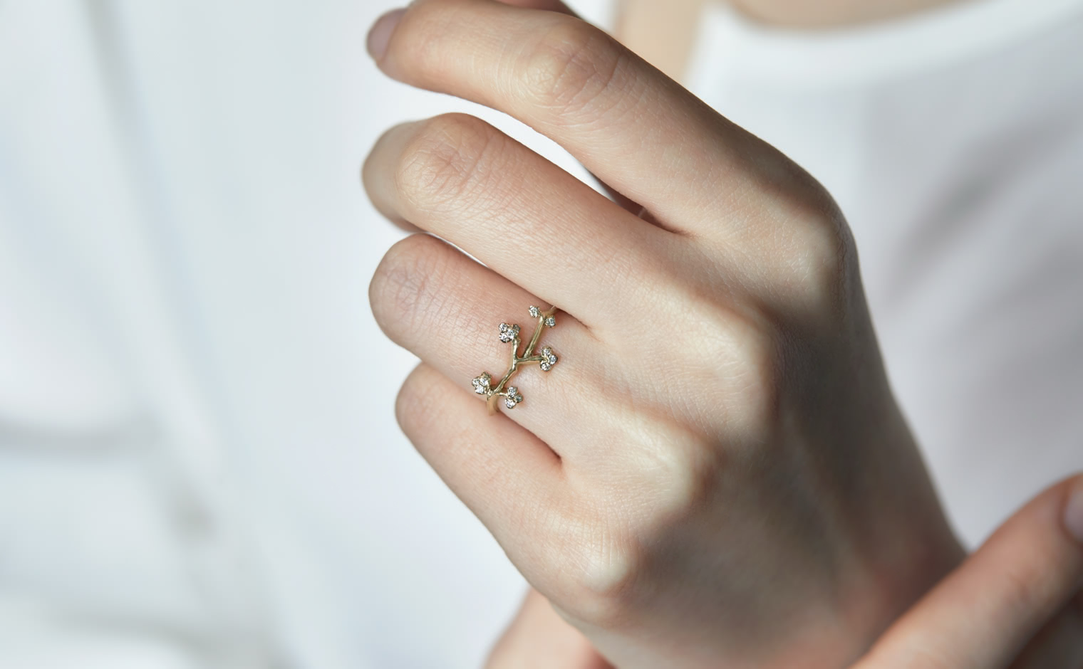 A delicate dance of light, where diamonds trace the essence of nature’s grace. The Branches Ring reflects organic artistry—a luminous expression of movement, elegance, and quiet sophistication.