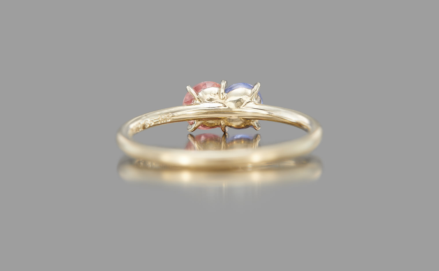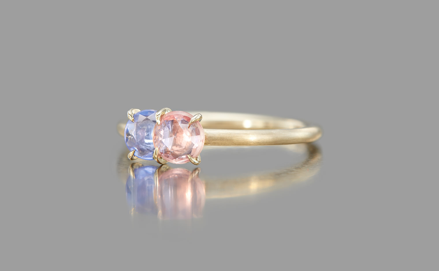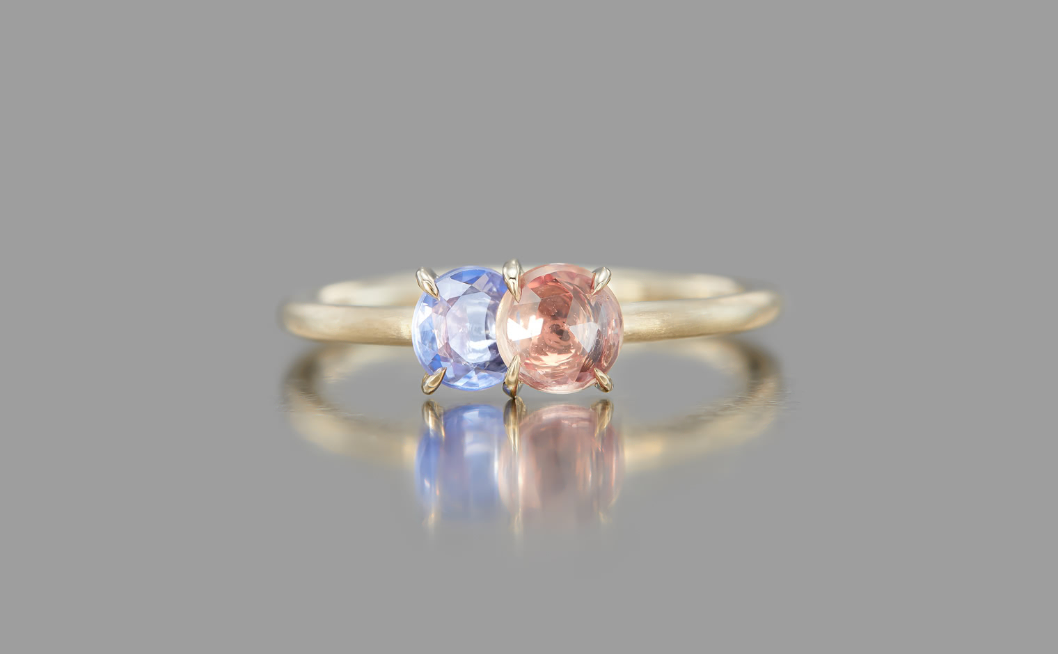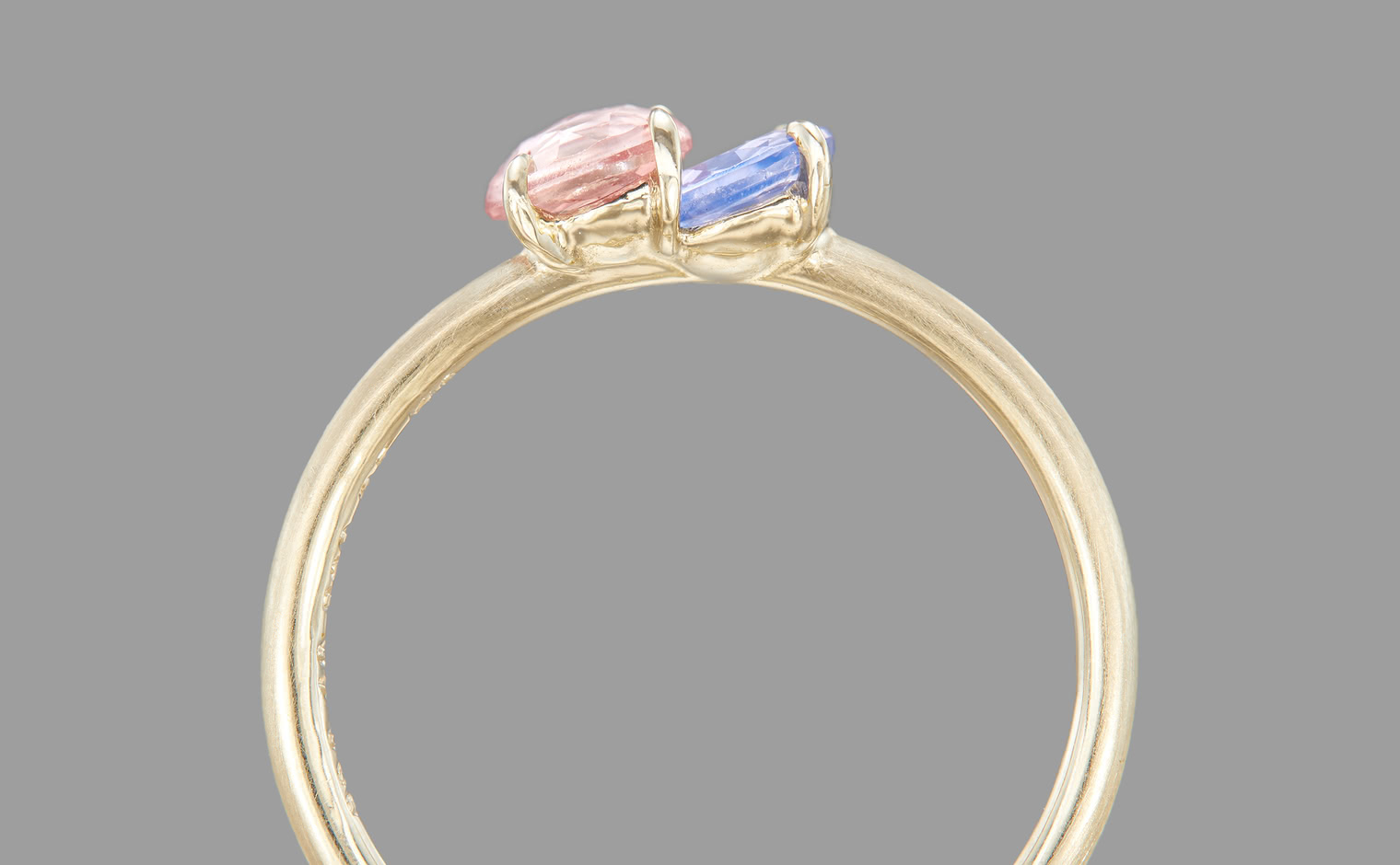 The Sweet Colors of a Setting Sky. Featuring the soft radiance of a round pink sapphire and the lustrous allure of a round purple sapphire as they nestled delicately on a semi-polished cylindrical beige gold band. The Calyx Ring-Pink & Purple Sapphire captures the essence of a mesmerizing horizon in its full radiance.