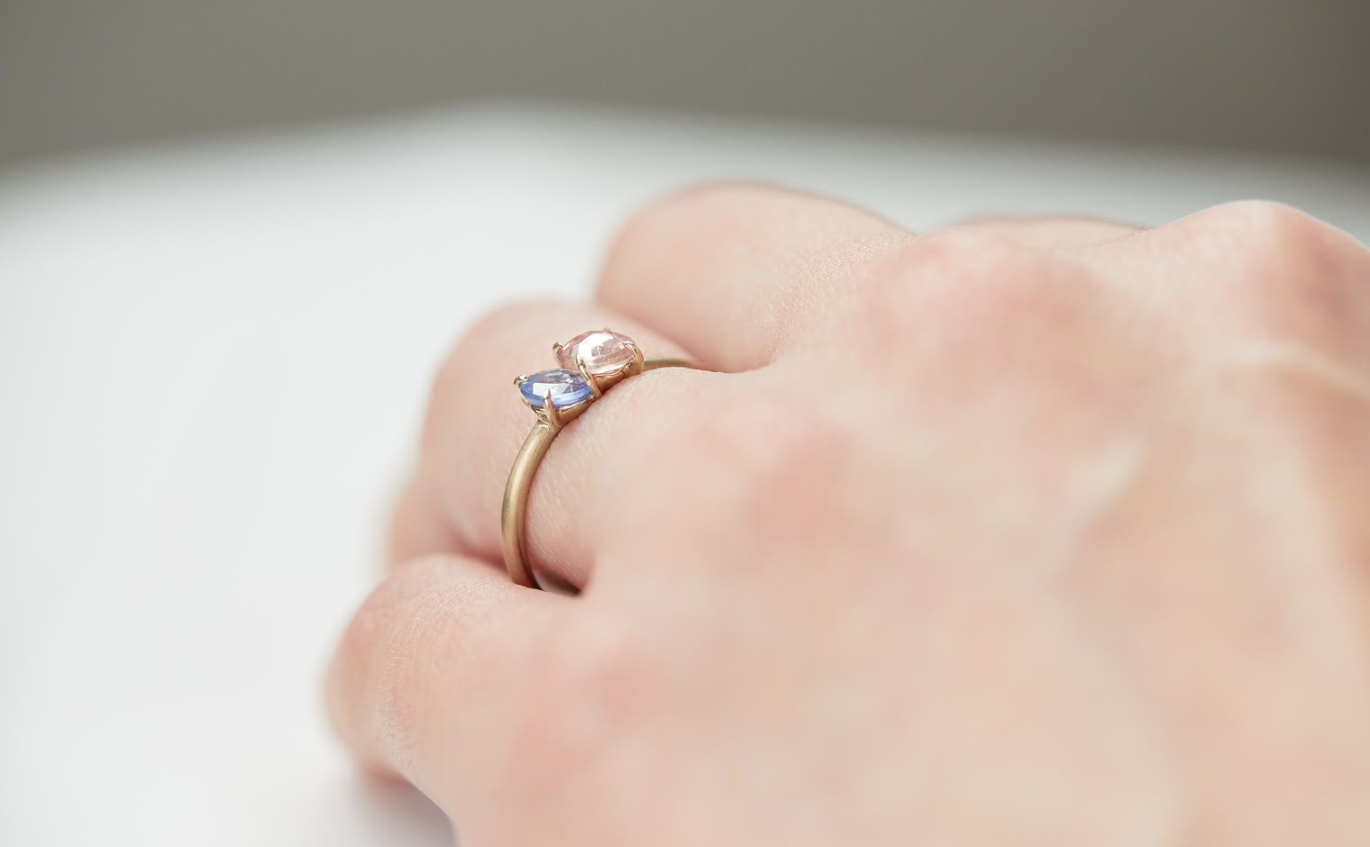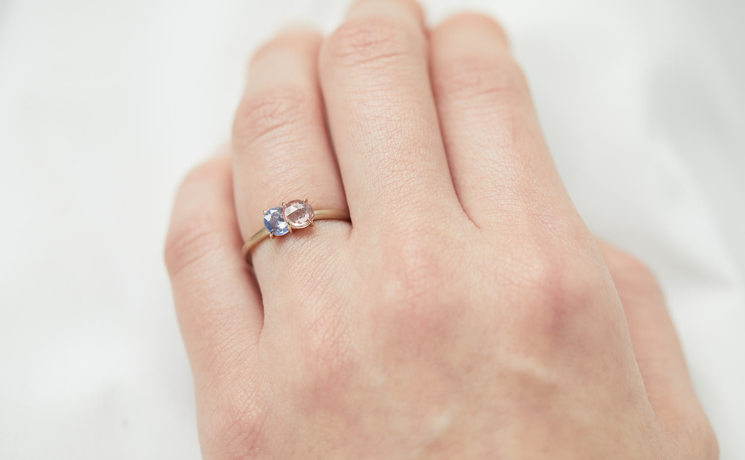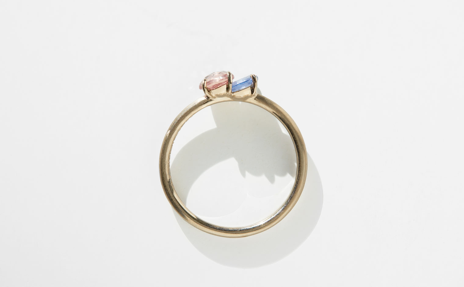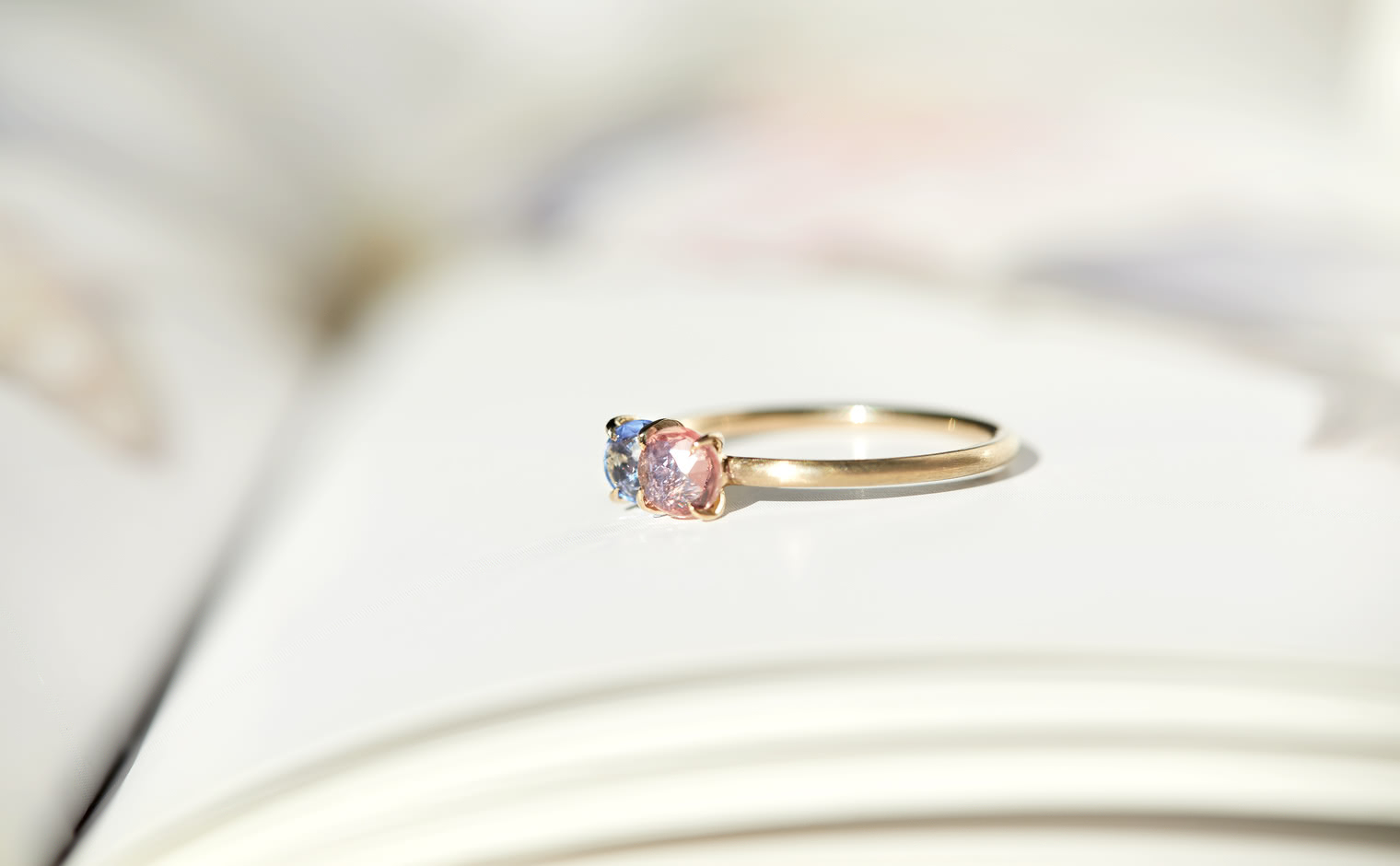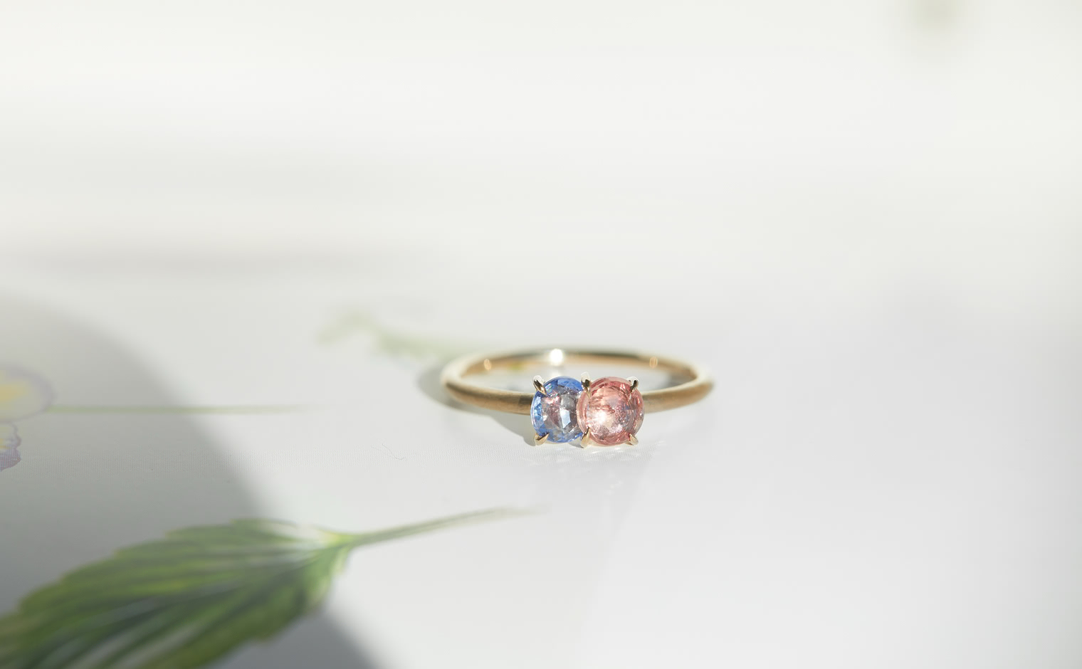 The Sweet Colors of a Setting Sky. Featuring the soft radiance of a round pink sapphire and the lustrous allure of a round purple sapphire as they nestled delicately on a semi-polished cylindrical beige gold band. The Calyx Ring-Pink & Purple Sapphire captures the essence of a mesmerizing horizon in its full radiance.