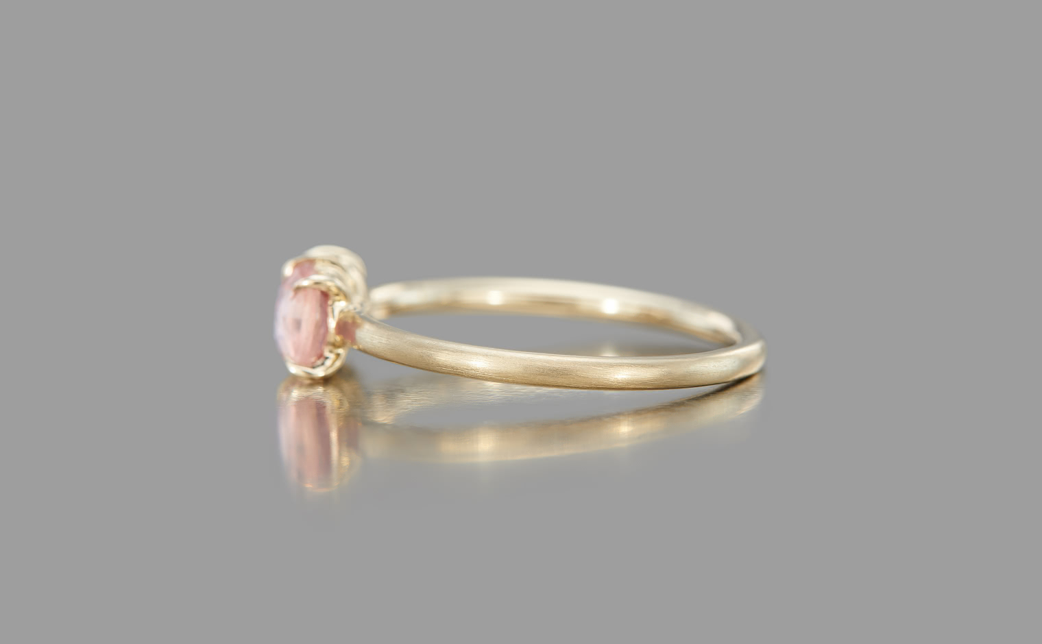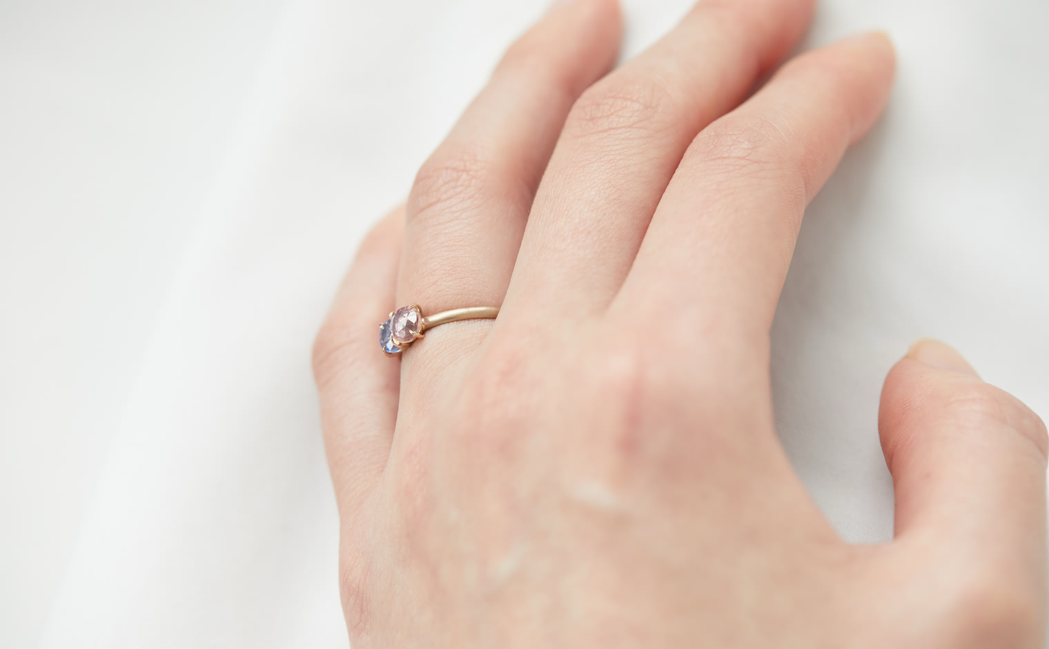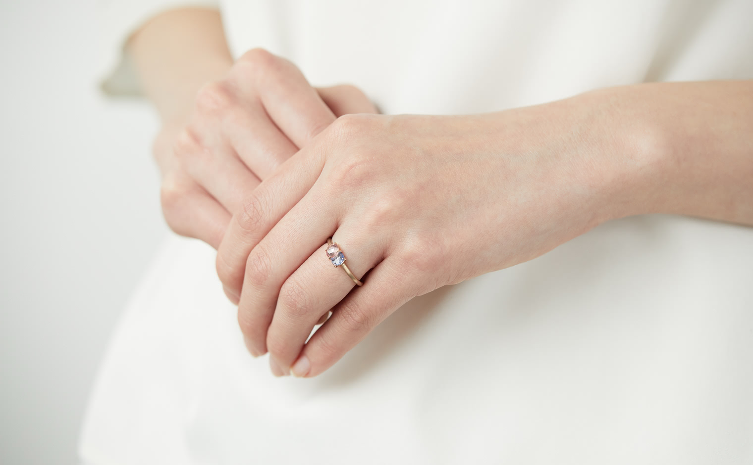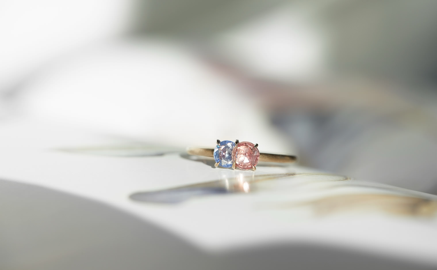 The Sweet Colors of a Setting Sky. Featuring the soft radiance of a round pink sapphire and the lustrous allure of a round purple sapphire as they nestled delicately on a semi-polished cylindrical beige gold band. The Calyx Ring-Pink & Purple Sapphire captures the essence of a mesmerizing horizon in its full radiance.