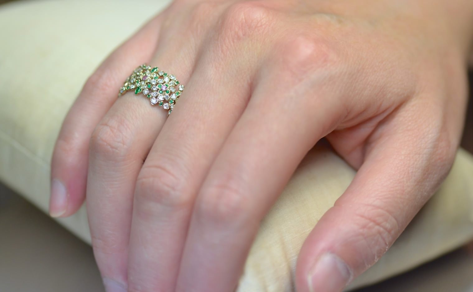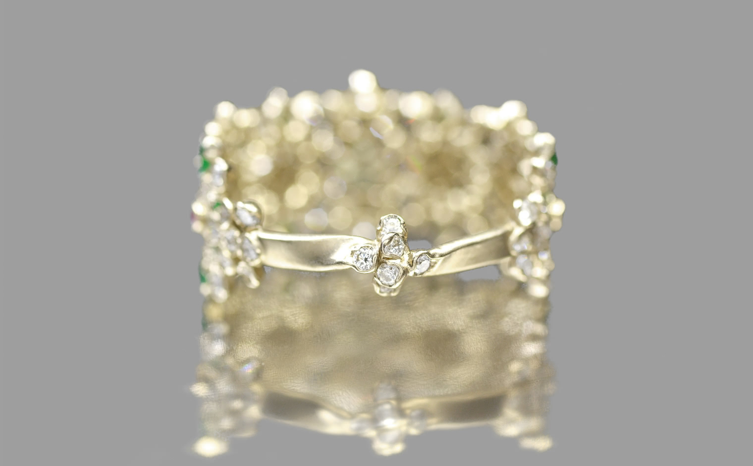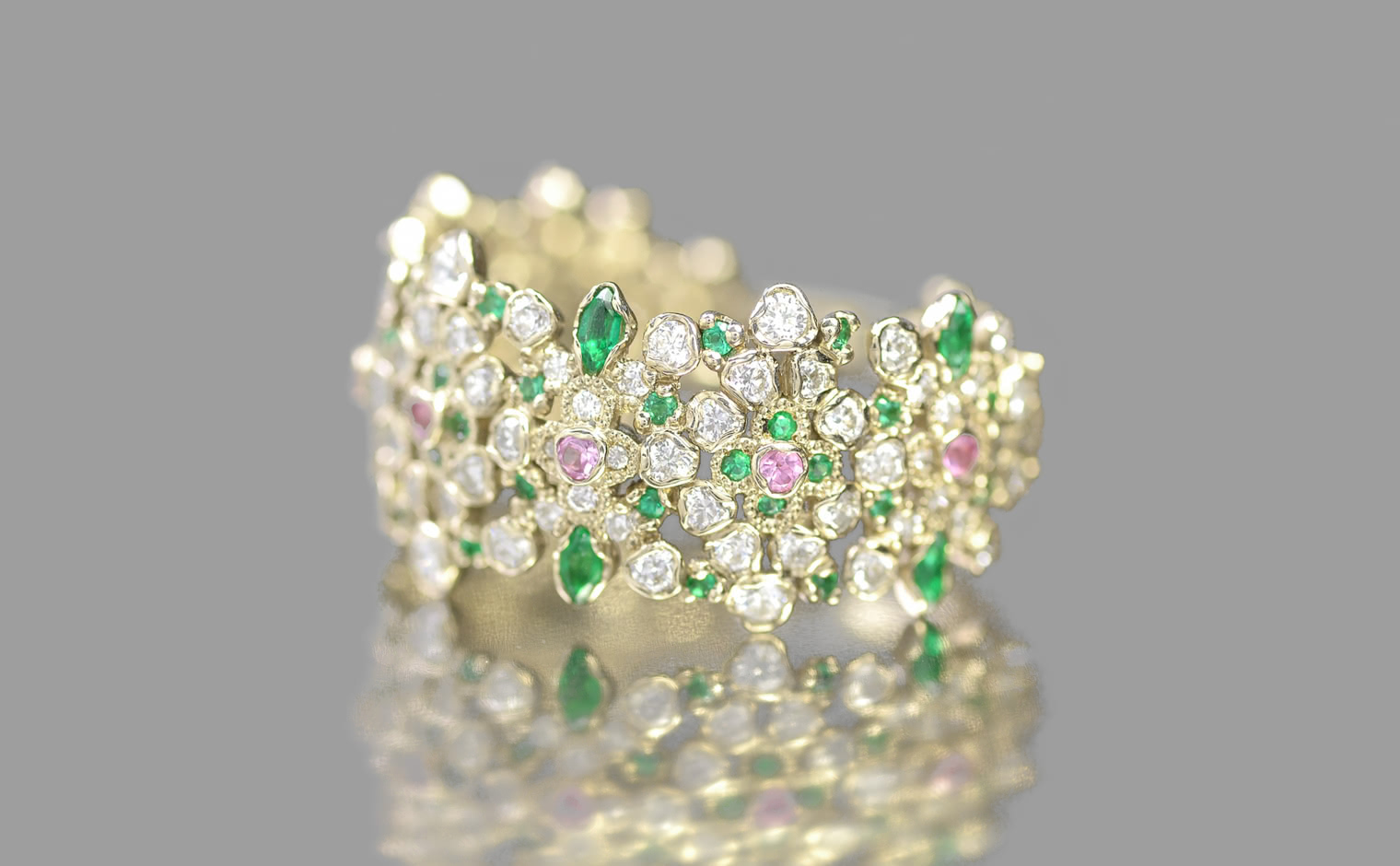 A sliver of Eden wrapped around your finger. The striking emeralds poised as the lush green leaves against the delicate petals of the white diamonds and the rosy buds of whimsical pink sapphires paint a picture of what the mystical garden must’ve been.