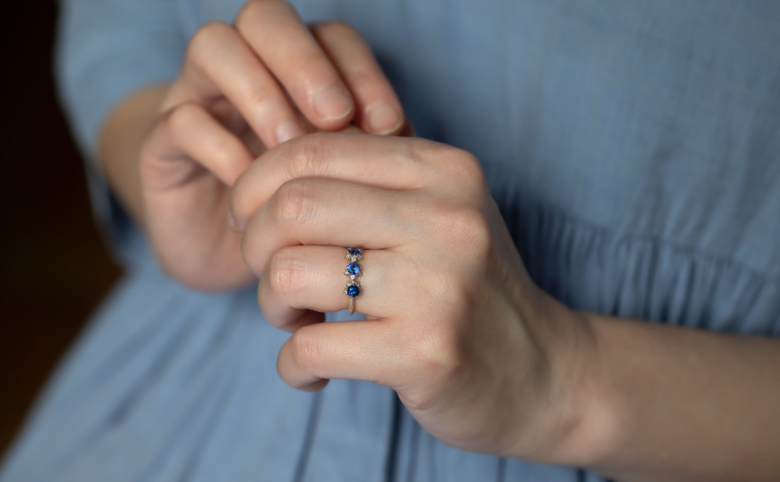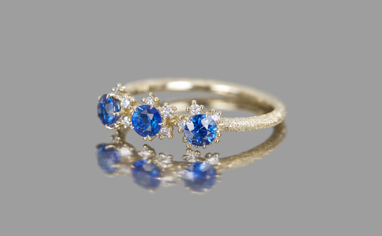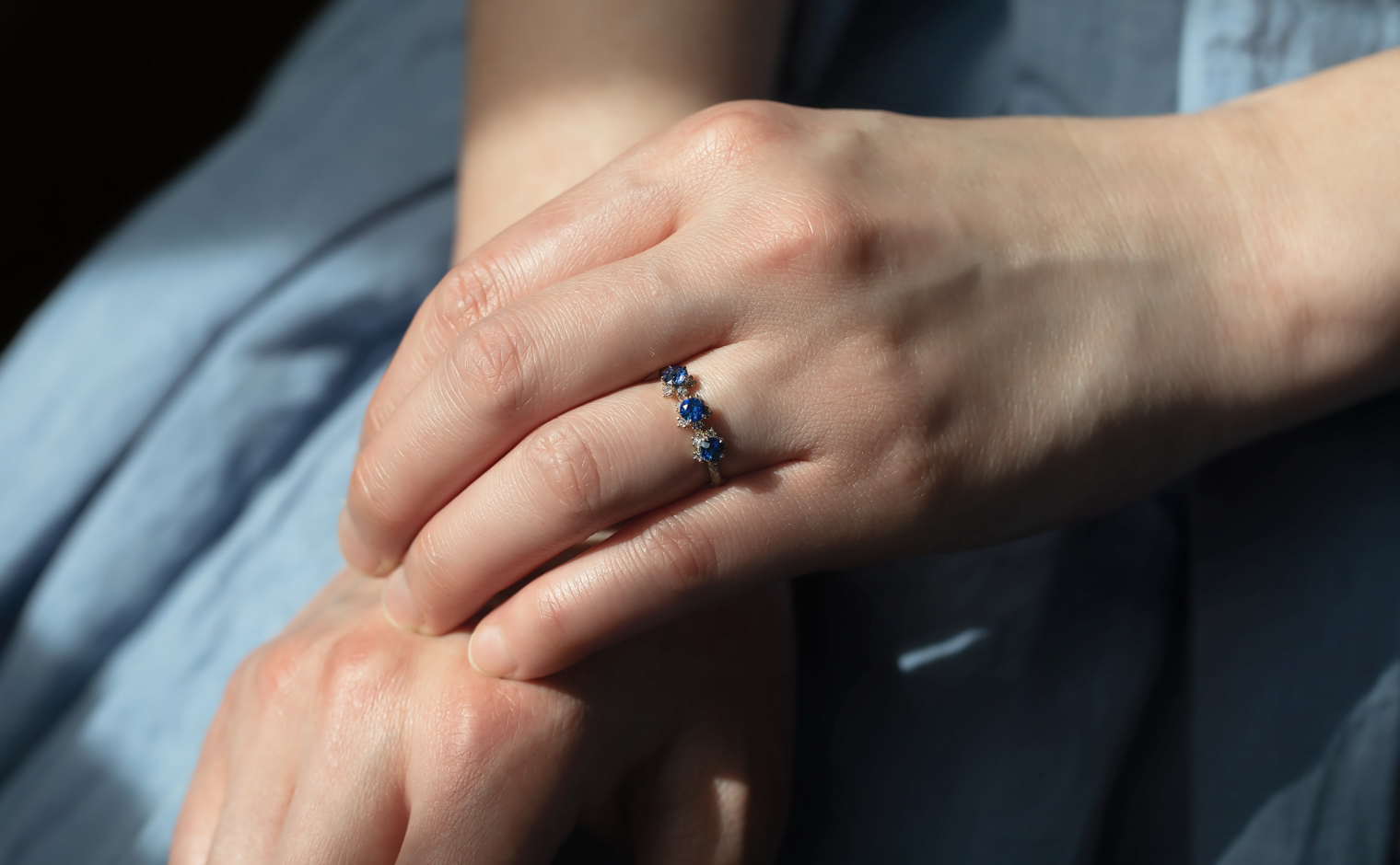 Sapphires in quiet brilliance, their light unfolding with gentle grace. The Cosmos Ring–Sapphire reflects timeless beauty, a refined expression of elegance and subtle artistry.