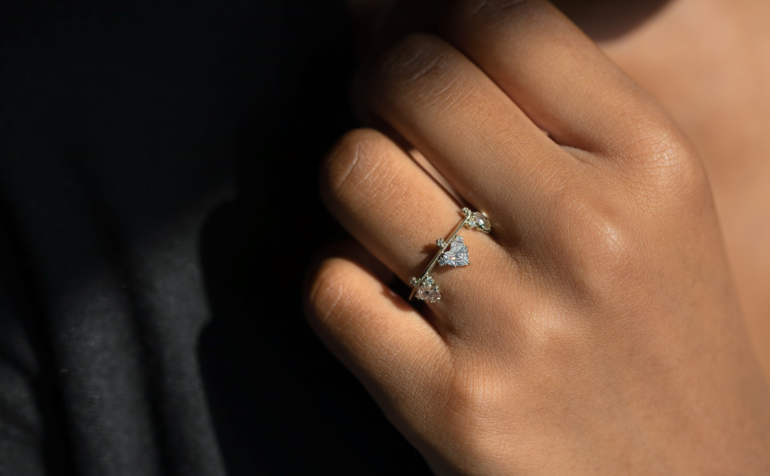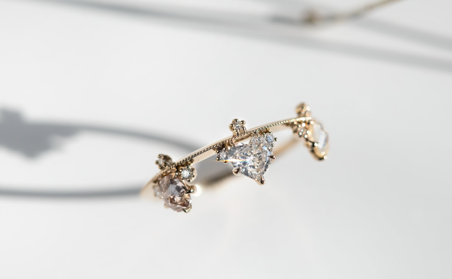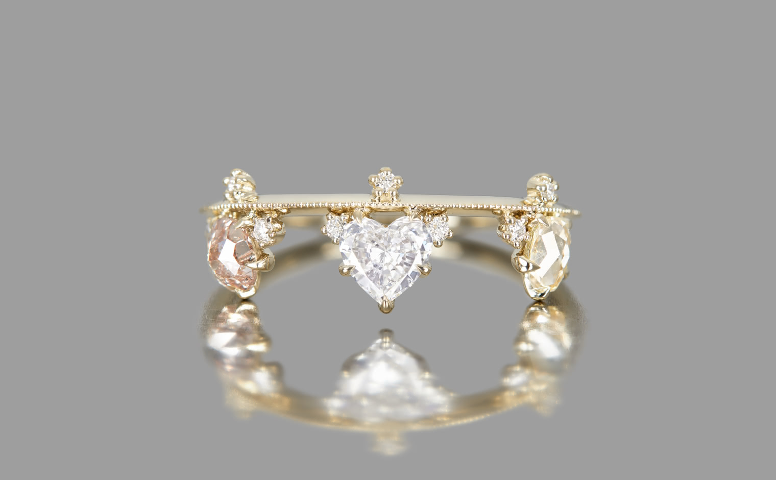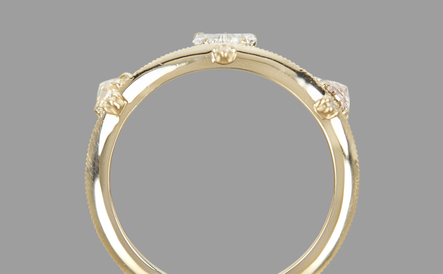 Set along a thin band of superbly blended gold and with two equally as striking round diamonds on either side, this band creates a silhouette fit to crown any finger. -