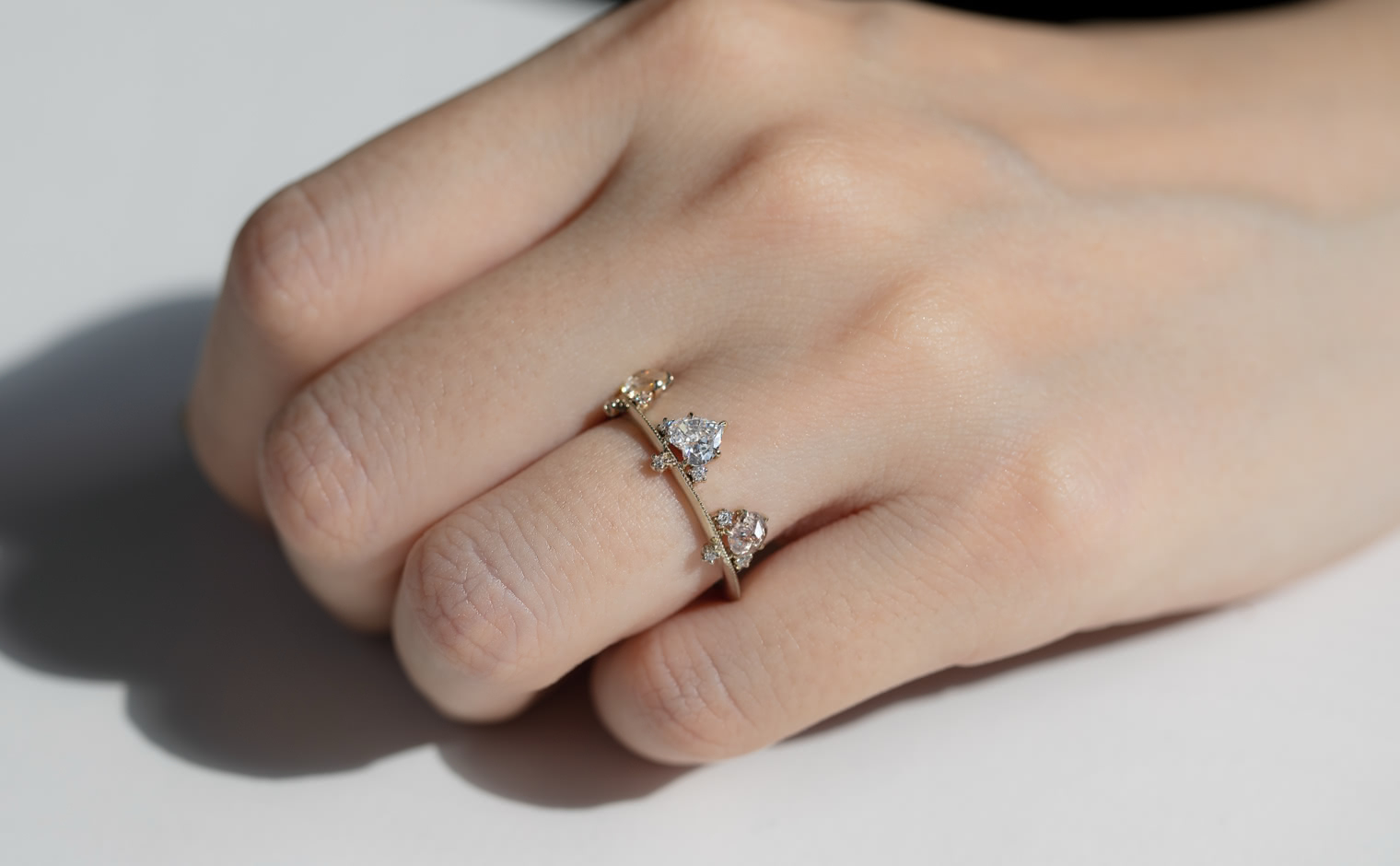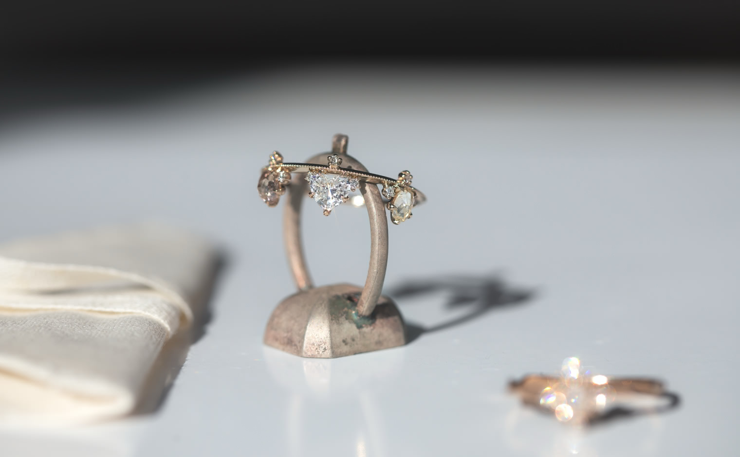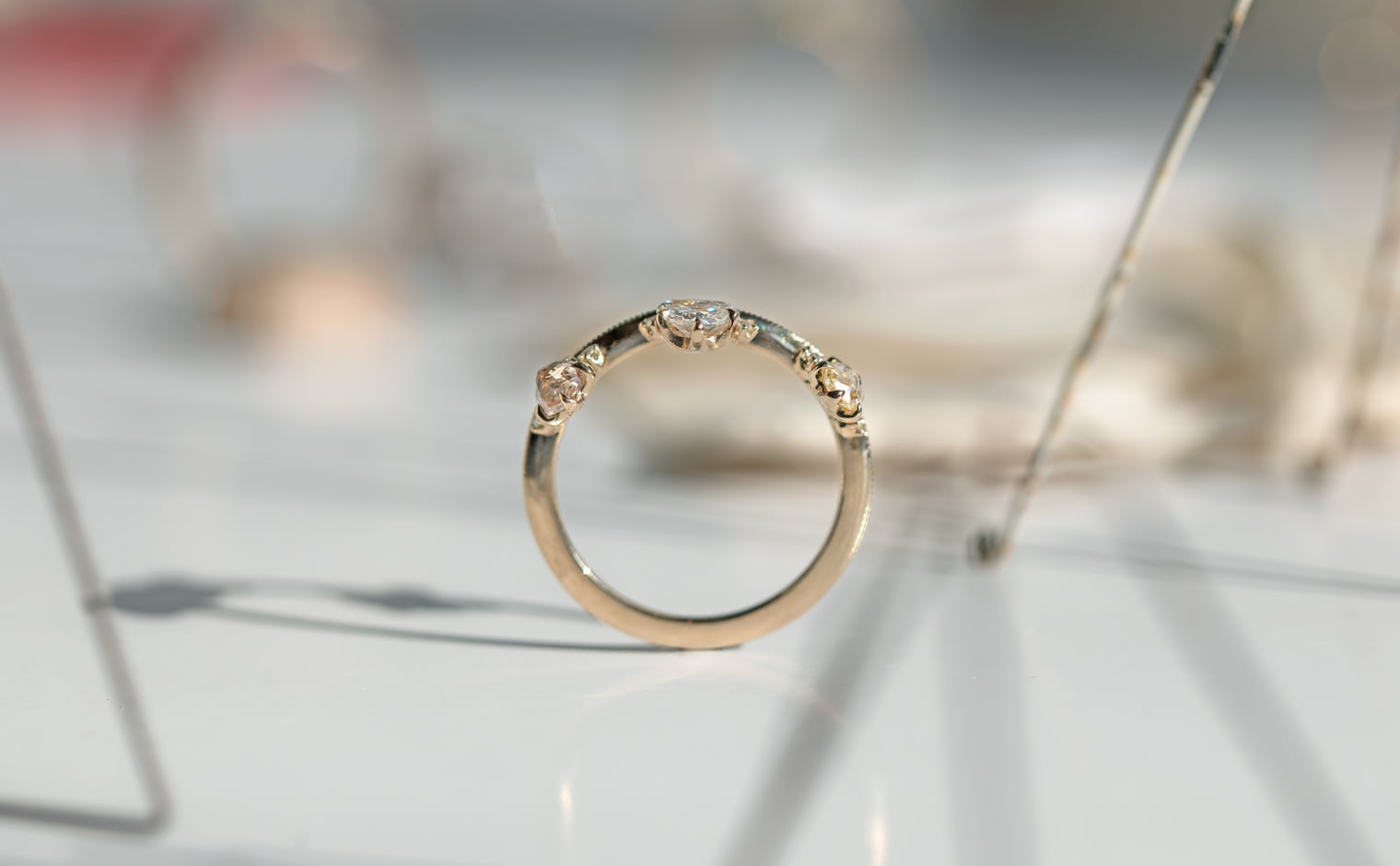 Set along a thin band of superbly blended gold and with two equally as striking round diamonds on either side, this band creates a silhouette fit to crown any finger. -