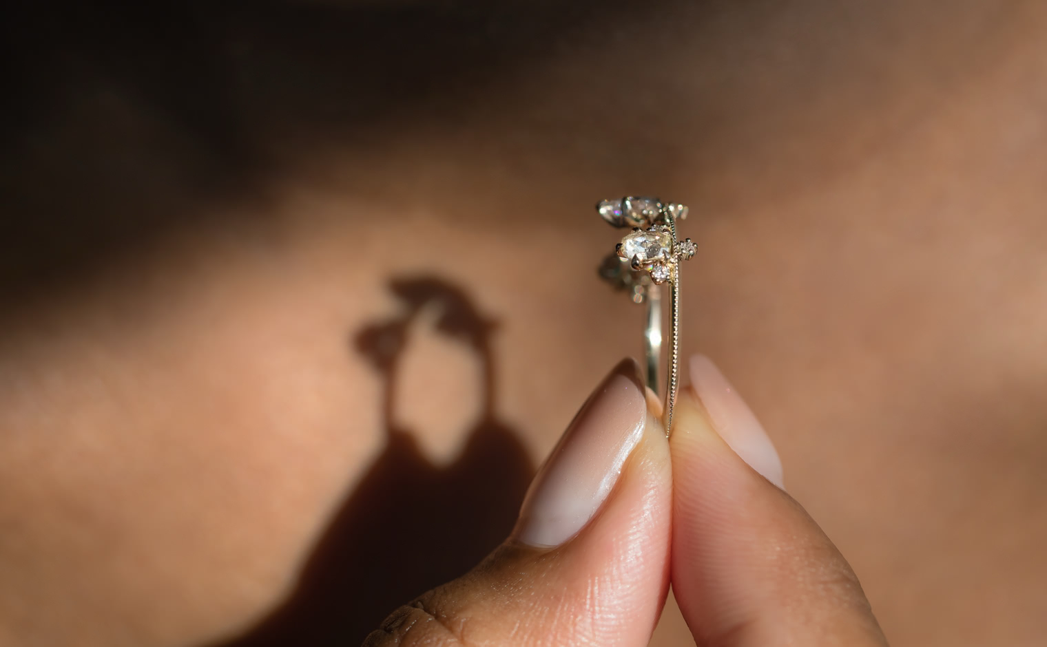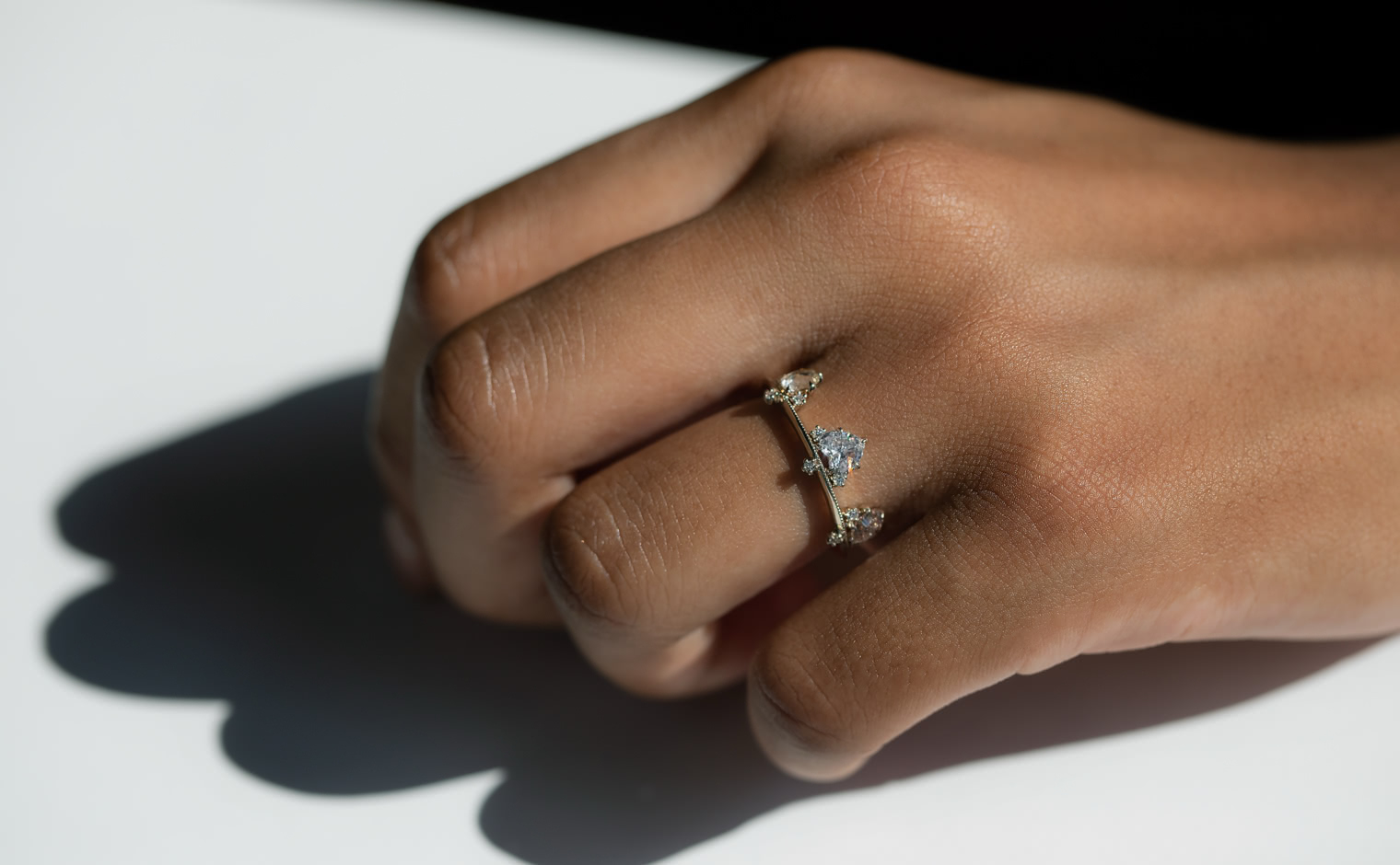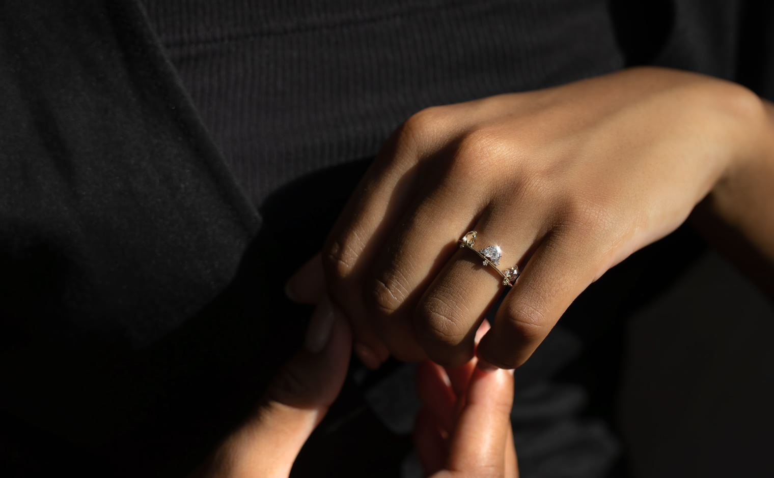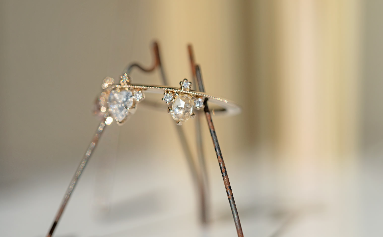 Set along a thin band of superbly blended gold and with two equally as striking round diamonds on either side, this band creates a silhouette fit to crown any finger. -