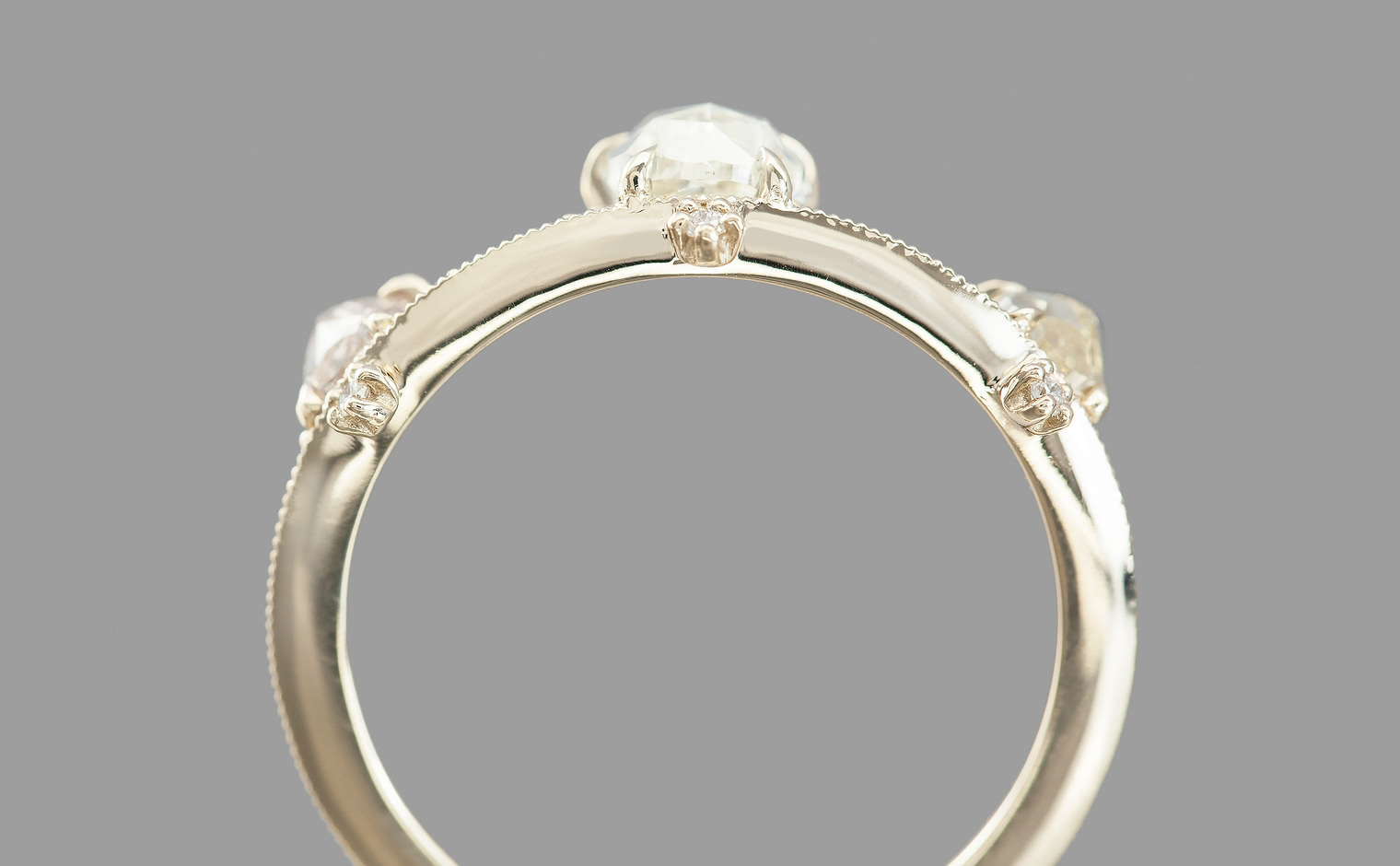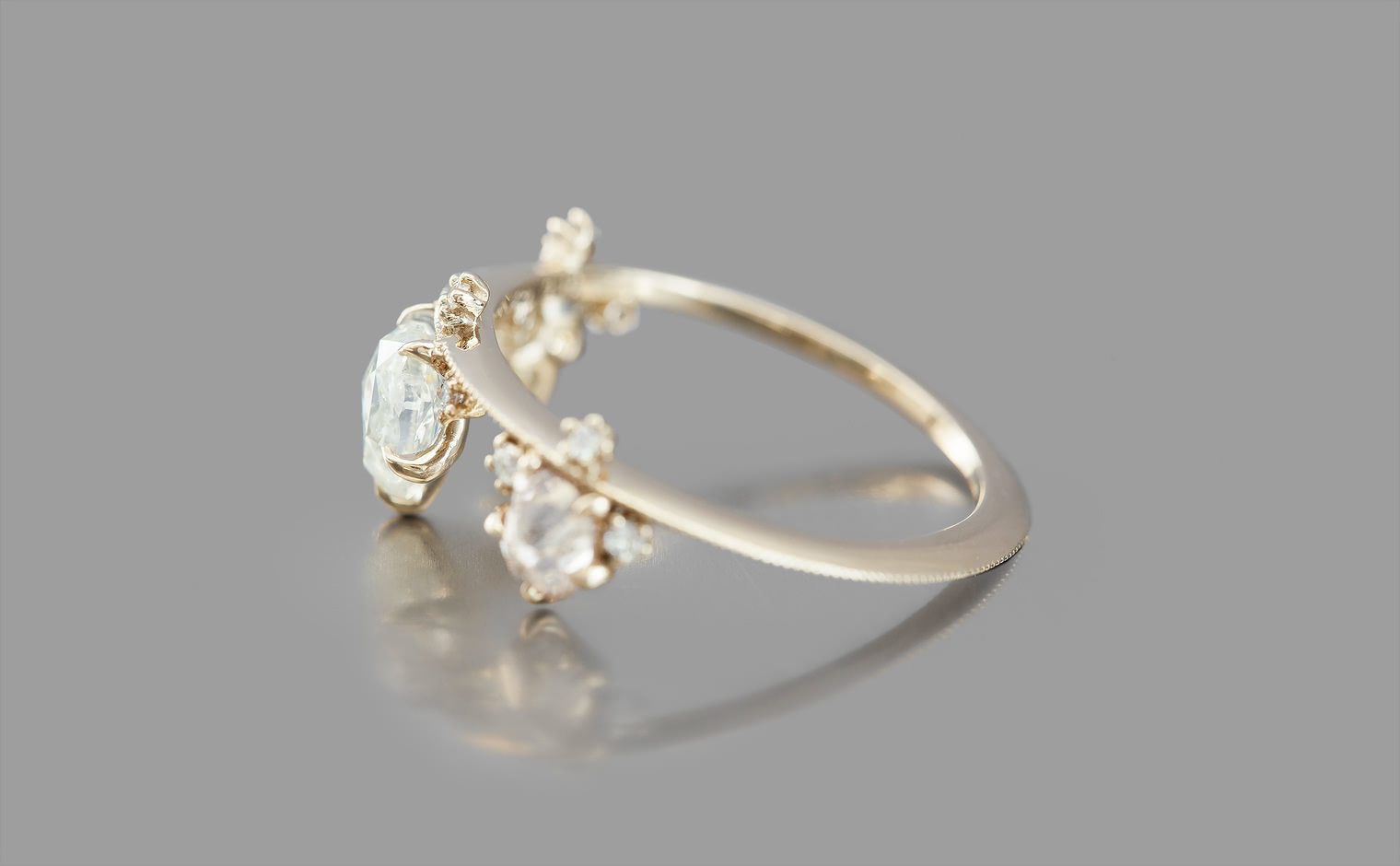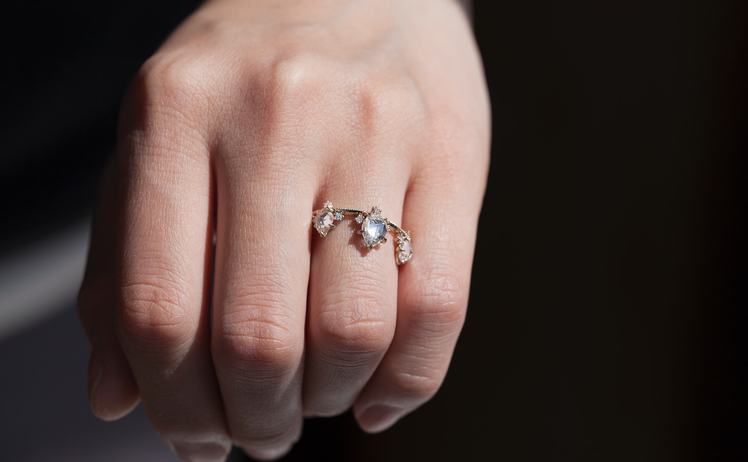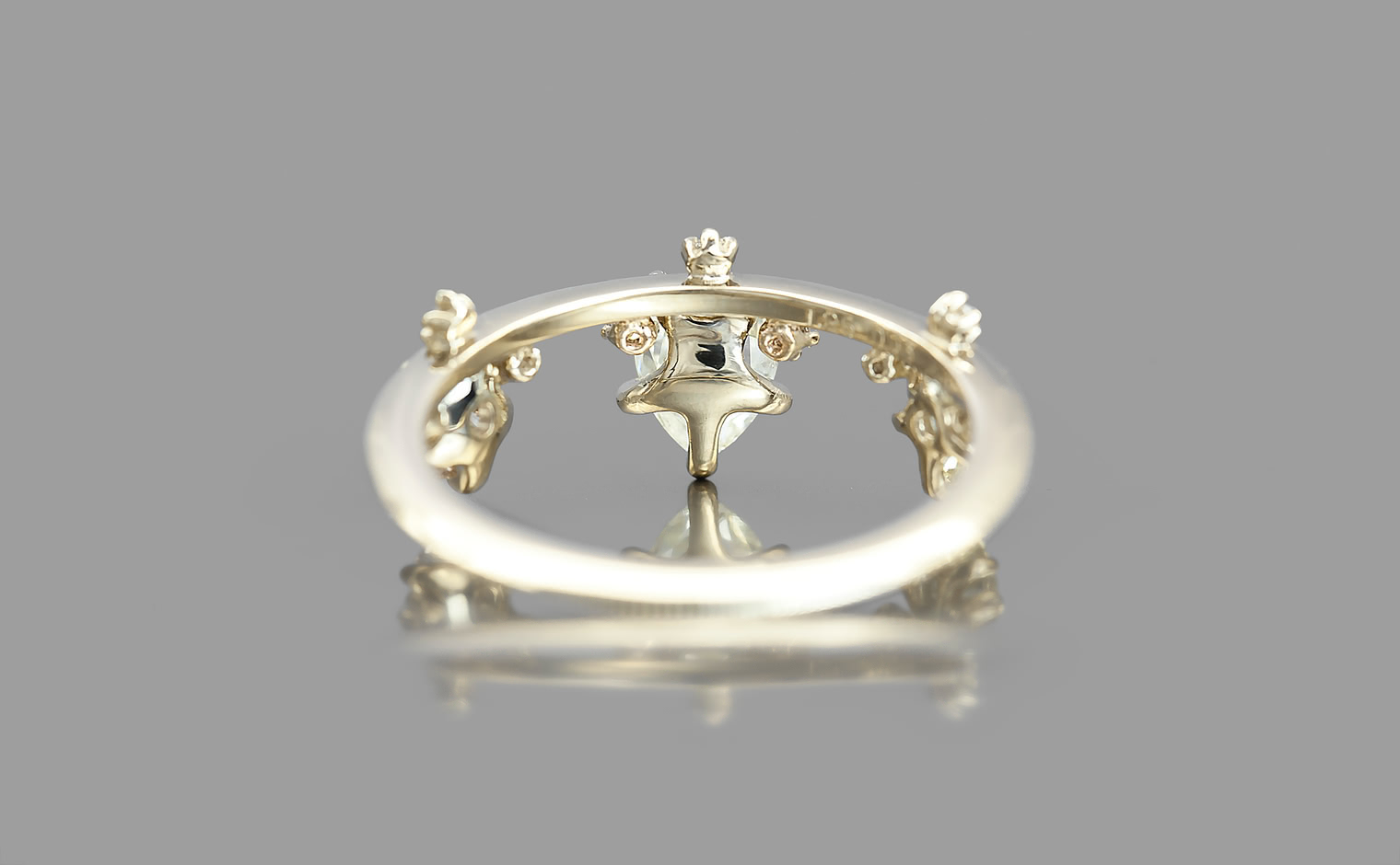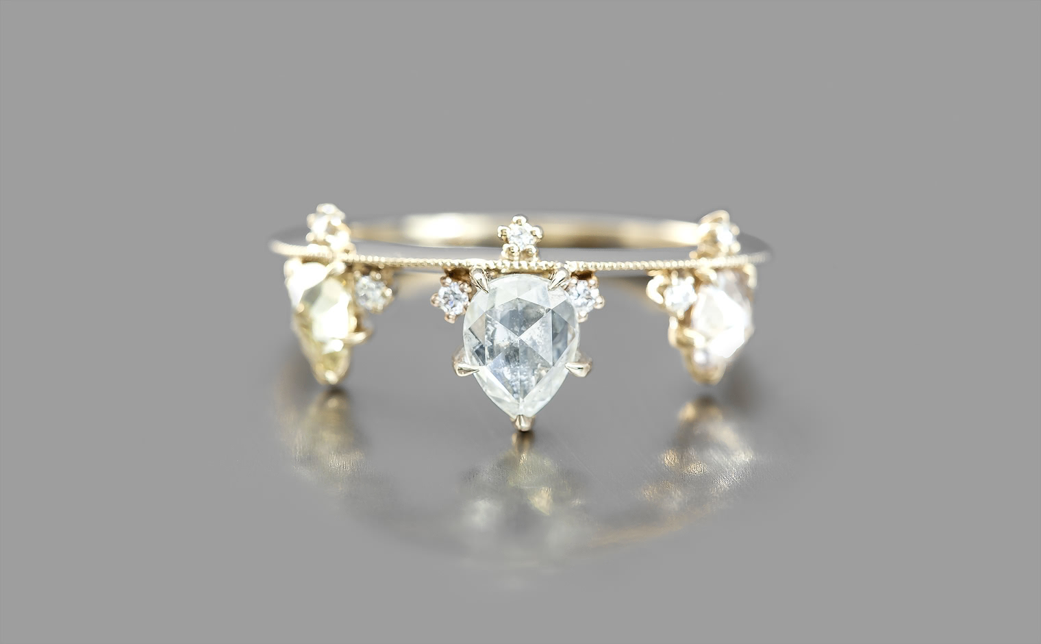 Set perched on top of an elegant, thin band of custom-blended gold, these pears seem to drip down across your finger while smaller brilliant diamonds sparkle and play with the light.