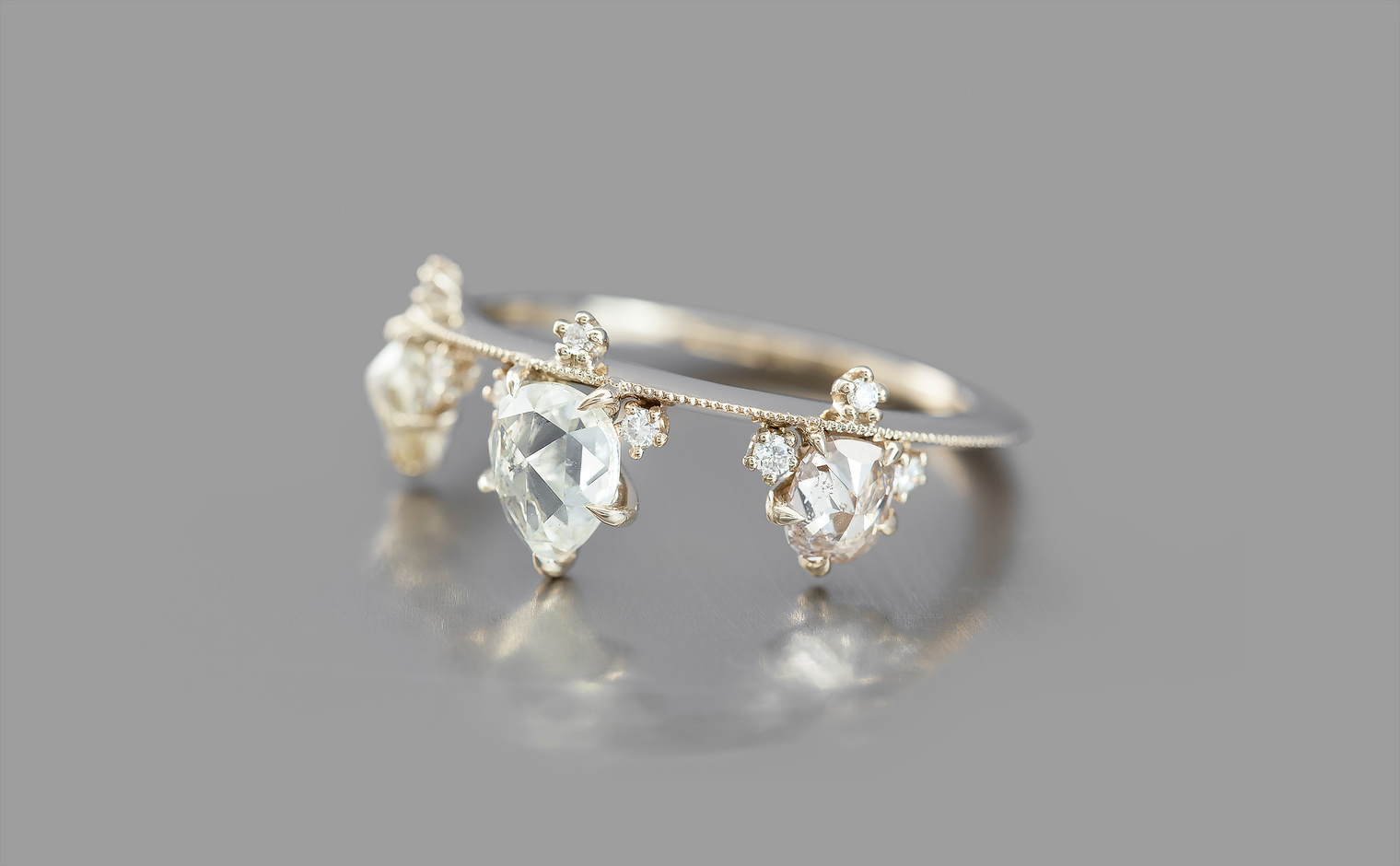A new twist on a classic kataoka favorite, this Crown ring debuts delicious rose cut pear diamonds in lieu of traditional rounds.