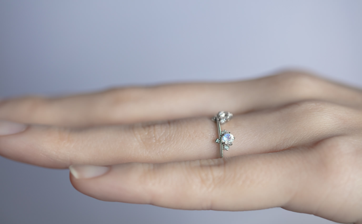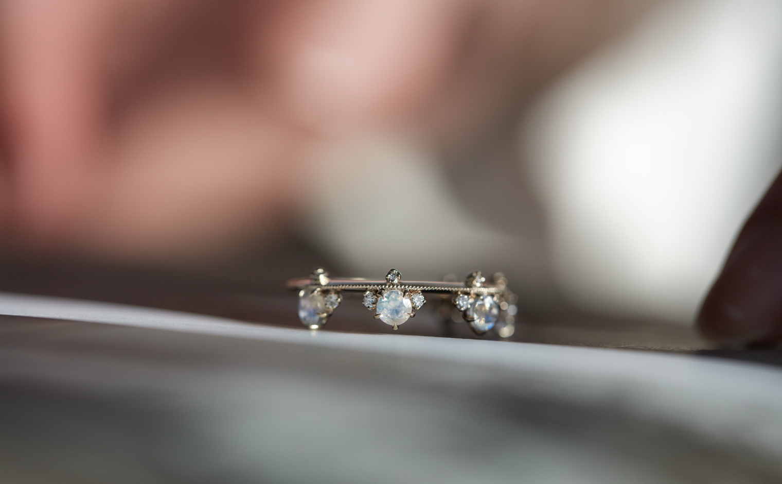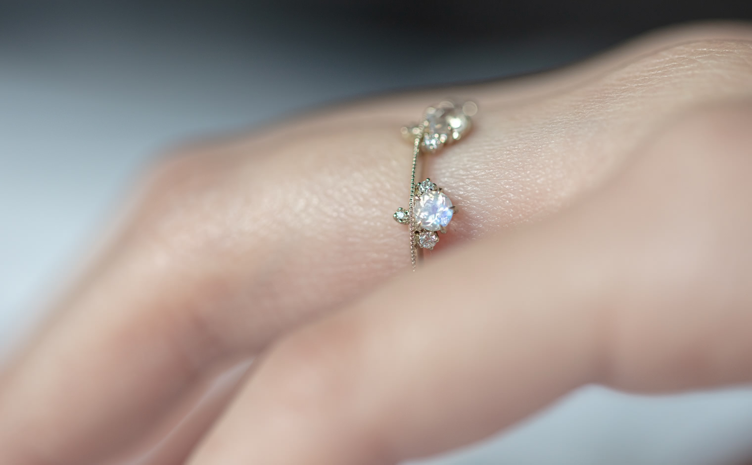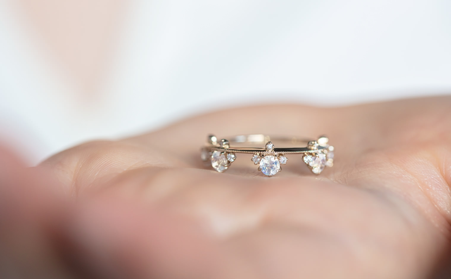 Set perched on top of an elegant, thin band of your choice of custom-blended metal, these Rainbow Moonstones seem to glow from within across your finger while smaller brilliant diamonds sparkle and play with the light. -